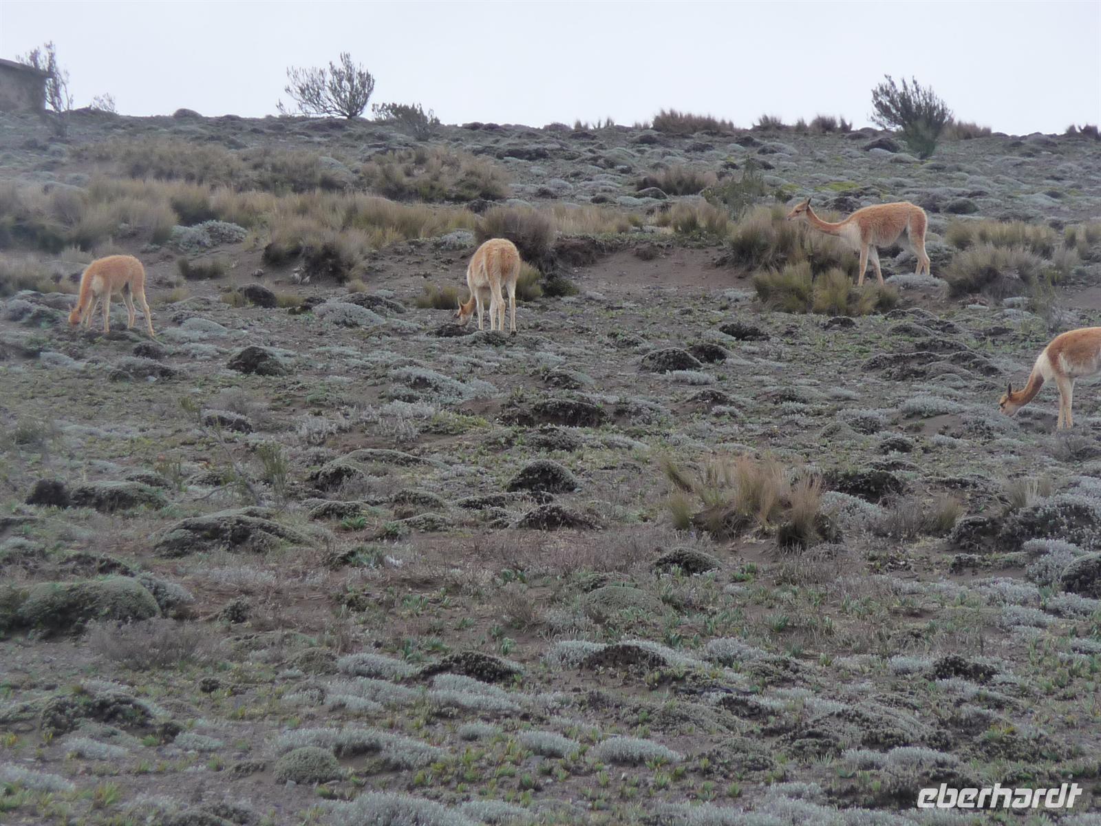 Ab 3.000 m haben wir viele Vicunas gesehen, in wunderschöner Landschaft. Sie mögen die Höhe und auch das Klima. 80 m von unserem Bus entfernt graste eine Lama-Art, die zur Familie der Kamele gehören. Ihr Fell ist das Feinste der Welt, es ist noch weicher als Kaschmir.
