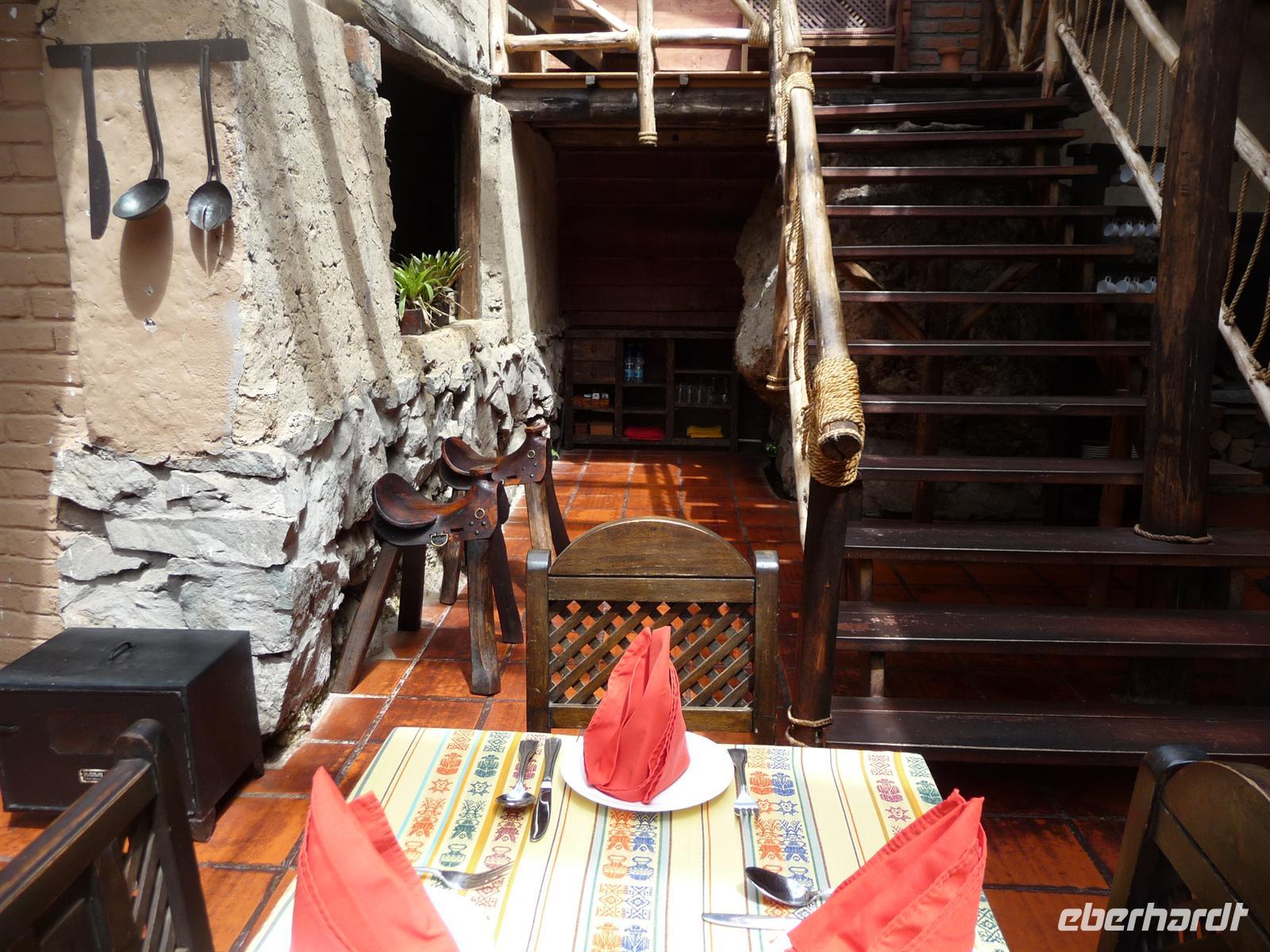 Da wir kein Risiko wegen dem Vulkanausbruch eingehen wollten, fuhren wir nach Patate, in die gediegene Hacienda Leito Resort. Sie ist landschaftlich sehr schön gelegen, restaurierte Zimmer, alle mit Holzdielen, schönem Bad und Kamin, alles liebevoll eingerichtet. Zum Abendessen: Tomatensuppe, Hähnchen, Reis, Gemüse und Sternfrucht als Dessert, alles super lecker.