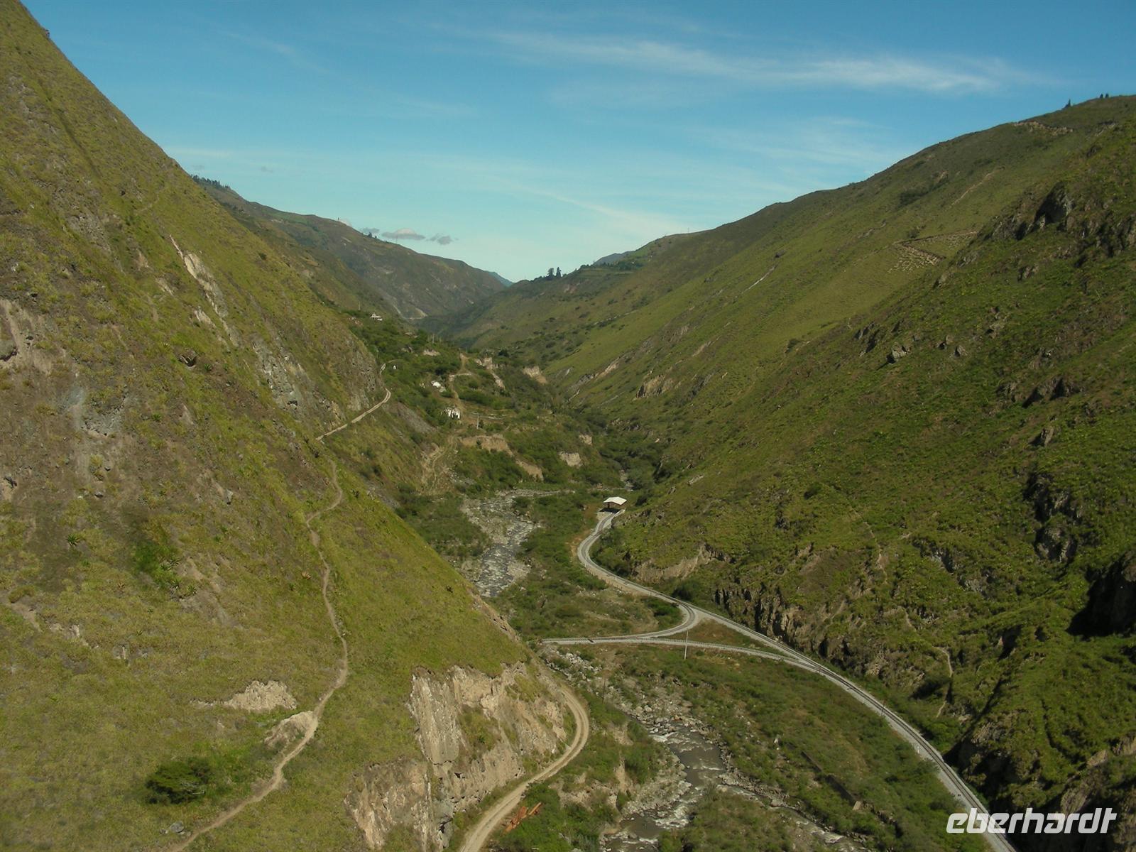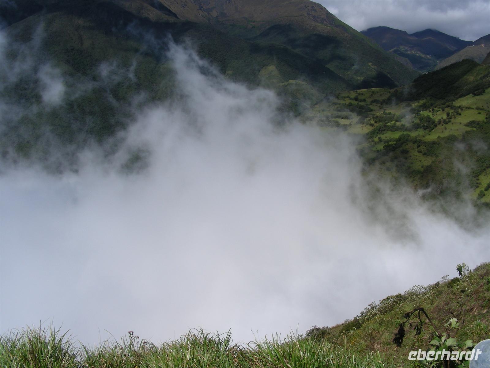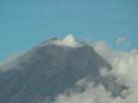 Anschließeend fahren wir durch Salcedo nach Banos und weiter zur Seilbahn. Der Vulkan Tungarahua ist teilweise frei sichtbar. Wir sehen den langsamen Aufbau einer Wasserdampferuption. Vulkanasche ist noch überall zu sehen. Wir überqueren eine Brücke, die gestern (!) erst fertig geworden ist - sie war beim Ausbruch vor 3 Wochen teilweise zerstört worden. An der Seilbahn fahren wir mit Freddy über den Pastaza und anschließend zurück nach Banos. Wir gehen dann noch in die heißen Bäder, die schon die Inkas nutzen. Warum ein Teil der Bäder „Kochtopf" heißt, war schnell klar: 58°C sind wirklich gewöhnungsbedürftig, aber auch entspannend.