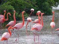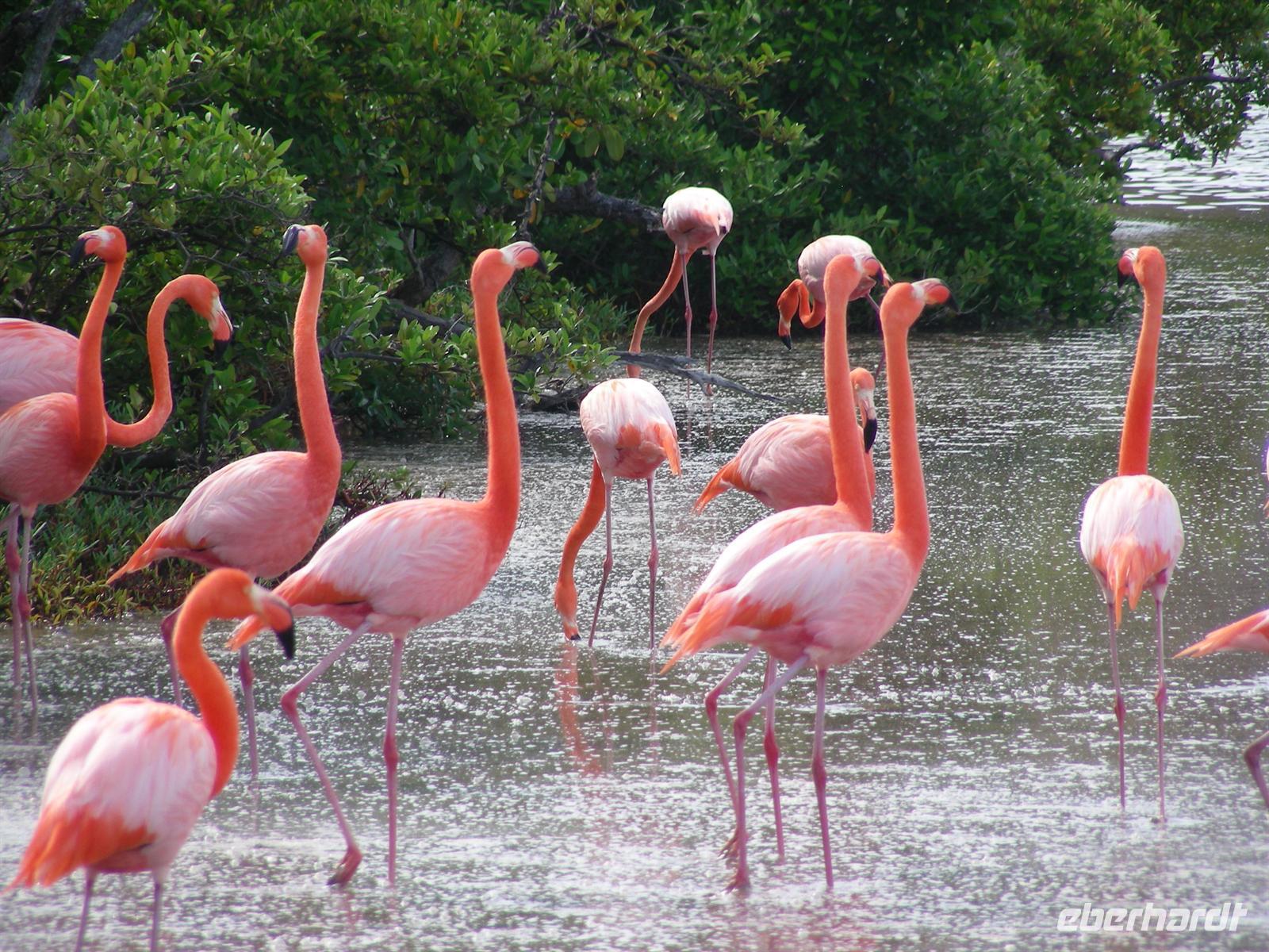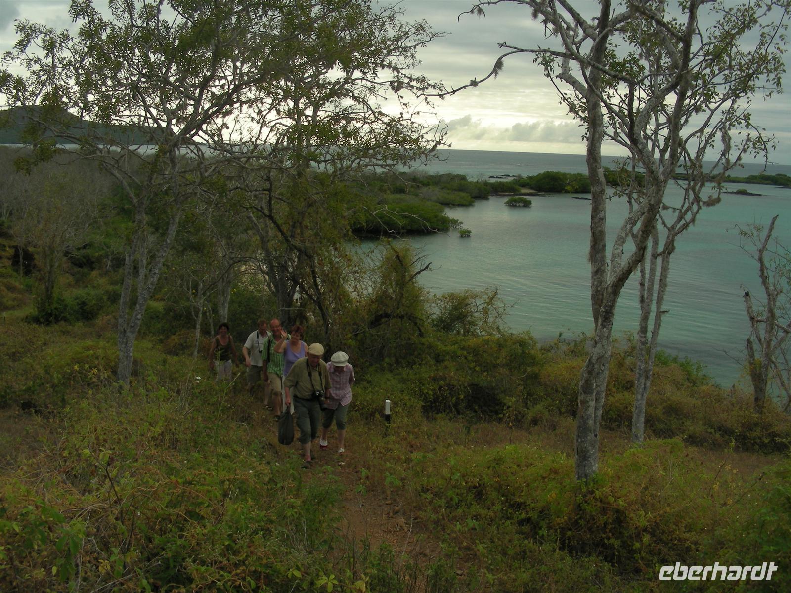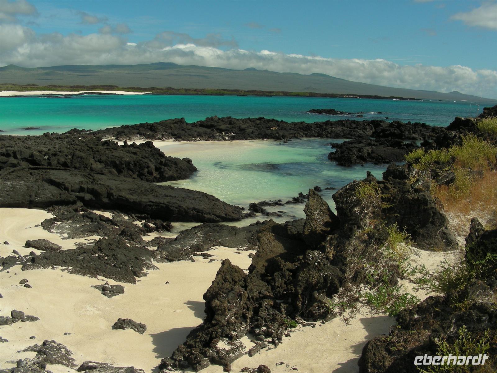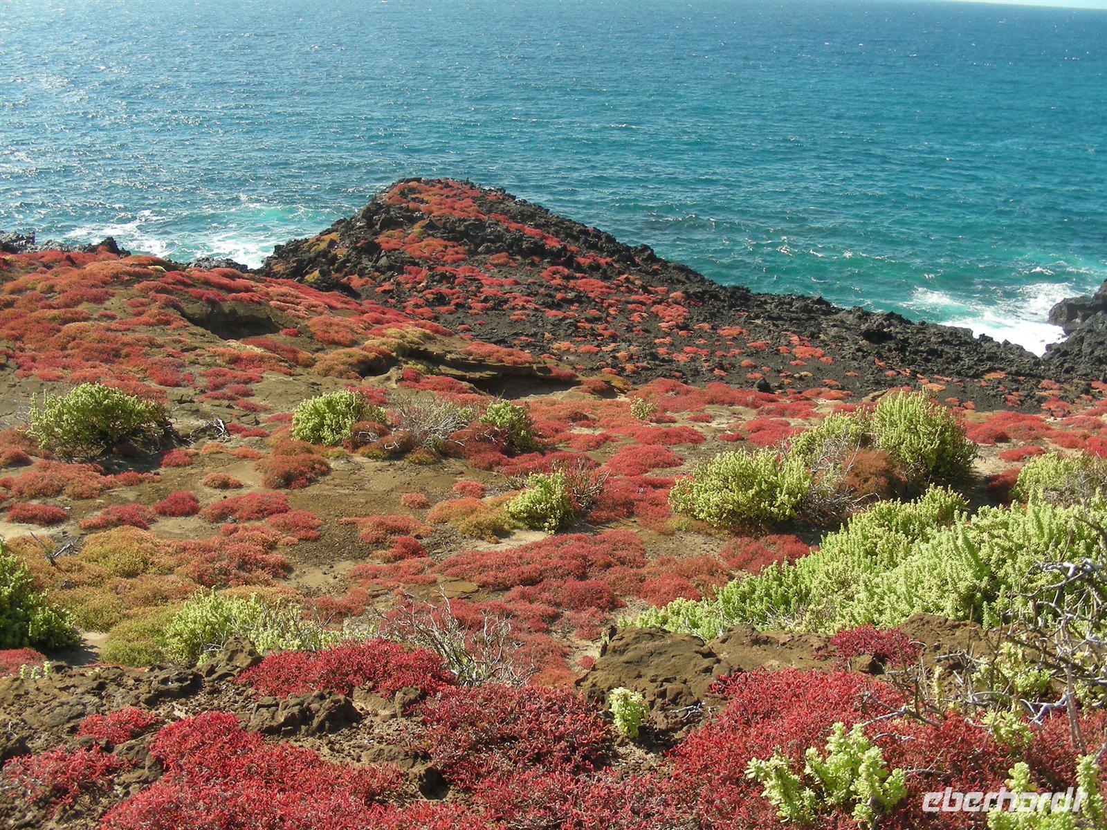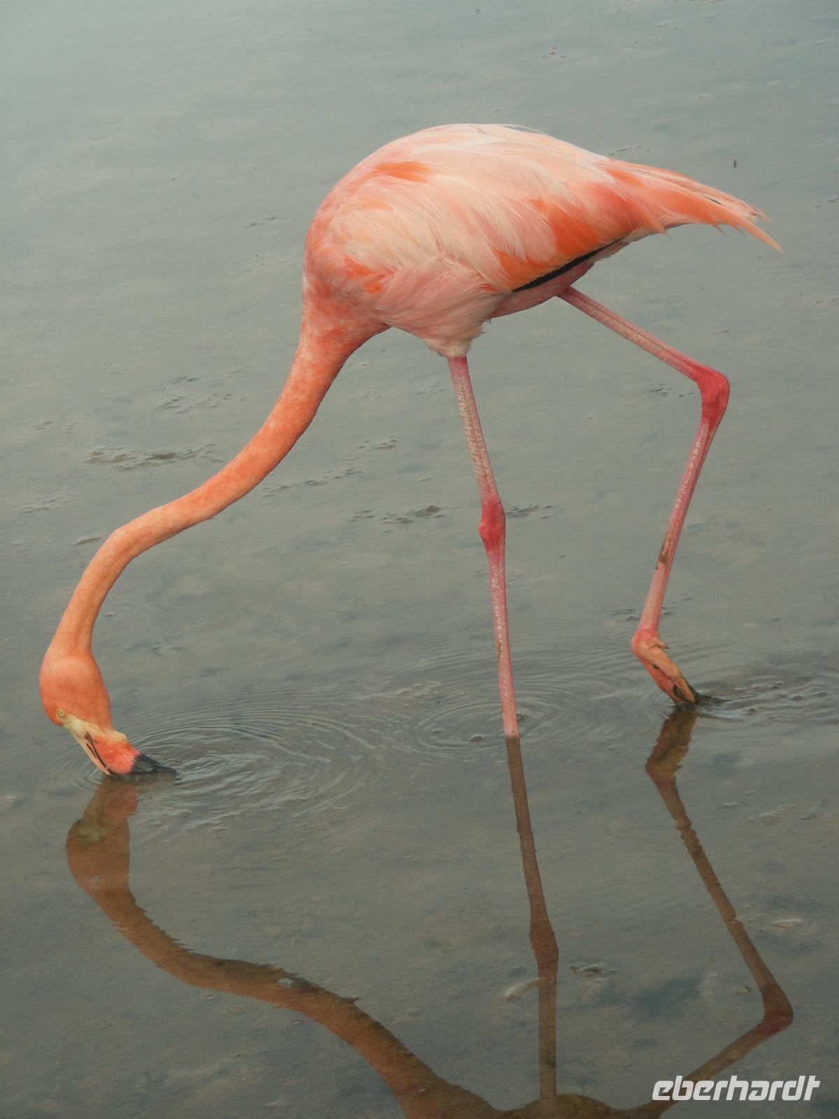 In Punta Cormorant angekommen, booten wir um 07.30 Uhr aus. Direkt danach fahren wir mit der Panga an einen fressenden Schwarm von Wellenläufern heran, den wir ausgibig beobachten, bevor wir wieder an Land gehen. Zuerst sehen wir in der Lagune 43 Flamingos, davon 4 bis in 1,5 m Abstand. Wir finden die endemischen Pflanzen Scalesia villosa und Lecocarpus sowie gute Nolana Bestände. Schwarze Mangroven. Am 2. Strand treffen wir auf Stachelrochen und Meeresschildkröten. Zurück in der Lagune finden wir 28 (!) Flamingos in 2 - 5 m Abstand!!! Um 9.30 Uhr gehen wir an Bord zurück und verholen nach Champion, wo wir zu dritt schnorcheln. Die Sichttiefe beträgt hier ca. 50 - 60 m. Es war unglaublich: Riesige "Fischwände" unter Wasser, Schildkröten, Barakudas und Tölpel, die vor uns ins Meer stoßen und jagen. Es herrscht sehr starke Strömung, die aber zu meistern ist. Nach einem einem traumhaften Schnorchelgang kehren wir 11.30 Uhr an Bord zurück, stärken uns und verholen zur Postoffice Bay, wo wir um 13.45 Uhr