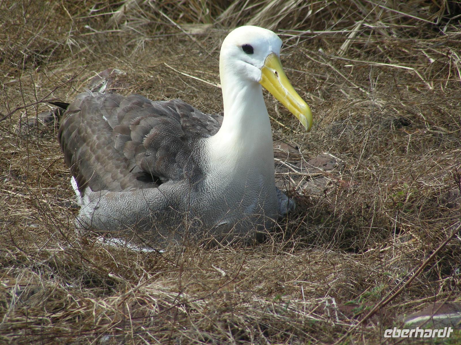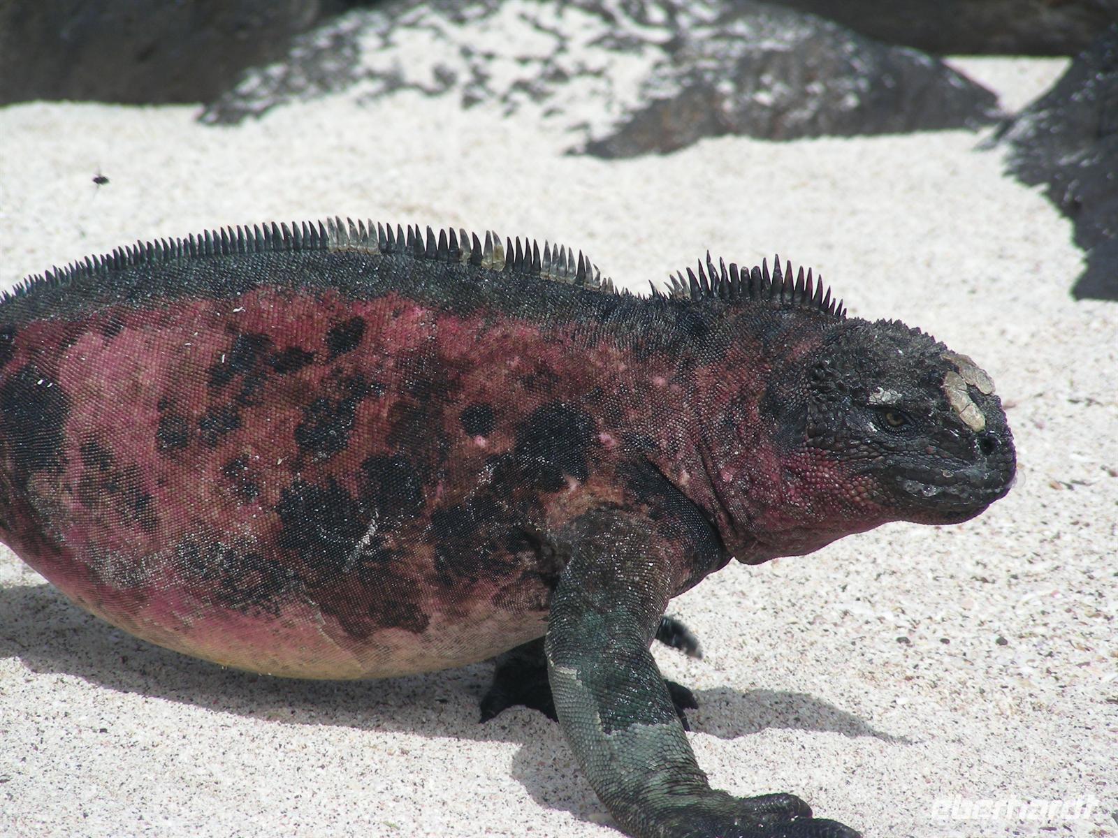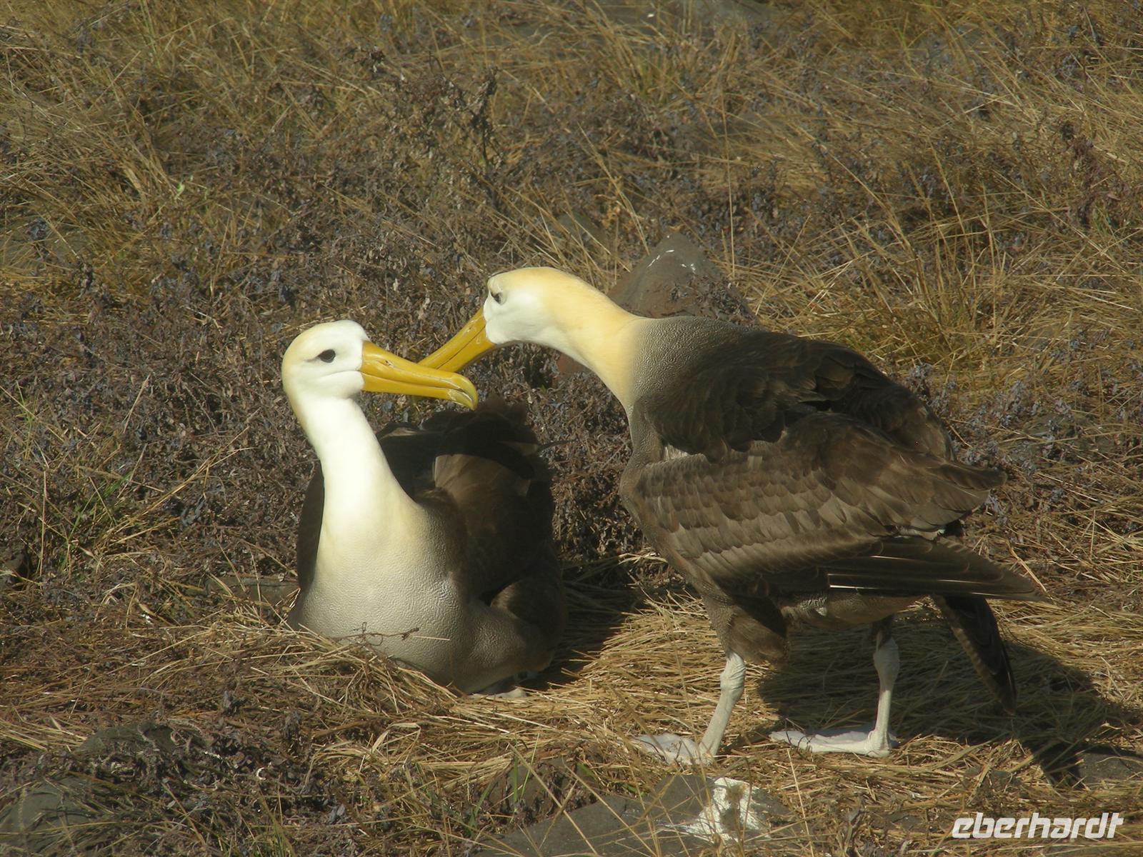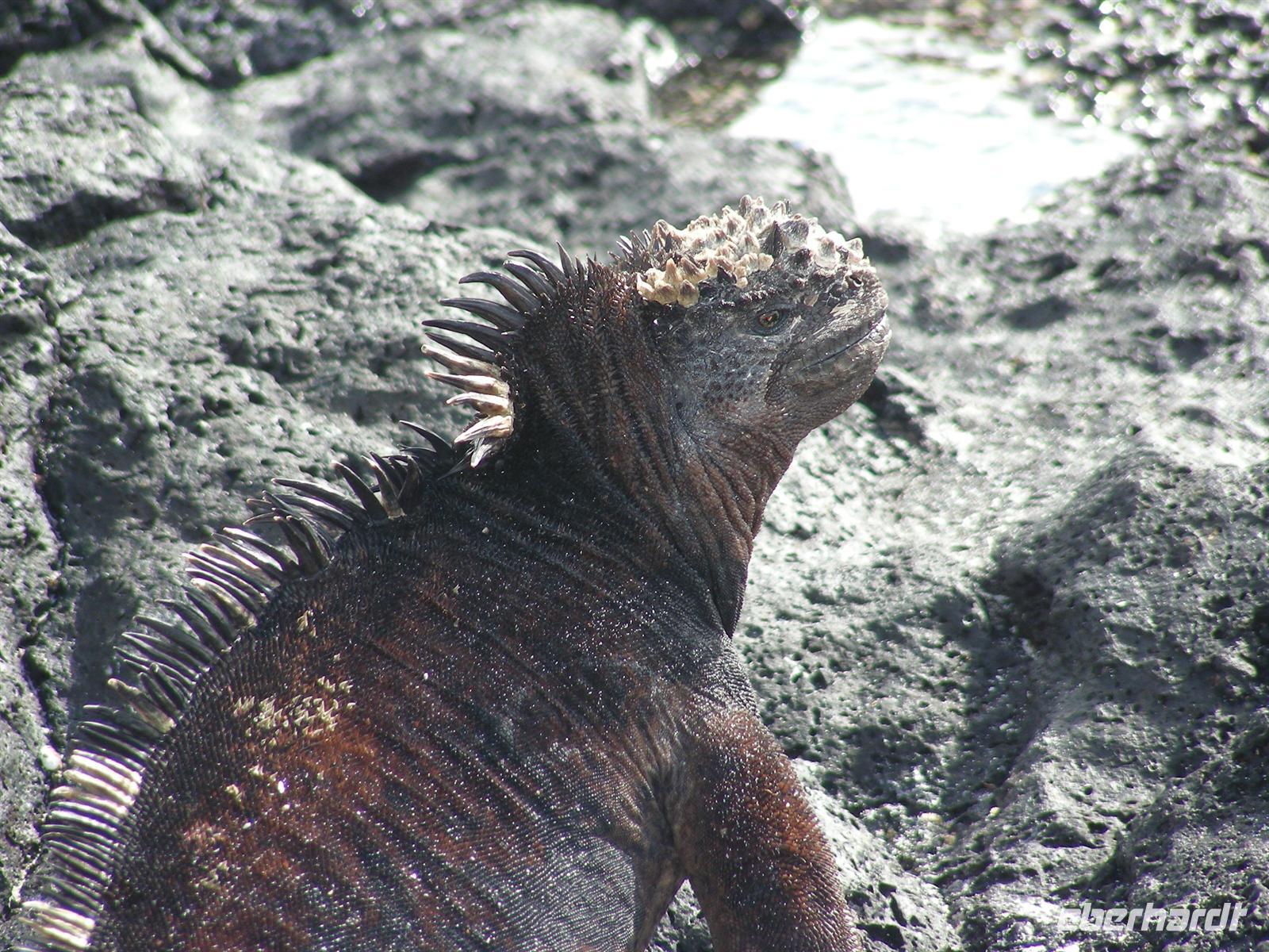 Um 13.45 booten wir in Punta Suarez aus und starten einen Gang durch das Innere. Viele rote Meerechsen, Seelöwen, eine Schlange (!), ca. 100 Albatrosse am Boden, 3 Eier von Albatrossen, Blaufuß- und Nazcatölpel, Tropikvögel, Gabelschwanzmöwen, Audubon Sturmtaucher, Wellenläufer, Galapagosbussard bei der Paarung (!) ca. 7 m vor uns und eine Espaniola Lavaechse. Die Blowhole ist aufgrund der starken Dünung sehr intensiv. Ein traumhafter Landgang. Auch hier sind die Auswirkungen des Tsunamis auffallend, besonders auf die Seelöwen: sehr wenige und kaum adulte Bullen. Skelette und Mumien befinden sich auch hier hinter freigespülten Bereichen am Strand.