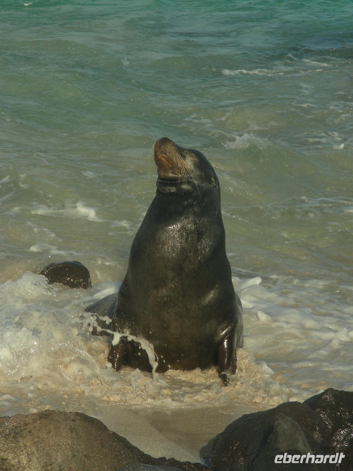 Nach einer rauen Überfahrt kommen wir in Espaniola an. Beide Pangas - oh Wunder! - sind wieder intakt, sodass wir um 7.30 Uhr Richtung Garner Bay ausbooten können. Direkt nach dem Einsteigen in unsere Panga sehen wir sieben (!) Galapagos Bussarde, die wir eine Weile beobachten können. Wir laufen den Strand entlang. Die Auswirkungen des Fukushima-Tsunamis sind deutlich sichtbar: Sehr wenige Seelöwen, Kadaver, Mumien und Knochen von Seelöwen in der Vegetation, der Strand weit abgespült, kaum Krabben, kaum Meeresechsen. Gegen 10.00 Uhr fahren wir zurück. Zwei von uns schnorcheln nun am Garner Island: Hier können wieder "Fischwände" aus Füsilieren, Tabakspfeifen, ein sehr großer Skorpionsfisch und Schriftbarsche bestaunt werdem. Seelöwen spielen mit uns. Nach der Retour um 11.15 verholen wir nach Punta Suarez.