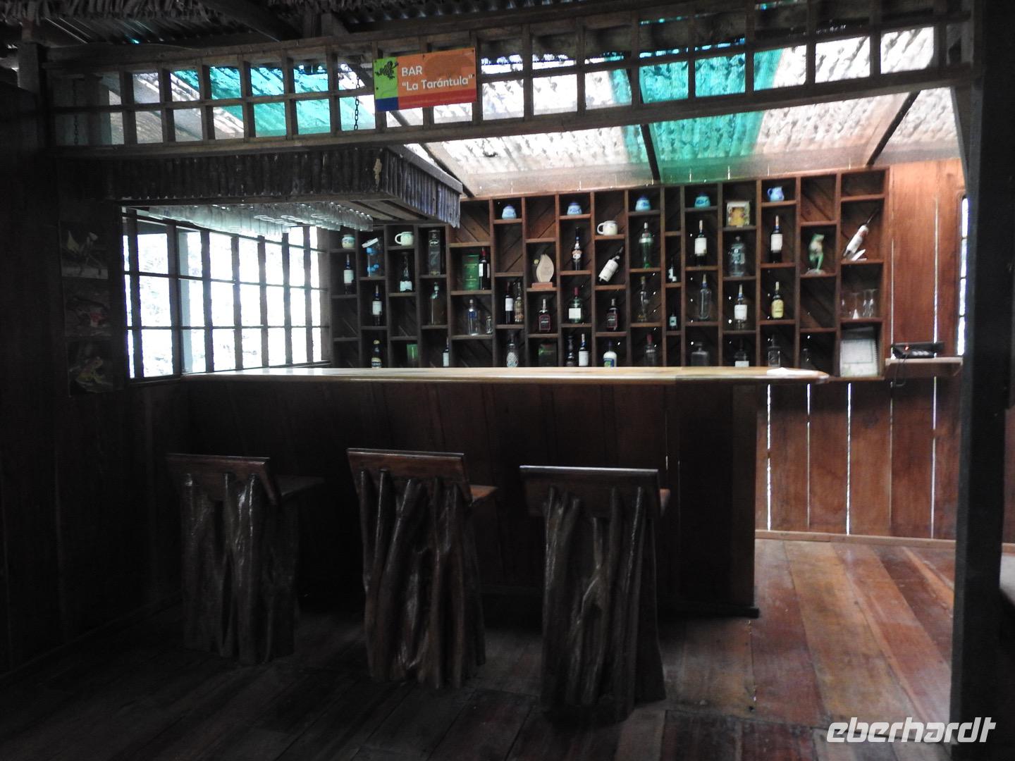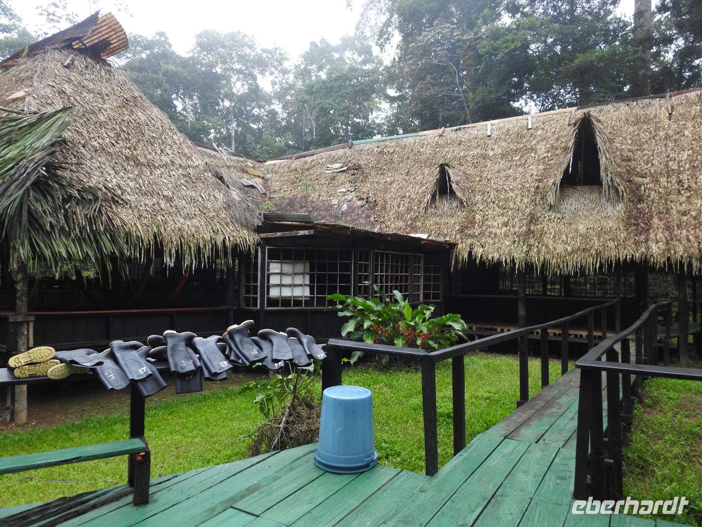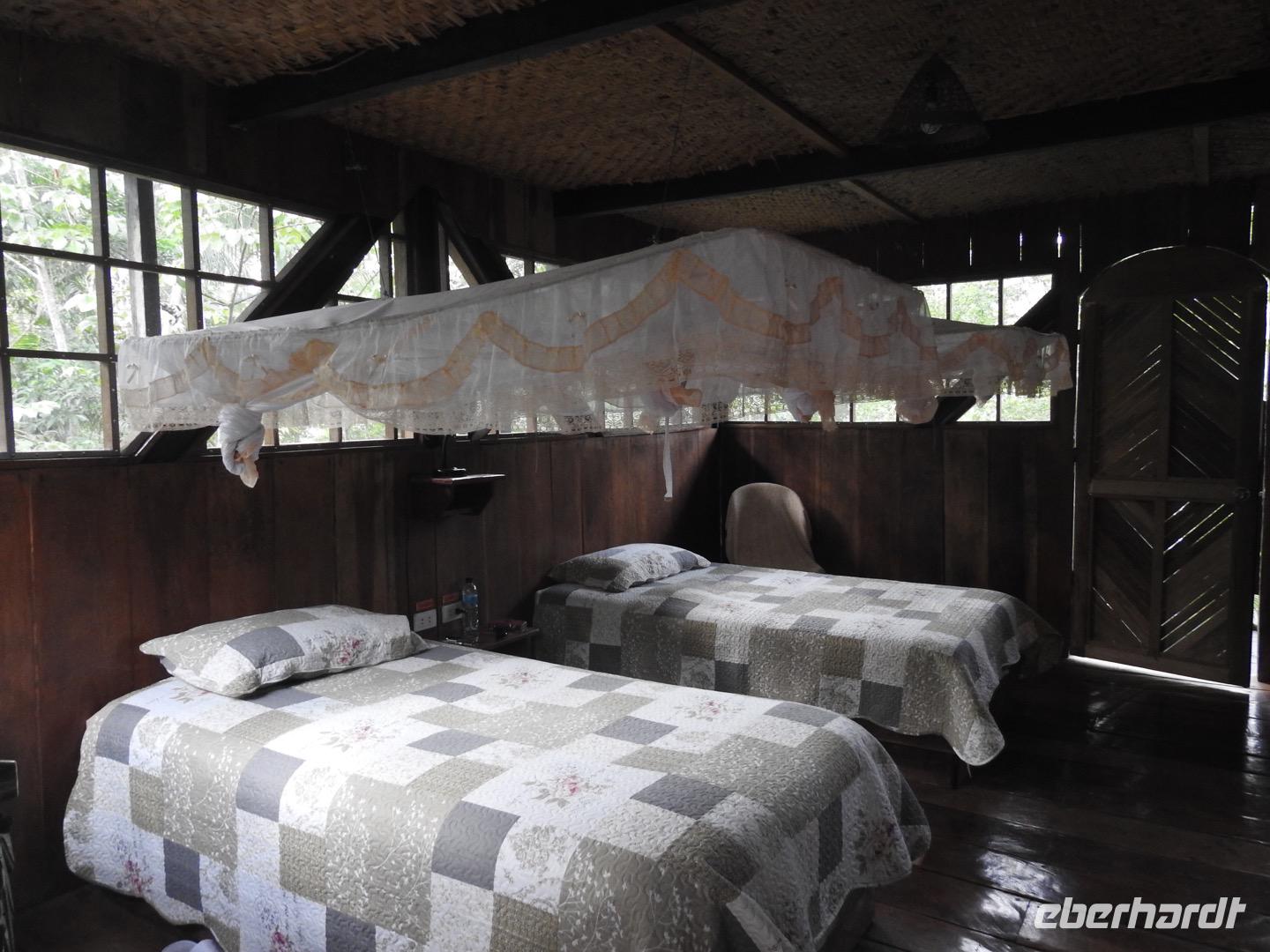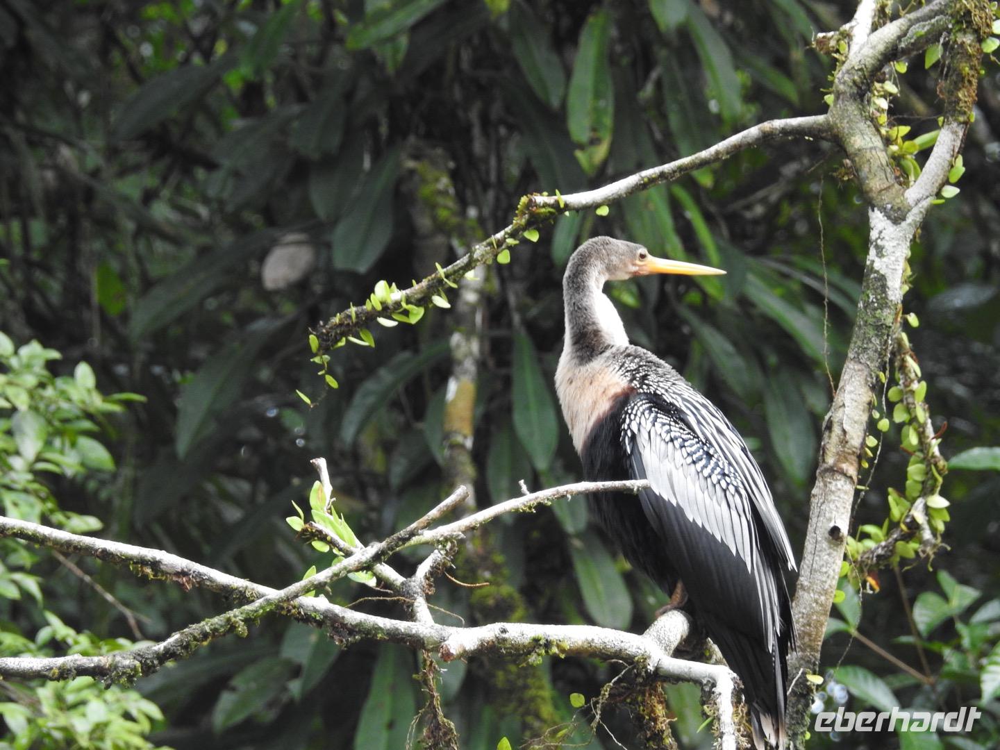 Nach dem Frühstück geben wir unsere Koffer in der Hotellobby ab. In den Dschungel reisen wir nur mit kleinem Gepäck. Walter bringt uns zum Flughafen. Hier ist nichts los, wir müssen noch einen Moment warten bis zum Check In, aber nur, weil wir zu früh dran sind. An den kleinen Souvenirläden vertreiben wir uns die Zeit. Postkarten gibt es nicht, aber schöne Pullover. Nun, jetzt wird nichts gekauft. Nach dem Check In warten wir noch einmal in der leeren Halle, bis wir gegen halb zwölf endlich einsteigen dürfen. Die Maschine ist klein, elf Reihen a zwei Personen. Nach einer halben Stunde landen wir. Kaum sind wir am Gepäckband ist auch das Gepäck schon da. Jetzt fahren wir zwei Stunden mit dem Bus. Es ist nicht langweilig, denn wir bekommen einen ersten Eindruck vom Amazonas-Gebiet, ab und zu tauchen auch ein paar Dörfer auf. Halb drei steigen wir am Cuyabeno Reservat aus. Kurt, unser Regenwald Guide und Inhaber der Tapir Lodge, empfängt uns. Jeder bekommt ein Brötchen und etwas zu trinken. Unsere Rucksäcke werden auf ein Boot verladen. Wir werden mit schwarzen Regencapes und Schwimmwesten ausgestattet, denn es tröpfelt schon. Was wir nicht wissen, die Fahrt zur Lodge wird sich zu einer ausgiebigen ersten Regenwaldexkursion entwickeln. Der erste Dschungelbewohner, dem wir begegnen, ist ein Schlangenhalsvogel. Diesen werden wir in den nächsten Tagen noch oft sehen. Es folgt ein großer grauschwarzer Affe, ein Saki. Wir haben Mühe mit unseren ungeschulten Augen die Tiere im Dickicht auszumachen. Aber Kurt hat viel zu erzählen, vor allem auch über Palmen und Pflanzen. Und immer wieder tauchen bunte Vögel auf. Circa fünfhundertsechzig Arten gibt es in Ecuador. Außerdem sehen wir Kapuzineräffchen, Schnaufhühner und gut getarnte Fledermäuse. Wir sind beeindruckt, das kann man wohl sagen. Nachdem wir die Tapir Lodge erreicht haben, gibt es eine große Schüssel Popcorn zur Begrüßung. Dann werden die Zimmer verteilt. Es gibt zwei Wohntürme, die mit Stegen verbunden sind. Alle Zimmer haben eine geflieste Badzelle und Betten mit Moskitonetzen. Die Gesellschaftsräume sind das Restaurant und ein paar gemütliche Sitzecken, die sich darum herum gruppieren. Nach dem Abendessen und einem ersten Bierchen gehen wir Tarantulieren, wie Kurt sagt. Was bedeutet, er zeigt uns, wo in der Lodge die Taranteln wohnen. Keine Sorge, die tun nichts.