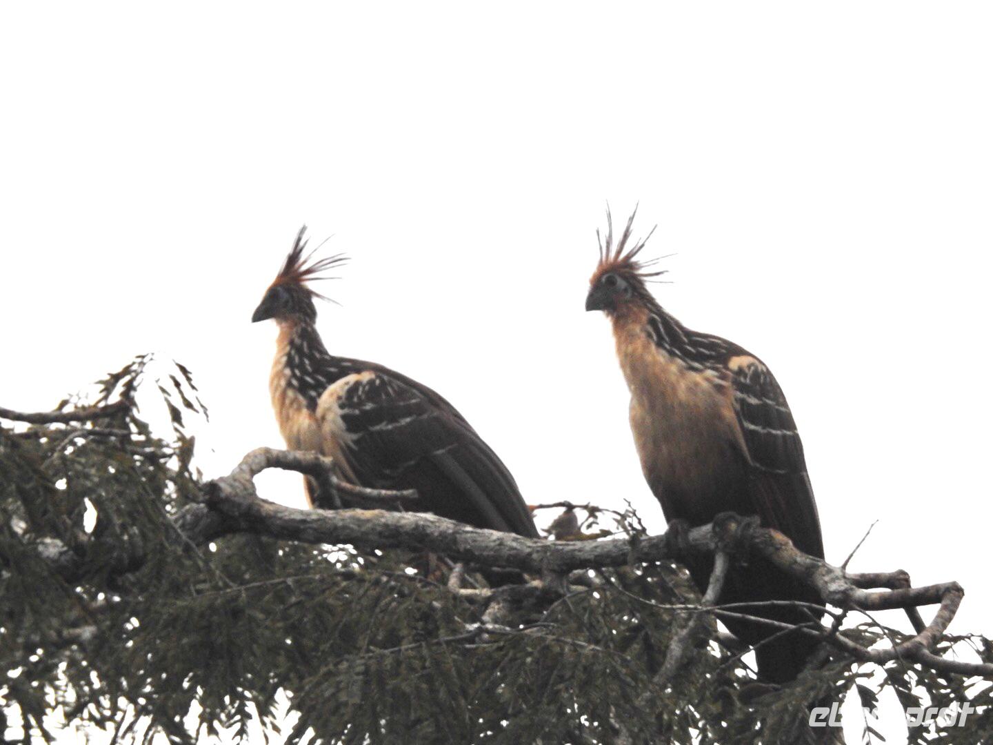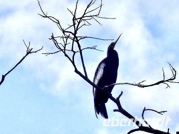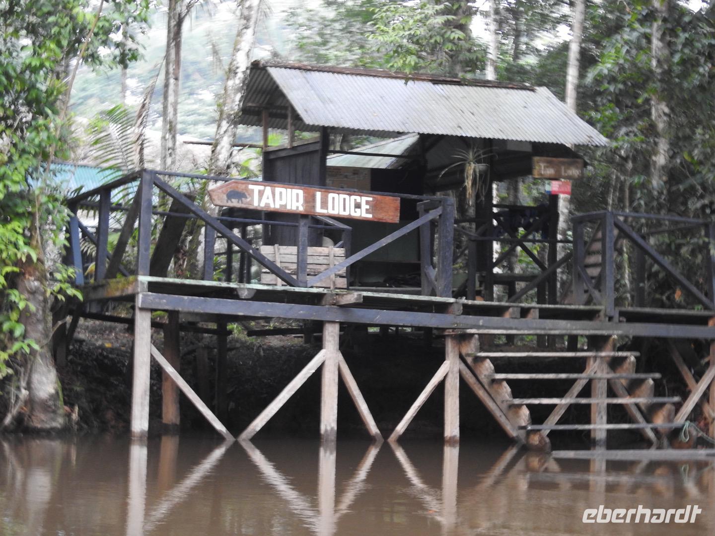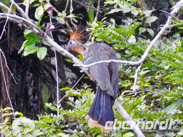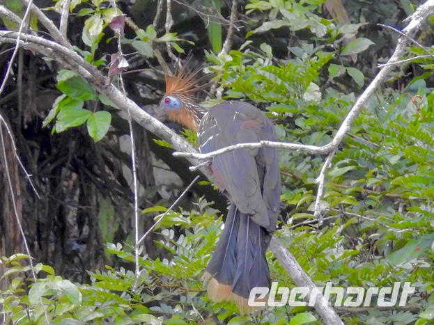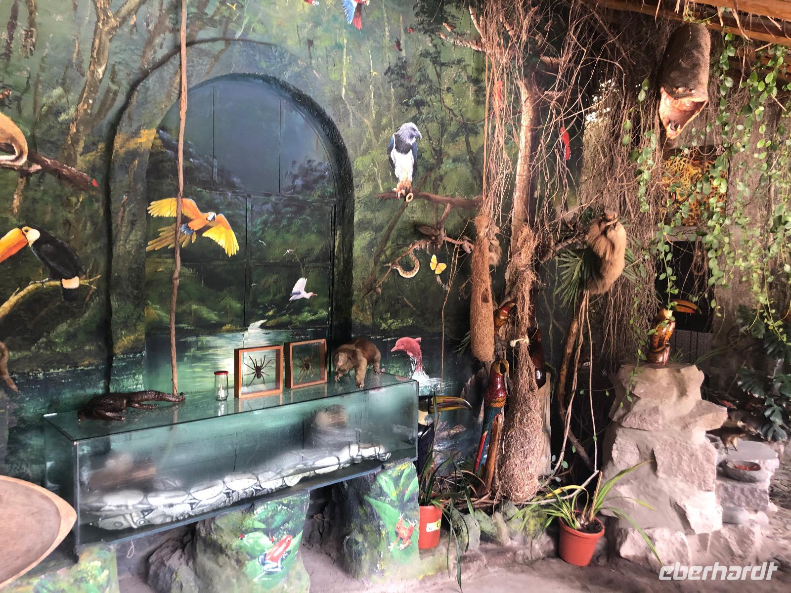 Nach dem Frühstück geben wir unsere Koffer in der Hotellobby ab. In den Dschungel reisen wir nur mit kleinem Gepäck. Walter bringt uns zum Flughafen. Hier ist nichts los, wir müssen noch einen Moment warten bis zum Check In, aber nur, weil wir zu früh dran sind. An den kleinen Souvenirläden vertreiben wir uns die Zeit. Postkarten gibt es nicht, aber schöne Pullover. Nun, jetzt wird nichts gekauft. Nach dem Check In warten wir noch einmal in der leeren Halle, bis wir gegen halb zwölf endlich einsteigen dürfen. Die Maschine ist klein, elf Reihen a zwei Personen. Nach einer halben Stunde landen wir. Kaum sind wir am Gepäckband ist auch das Gepäck schon da. Jetzt fahren wir zwei Stunden mit dem Bus. Es ist nicht langweilig, denn wir bekommen einen ersten Eindruck vom Amazonas-Gebiet, ab und zu tauchen auch ein paar Dörfer auf. Halb drei steigen wir am Cuyabeno Reservat aus. Kurt, unser Regenwald Guide und Inhaber der Tapir Lodge, empfängt uns. Jeder bekommt ein Brötchen und etwas zu trinken. Unsere Rucksäcke werden auf ein Boot verladen. Wir werden mit schwarzen Regencapes und Schwimmwesten ausgestattet, denn es tröpfelt schon. Was wir nicht wissen, die Fahrt zur Lodge wird sich zu einer ausgiebigen ersten Regenwaldexkursion entwickeln. Der erste Dschungelbewohner, dem wir begegnen, ist ein Schlangenhalsvogel. Diesen werden wir in den nächsten Tagen noch oft sehen. Es folgt ein großer grauschwarzer Affe, ein Saki. Wir haben Mühe mit unseren ungeschulten Augen die Tiere im Dickicht auszumachen. Aber Kurt hat viel zu erzählen, vor allem auch über Palmen und Pflanzen. Und immer wieder tauchen bunte Vögel auf. Circa fünfhundertsechzig Arten gibt es in Ecuador. Außerdem sehen wir Kapuzineräffchen, Schnaufhühner und gut getarnte Fledermäuse. Wir sind beeindruckt, das kann man wohl sagen. Nachdem wir die Tapir Lodge erreicht haben, gibt es eine große Schüssel Popcorn zur Begrüßung. Dann werden die Zimmer verteilt. Es gibt zwei Wohntürme, die mit Stegen verbunden sind. Alle Zimmer haben eine geflieste Badzelle und Betten mit Moskitonetzen. Die Gesellschaftsräume sind das Restaurant und ein paar gemütliche Sitzecken, die sich darum herum gruppieren. Nach dem Abendessen und einem ersten Bierchen gehen wir Tarantulieren, wie Kurt sagt. Was bedeutet, er zeigt uns, wo in der Lodge die Taranteln wohnen. Keine Sorge, die tun nichts.