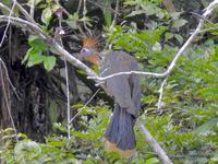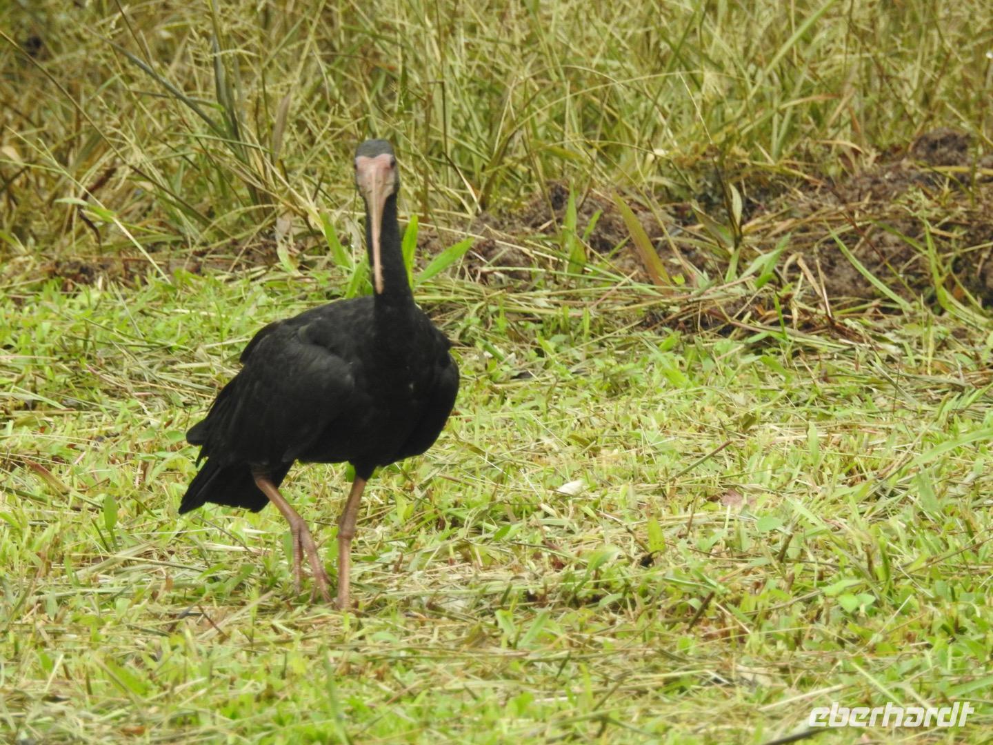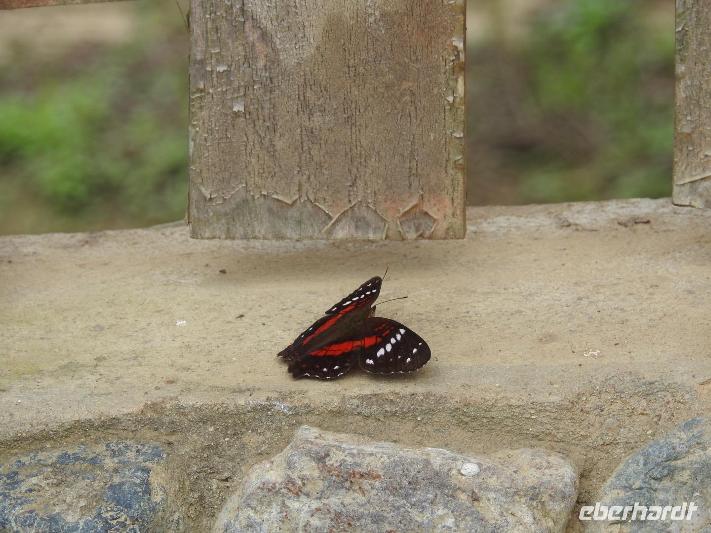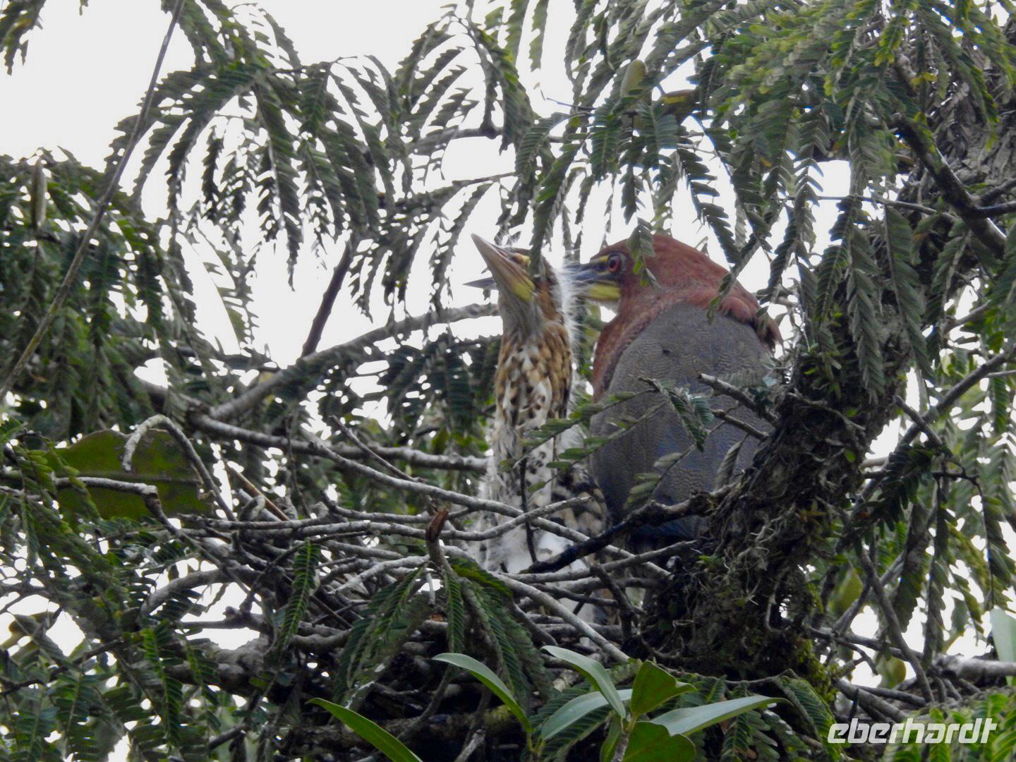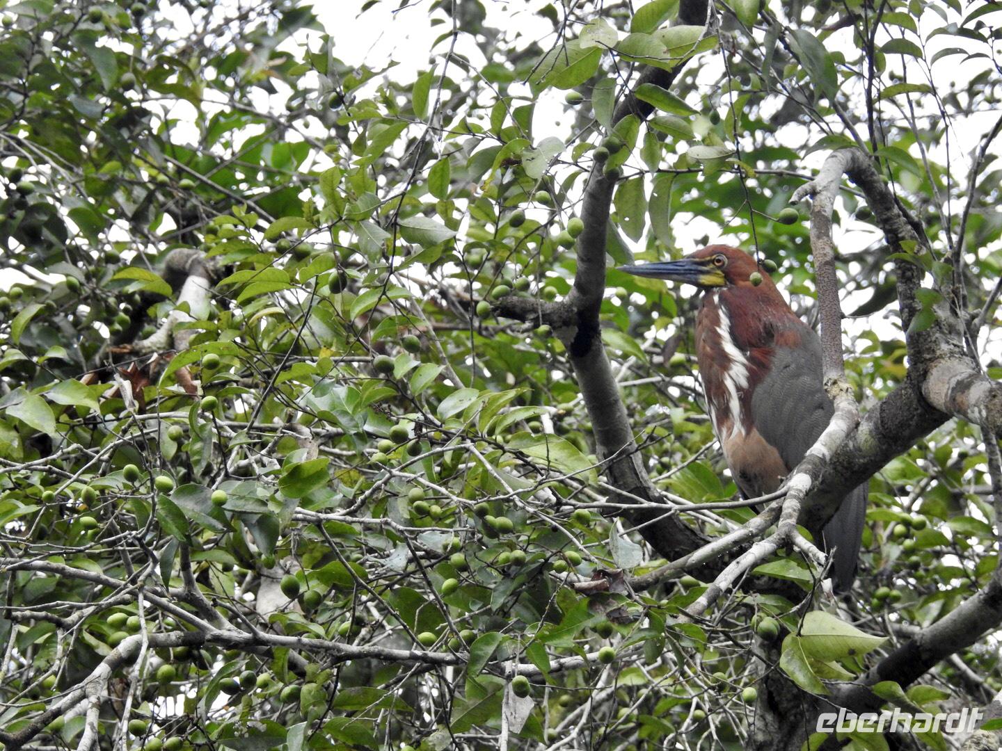 Nach dem Frühstück geben wir unsere Koffer in der Hotellobby ab. In den Dschungel reisen wir nur mit kleinem Gepäck. Walter bringt uns zum Flughafen. Hier ist nichts los, wir müssen noch einen Moment warten bis zum Check In, aber nur, weil wir zu früh dran sind. An den kleinen Souvenirläden vertreiben wir uns die Zeit. Postkarten gibt es nicht, aber schöne Pullover. Nun, jetzt wird nichts gekauft. Nach dem Check In warten wir noch einmal in der leeren Halle, bis wir gegen halb zwölf endlich einsteigen dürfen. Die Maschine ist klein, elf Reihen a zwei Personen. Nach einer halben Stunde landen wir. Kaum sind wir am Gepäckband ist auch das Gepäck schon da. Jetzt fahren wir zwei Stunden mit dem Bus. Es ist nicht langweilig, denn wir bekommen einen ersten Eindruck vom Amazonas-Gebiet, ab und zu tauchen auch ein paar Dörfer auf. Halb drei steigen wir am Cuyabeno Reservat aus. Kurt, unser Regenwald Guide und Inhaber der Tapir Lodge, empfängt uns. Jeder bekommt ein Brötchen und etwas zu trinken. Unsere Rucksäcke werden auf ein Boot verladen. Wir werden mit schwarzen Regencapes und Schwimmwesten ausgestattet, denn es tröpfelt schon. Was wir nicht wissen, die Fahrt zur Lodge wird sich zu einer ausgiebigen ersten Regenwaldexkursion entwickeln. Der erste Dschungelbewohner, dem wir begegnen, ist ein Schlangenhalsvogel. Diesen werden wir in den nächsten Tagen noch oft sehen. Es folgt ein großer grauschwarzer Affe, ein Saki. Wir haben Mühe mit unseren ungeschulten Augen die Tiere im Dickicht auszumachen. Aber Kurt hat viel zu erzählen, vor allem auch über Palmen und Pflanzen. Und immer wieder tauchen bunte Vögel auf. Circa fünfhundertsechzig Arten gibt es in Ecuador. Außerdem sehen wir Kapuzineräffchen, Schnaufhühner und gut getarnte Fledermäuse. Wir sind beeindruckt, das kann man wohl sagen. Nachdem wir die Tapir Lodge erreicht haben, gibt es eine große Schüssel Popcorn zur Begrüßung. Dann werden die Zimmer verteilt. Es gibt zwei Wohntürme, die mit Stegen verbunden sind. Alle Zimmer haben eine geflieste Badzelle und Betten mit Moskitonetzen. Die Gesellschaftsräume sind das Restaurant und ein paar gemütliche Sitzecken, die sich darum herum gruppieren. Nach dem Abendessen und einem ersten Bierchen gehen wir Tarantulieren, wie Kurt sagt. Was bedeutet, er zeigt uns, wo in der Lodge die Taranteln wohnen. Keine Sorge, die tun nichts.