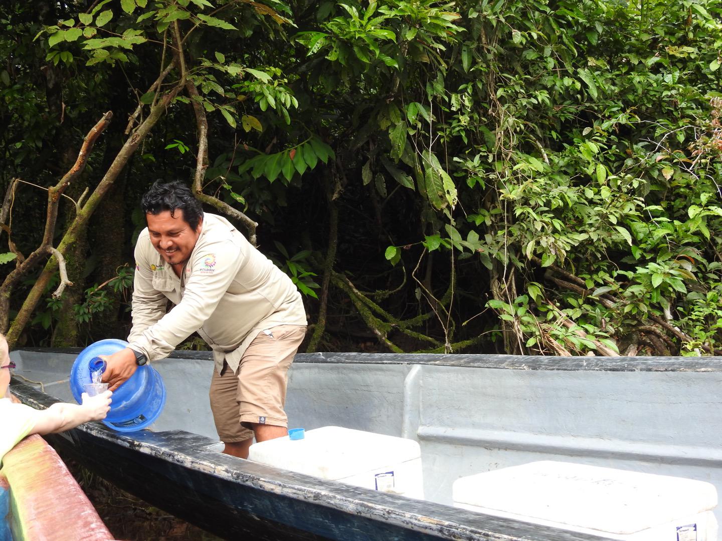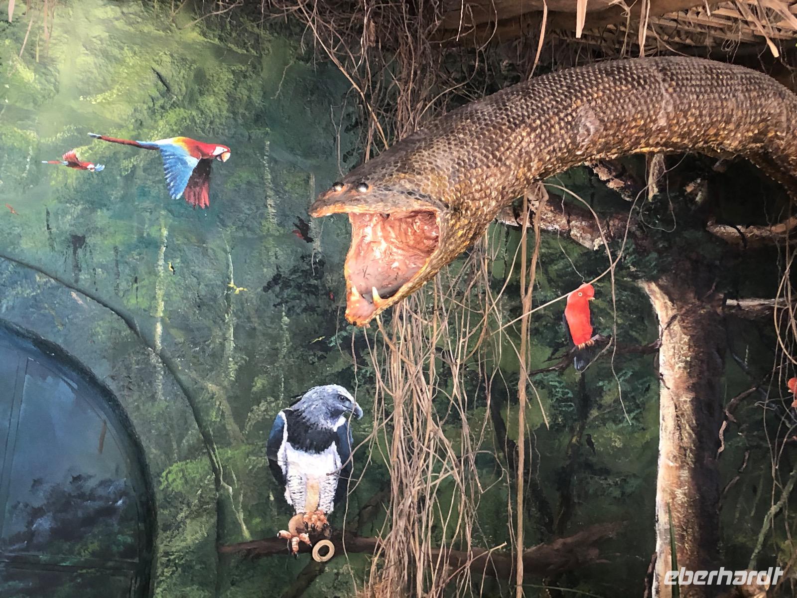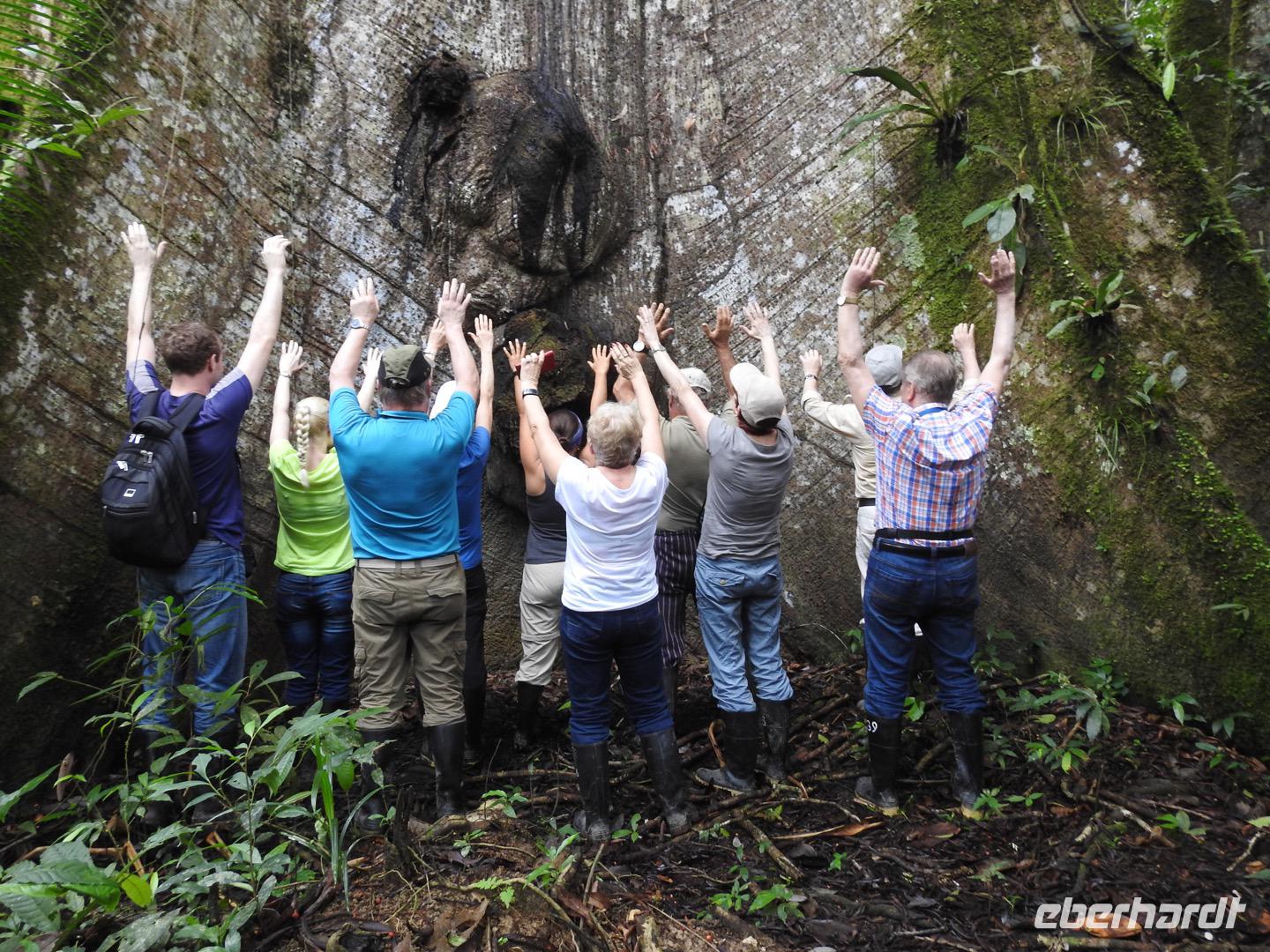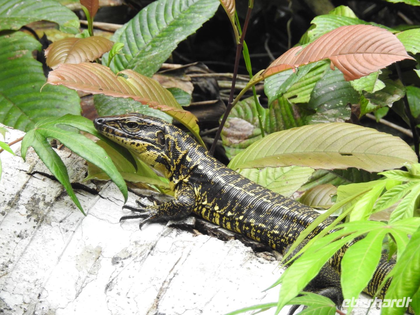 Um acht Uhr gibt es Frühstück. Obst, Rührei und Toast. Kaffee natürlich auch. Am Vormittag unternehmen wir eine umfangreiche Dschungelsafari. Zuerst starten wir wieder mit dem Boot. Wir entdecken ein Faultier, Affen, verschiedene Vogelarten und uns unbekannte Pflanzen und Bäume. Dann geht es zu Fuß weiter. Kreuz und quer durch den Regenwald. Zum Glück hat uns Kurt mit Gummistiefeln ausgestattet. Er lässt uns an Pflanzen riechen und erklärt uns, wie die Bäume miteinander leben, kommunizieren und sich gegen Feinde wehren. Wir lernen Ameisenarten kennen, riechen und sogar schmecken. Zum späten Mittagessen sind wir zurück in der Lodge. Kurt gönnt uns ein bisschen Pause, dann geht es wieder auf das Boot. Wir fahren zum See, um den Sonnenuntergang zu beobachten, aber es ist zu wolkig. Schnell wird es stockdunkel. Unser Ziel ist es nun, Kaimane zu entdecken, was mindestens einmal auch gelingt.