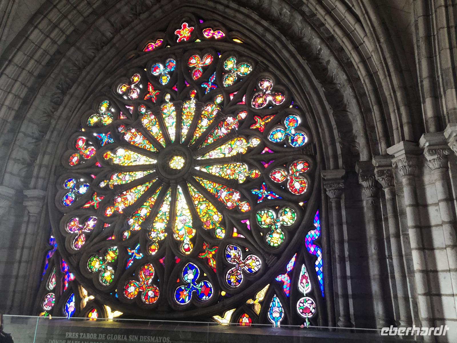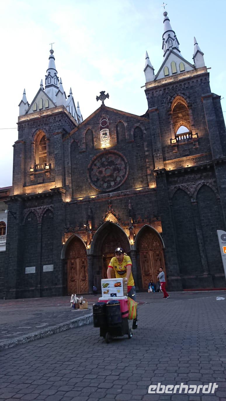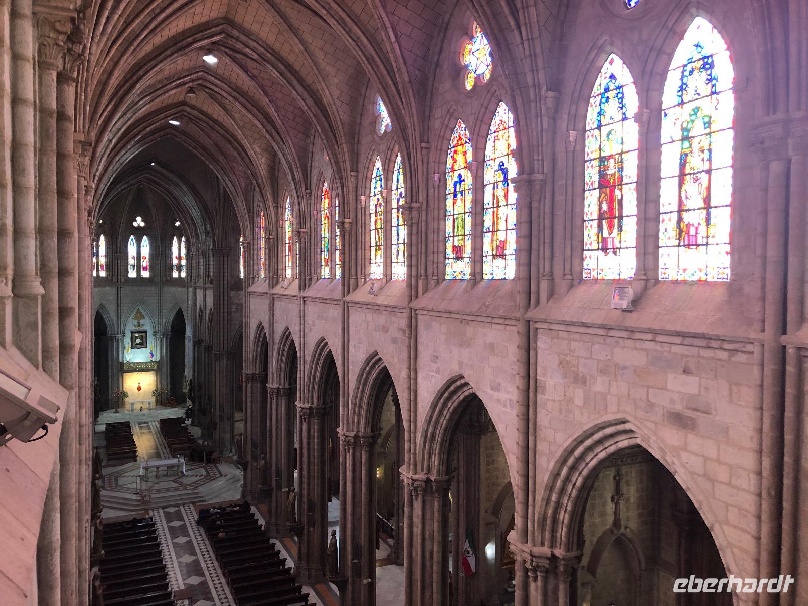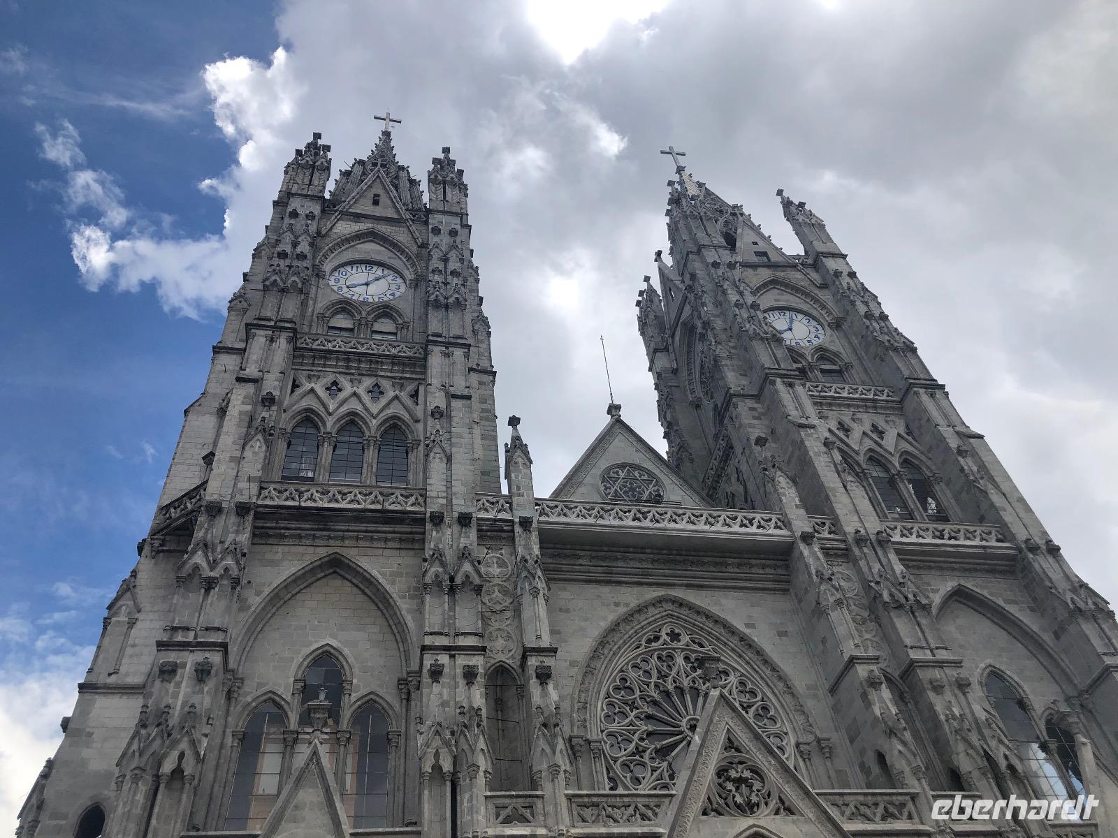 Wir fahren zurück nach Quito und besuchen die Basilica del Voto Nacional, die eines der größten Gebäude von Quito ist. Die beiden Türme sind 115 Meter hoch. Über einhundert Jahre dauerte es bis zur Fertigstellung der Kathedrale. Linda führt uns eine schmale Wendeltreppe hinauf und so stehen wir genau gegenüber der farbenfreudigen Rosette und können von oben einen Blick in den Altarraum werfen.