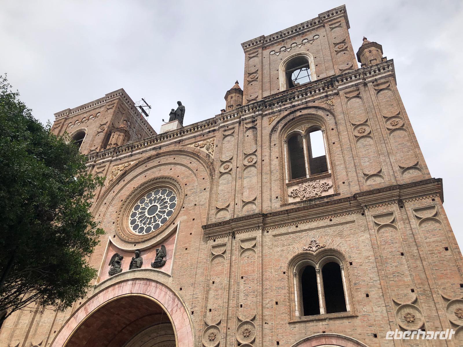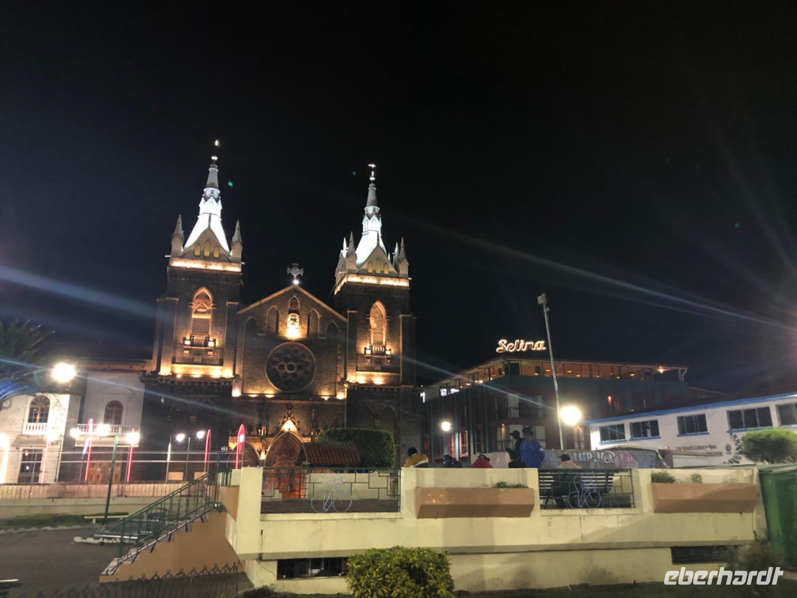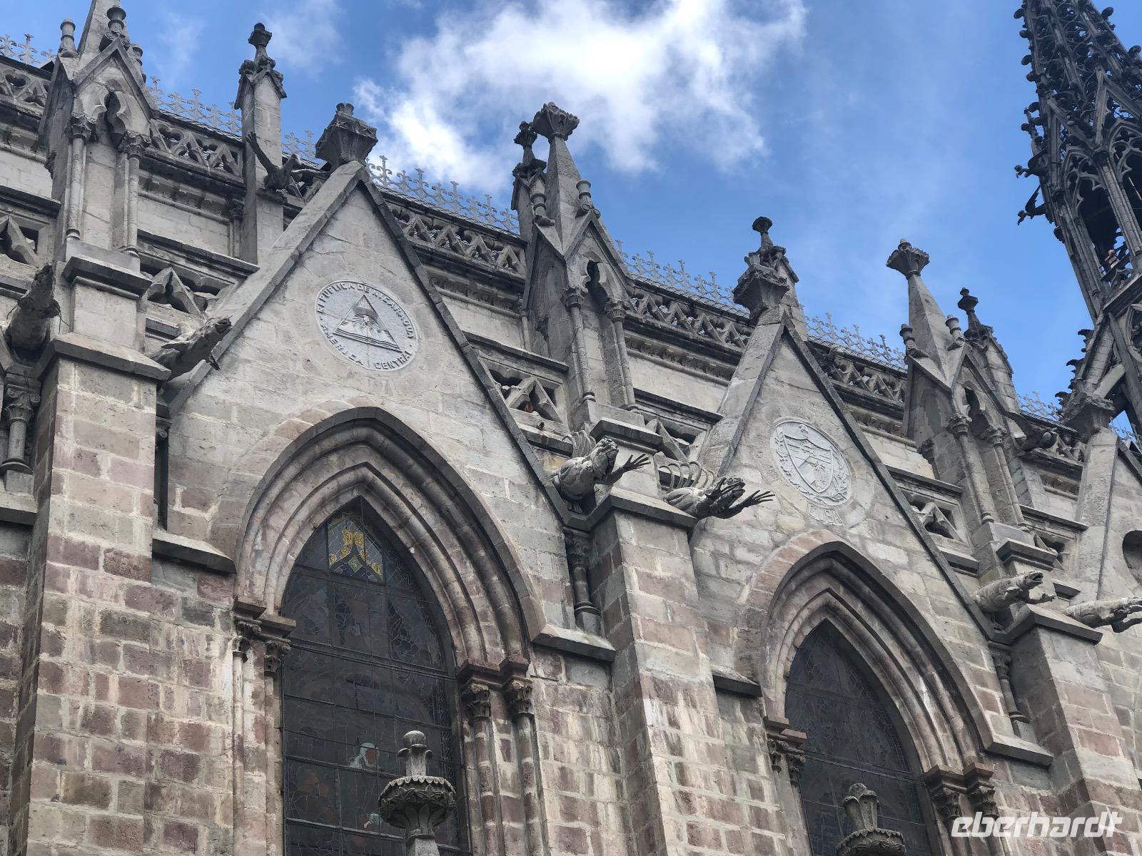 Wir fahren zurück nach Quito und besuchen die Basilica del Voto Nacional, die eines der größten Gebäude von Quito ist. Die beiden Türme sind 115 Meter hoch. Über einhundert Jahre dauerte es bis zur Fertigstellung der Kathedrale. Linda führt uns eine schmale Wendeltreppe hinauf und so stehen wir genau gegenüber der farbenfreudigen Rosette und können von oben einen Blick in den Altarraum werfen.