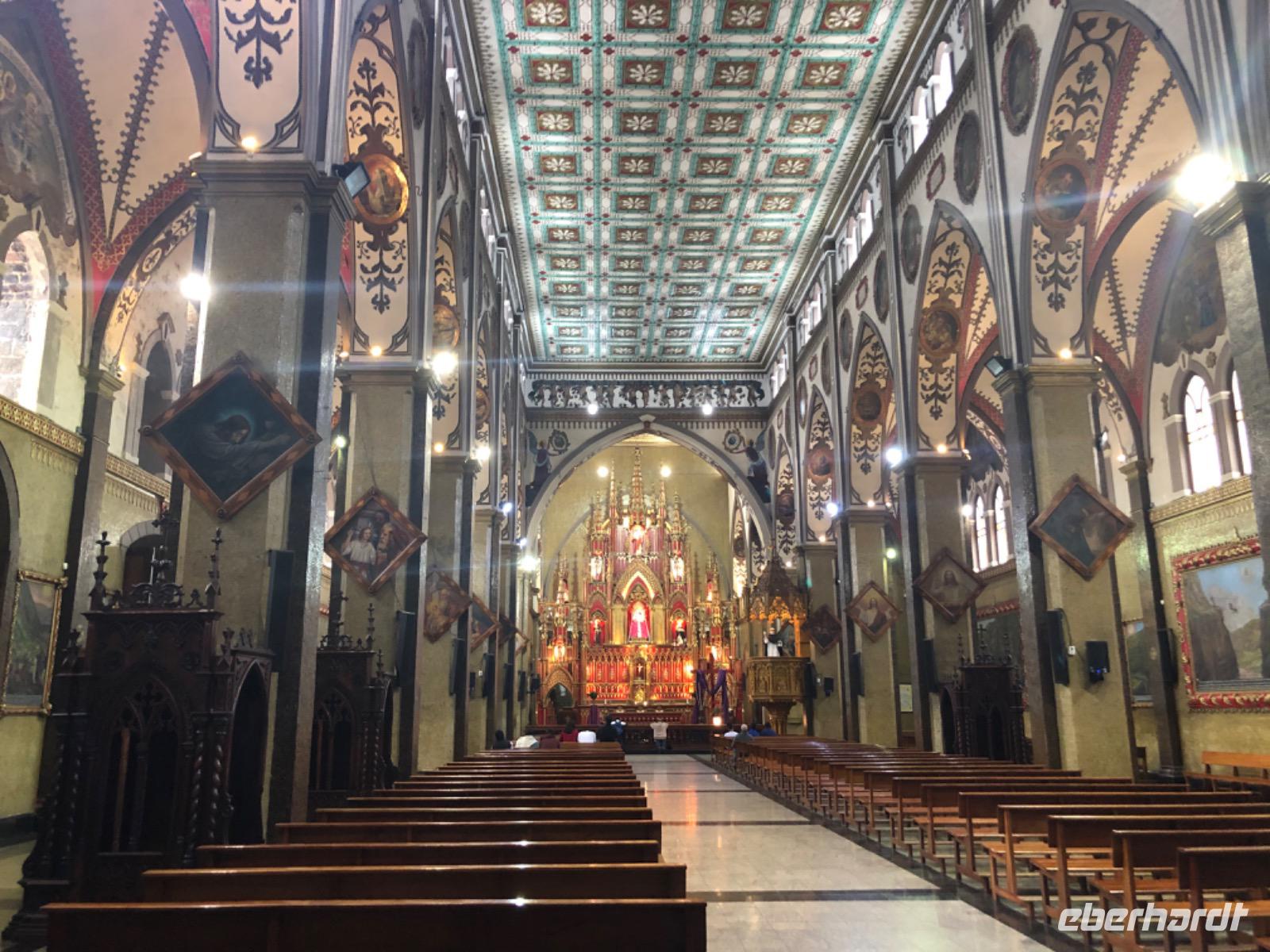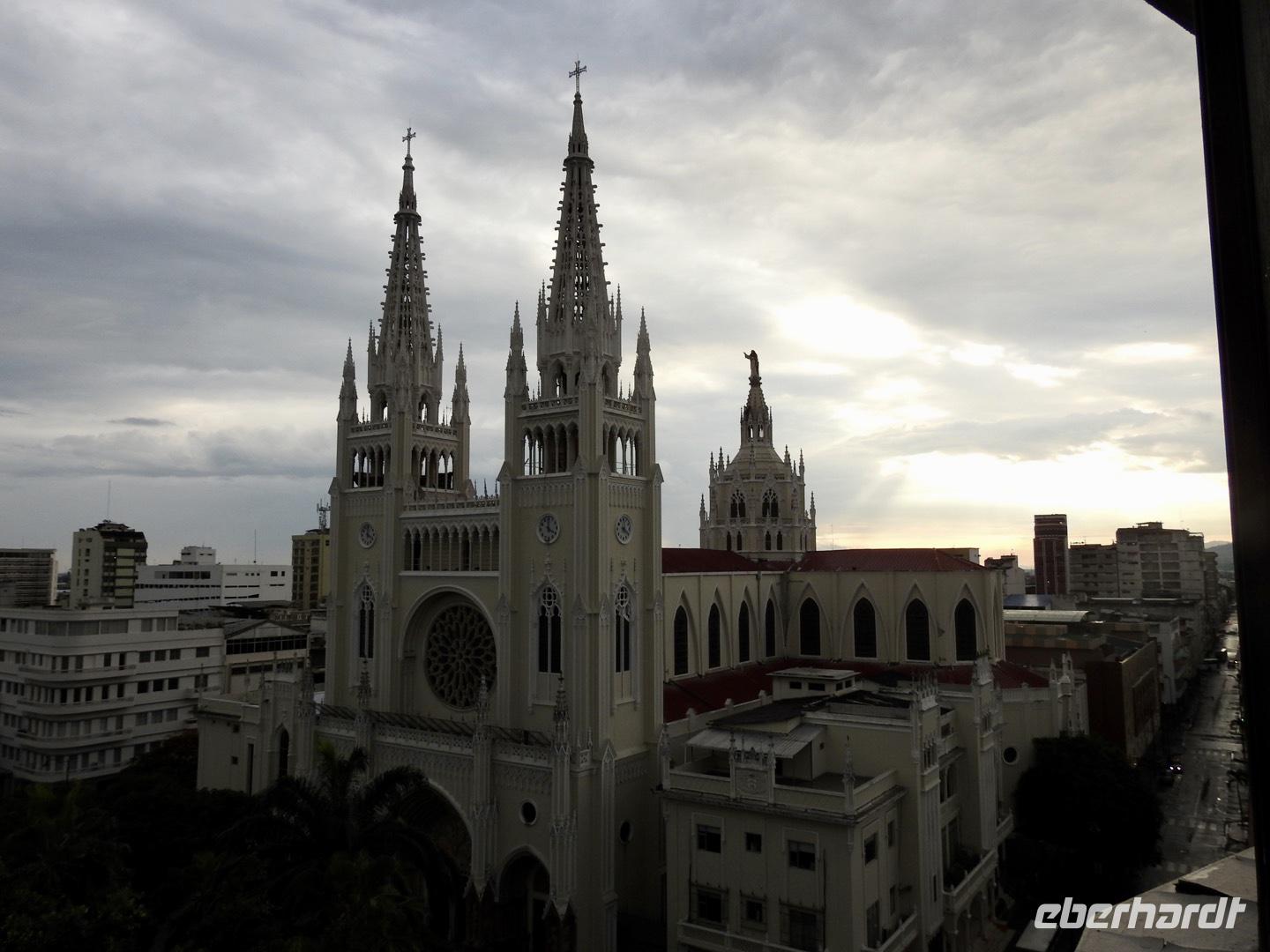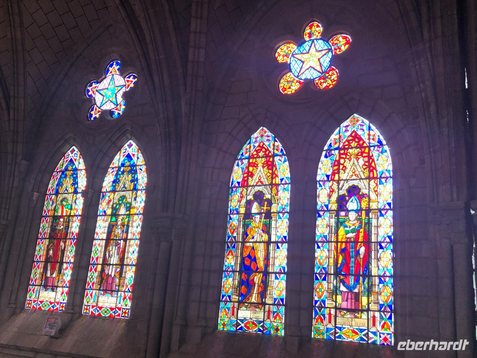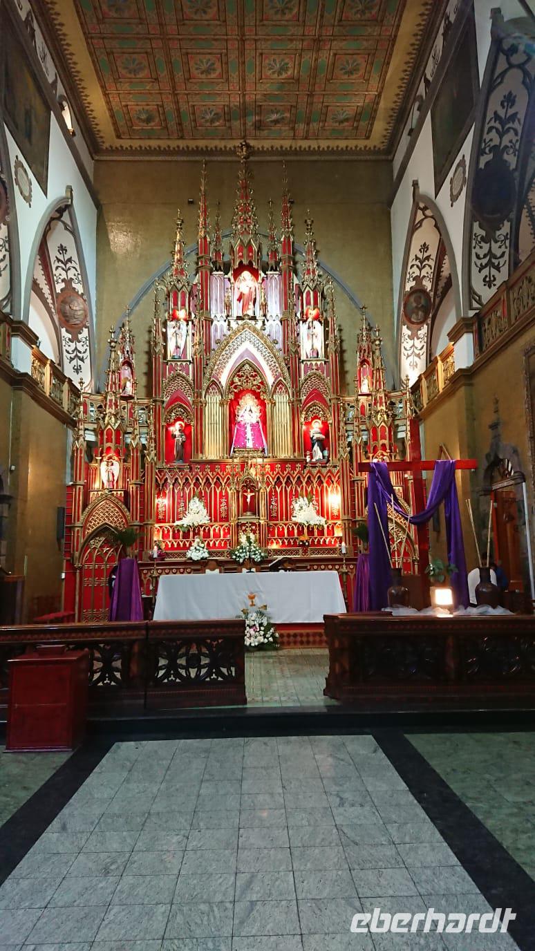 Wir fahren zurück nach Quito und besuchen die Basilica del Voto Nacional, die eines der größten Gebäude von Quito ist. Die beiden Türme sind 115 Meter hoch. Über einhundert Jahre dauerte es bis zur Fertigstellung der Kathedrale. Linda führt uns eine schmale Wendeltreppe hinauf und so stehen wir genau gegenüber der farbenfreudigen Rosette und können von oben einen Blick in den Altarraum werfen.
