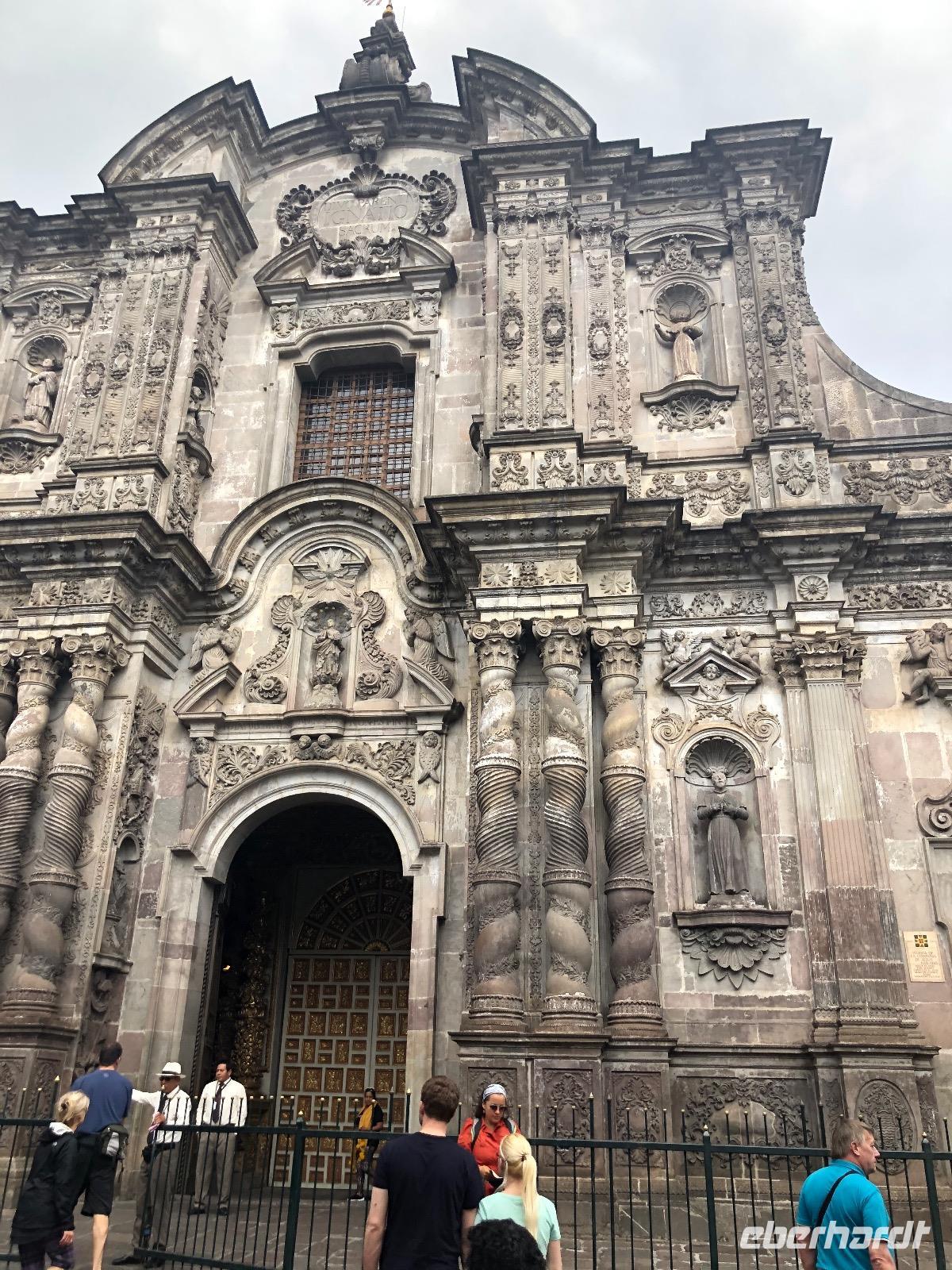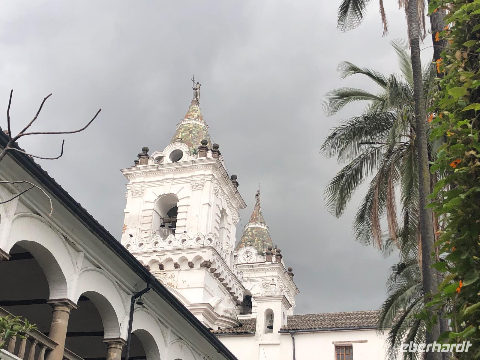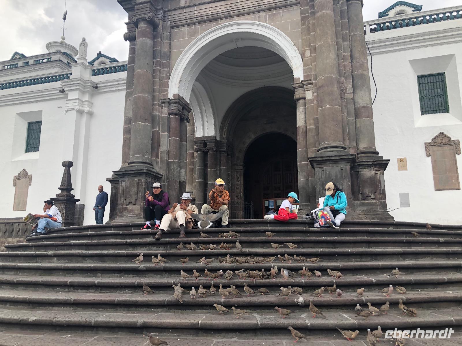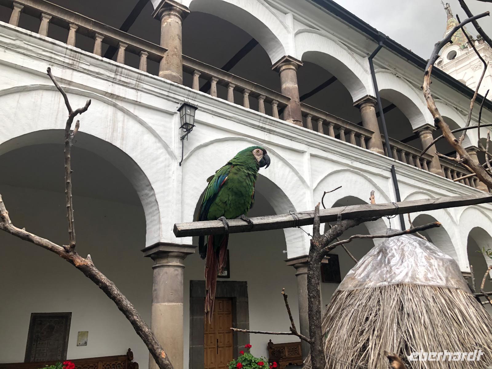 Anschließend gehen wir zu Fuß zum Plaza de la Independencia. In der Mitte befindet sich ein Denkmal für die Erreichung der Unabhängigkeit von Spanien. Um den Platz herum reihen sich die Kathedrale, das Rathaus, der Bischofspalast und der Regierungspalast. Unser Weg führt uns weiter zur Jesuitenkirche. Diese ist über und über mit Gold geschmückt. Linda erklärt uns hier, wie es den Spaniern gelang, den Indios ihren Glauben aufzuzwingen. Als wir an der San Francisco Plaza ankommen, ballen sich bereits schwarze Wolken am Himmel. Aber noch sind wir im Trocknen. Im Innenhof erleben wir eine besondere Überraschung: hier gehen zwei lachende Papageien spazieren.