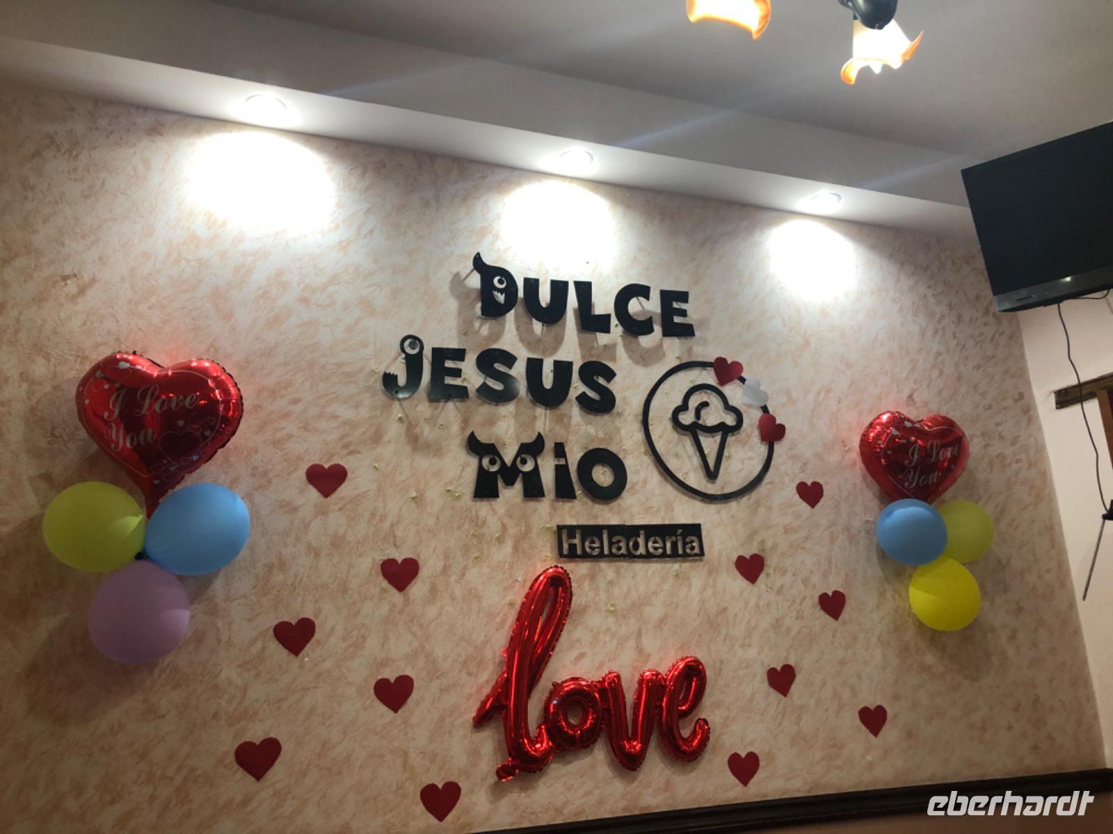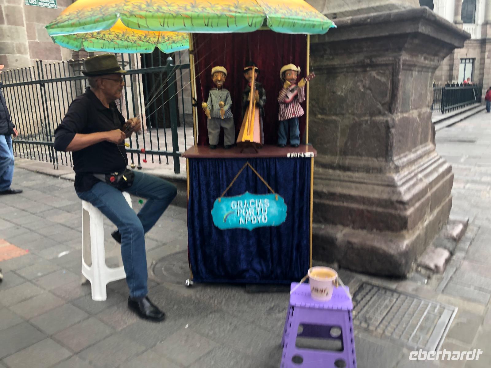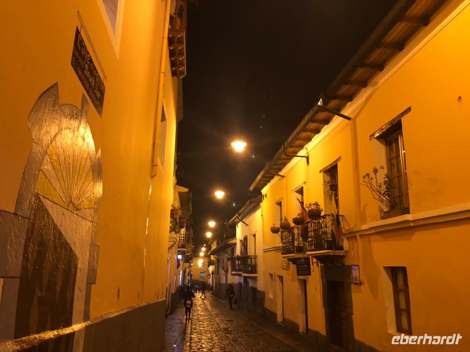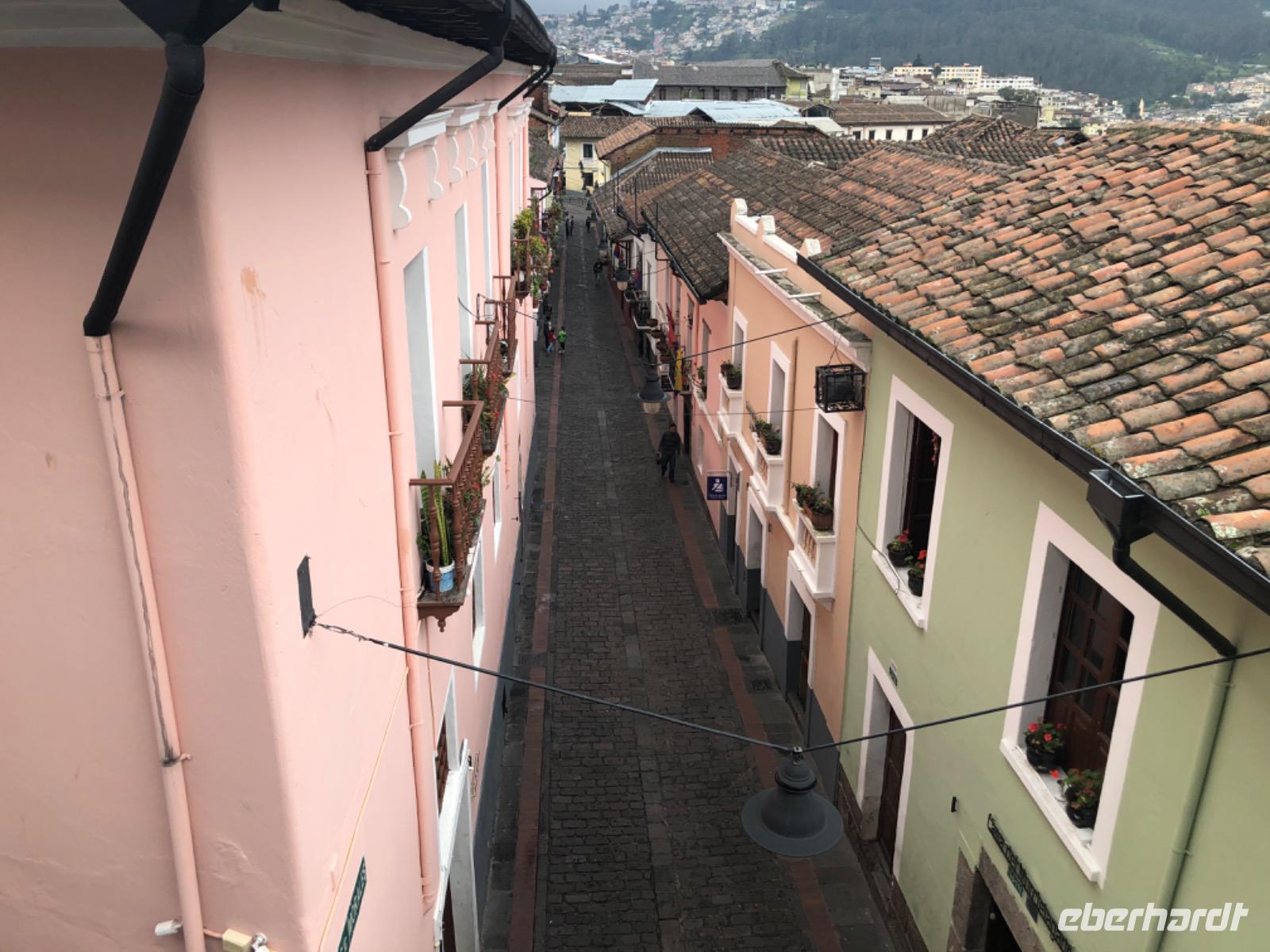 Nachdem unsere Angaben im Laptop erfasst sind, dürfen wir weiter fahren. Nach noch einmal neunzig Minuten erreichen wir den Flughafen. Kaum haben wir Zeit, unser Sandwich zu essen, da heißt es schon BOARDING, schnell durch die Sicherheitskontrolle (nein, man darf kein Taschenmesser auf einem Inlandsflug im Handgepäck haben) und dann schnell einsteigen, schnell abfliegen und schnell wieder ankommen. Bereits um 13 Uhr erreichen wir wieder unser Hotel in Quito. Jetzt brauchen wir erst einmal eine Pause, außerdem regnet es schon wieder. Um 16 Uhr treffen wir uns an der Rezeption. Mit zwei Taxis fahren wir zum Plaza Grande (5 $). Ziel ist ein Geschäft, in dem wir Schokolade trinken und kaufen wollen. Kaufen klappt, trinken nicht. Wir spazieren die Venezuela Straße immer geradeaus bis wir zur Calle la Ronda kommen. Die angeblich so berühmte Straße ist so unscheinbar, dass wir sie fast verpassen. Ein kleines Gässchen mit bunten Häuserfassaden. Erst auf den zweiten Blick zeigt sich ihr eigentlicher Charme. Die Häuser verfügen über hübsch gestaltete Innenhöfe, die so manches Geheimnis bergen. Vor allem sind es Restaurants und Cafés, aber auch kleine Kunstgalerien und Kunstwerkstätten. Wir geraten Künstler, der nach Vorlagen aus der alten Zeit Masken, Madonnenschmuck und andere Dinge fertigt. Er begrüßt uns freundlich und lässt alles stehen und liegen, um uns zu erklären und zu zeigen, was er macht. Wir bedanken uns artig und setzen unseren Spaziergang fort. Jedes Restaurant wünscht, dass wir einkehren, aber wir laufen erst einmal bis zum Ende der Straße, wo wir ein einen Eisladen aufsuchen, den uns Linda empfohlen hat. Auch dieser befindet sich auf einem Hinterhof und in der ersten Etage.