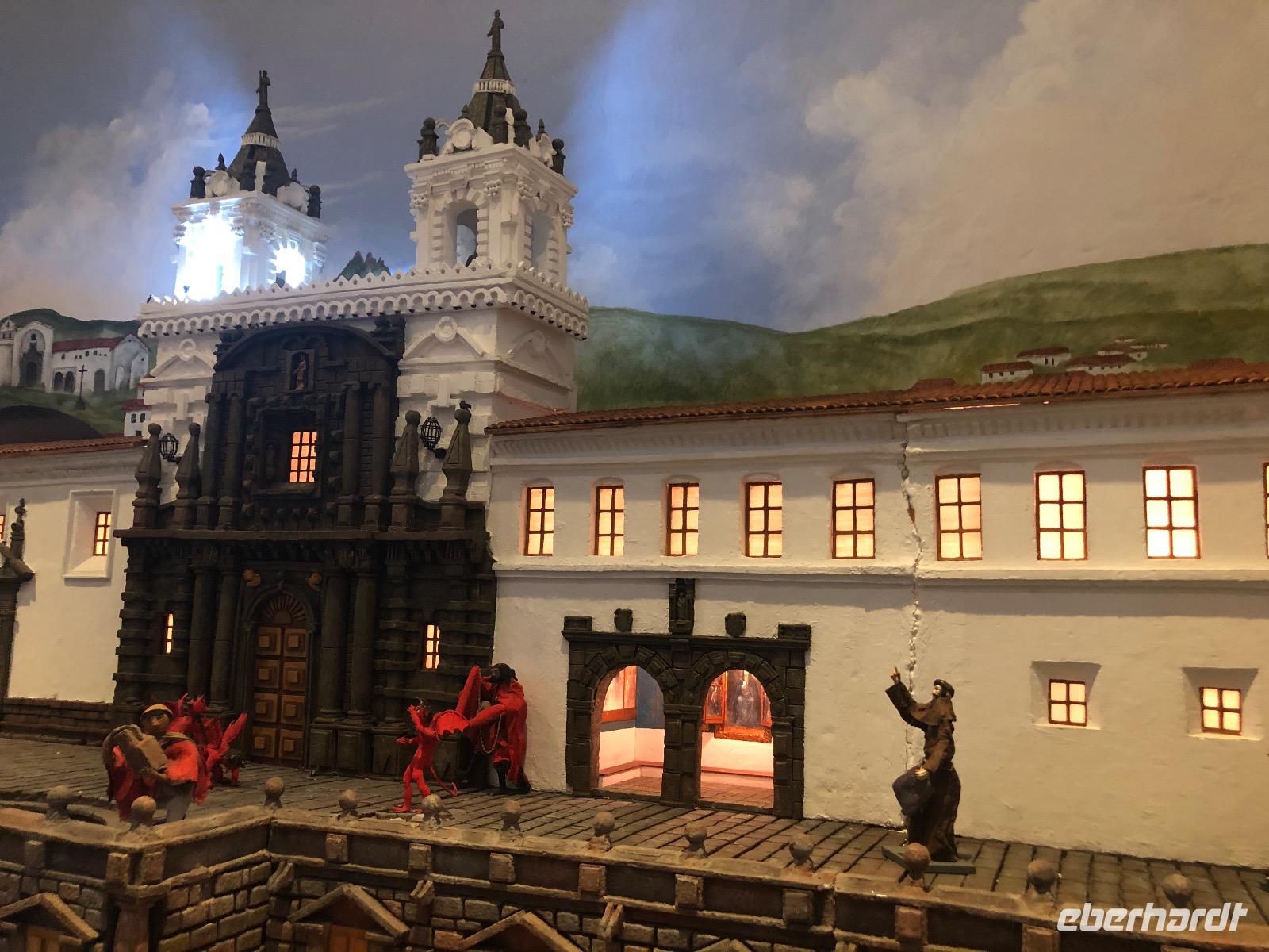 Zurück in Banos besuchen wir die Kirche Santuario de la Virgen und schauen uns die Wandgemälde an. Die Bilder erzählen ausdrucksstark von der jüngeren Geschichte der Stadt und den Wundern, die die heilige Jungfrau Maria in Zeiten der Not vollbrcht hat. Nach einem Vulkanausbruch kam es zu einem großen Stadtbrand mit entsprechenden Folgen. Wer jedoch die Jungfrau Maria sah, wurde errettet. Diese Erlebnisse sind eindrucksvoll auf den Gemälden dargestellt.
