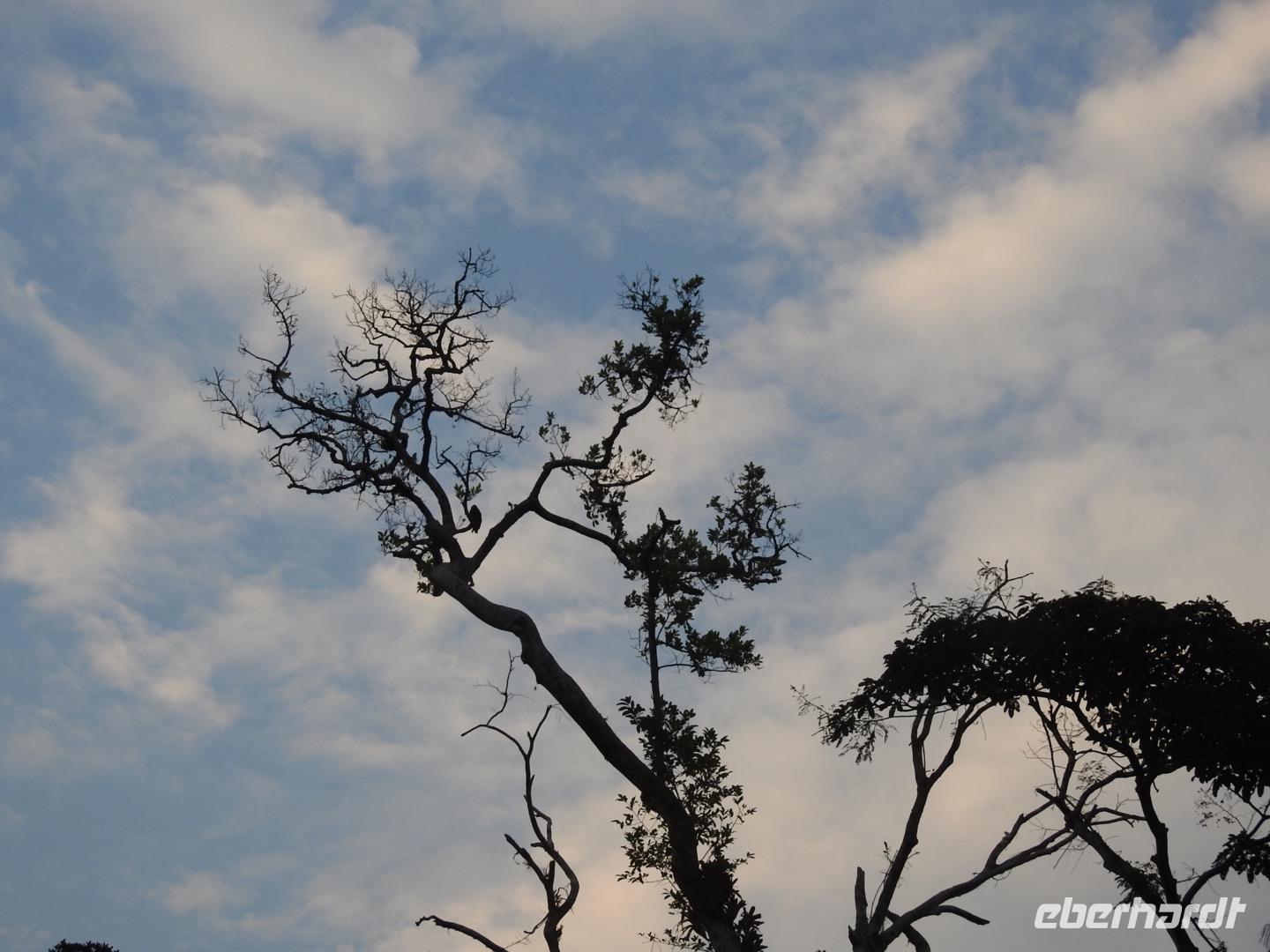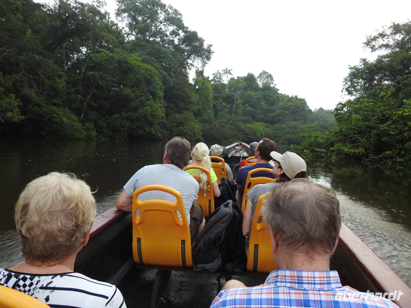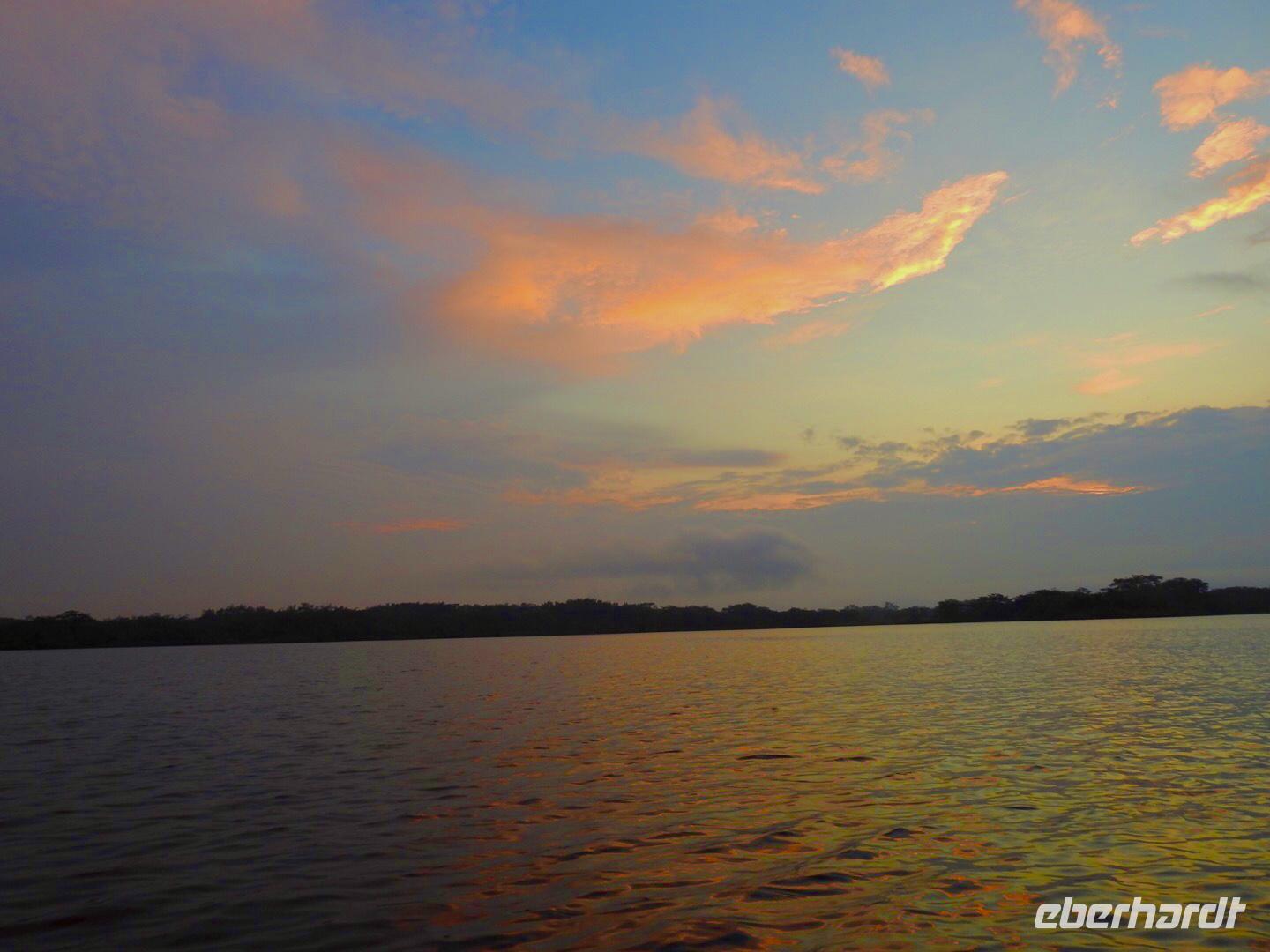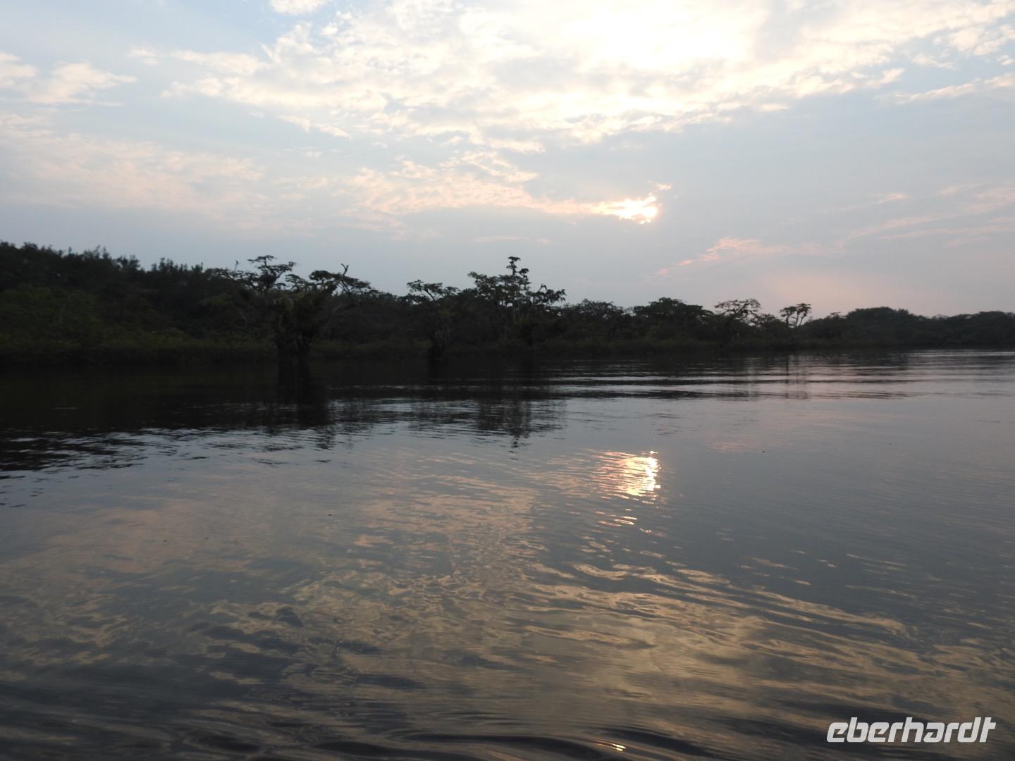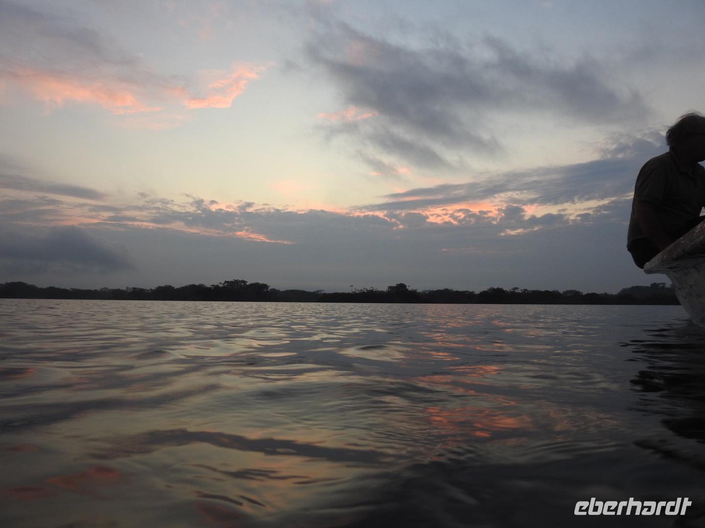 Der Regen hat nachgelassen und wir fahren zurück zur Lodge. Nach dem Abendessen steigen wir wieder ins Boot. Ein letztes Mal suchen wir nach Affen, Faultieren und Vögeln. Die Sonne geht unspektakulär unter. Es ist zu wolkig. Zum Abschluss unternehmen wir eine Nachtwanderung durch den finsteren Regenwald. In der Nacht sieht alles ganz anders aus und auch die Geräuschkulisse ist eine andere. Insekten tanzen im Licht unserer Taschenlampen, die großen Tiere schlafen. Irgendwann lässt Kurt uns die Lampen ausmachen und wir lassen die seltsame Atmosphäre auf uns wirken. Nur hören, fühlen und riechen. Zu sehen ist nichts. Endlich ist der Spuk vorbei und wir fahren zurück in die Lodge. Ab ins Bett, morgen müssen wir früh raus.