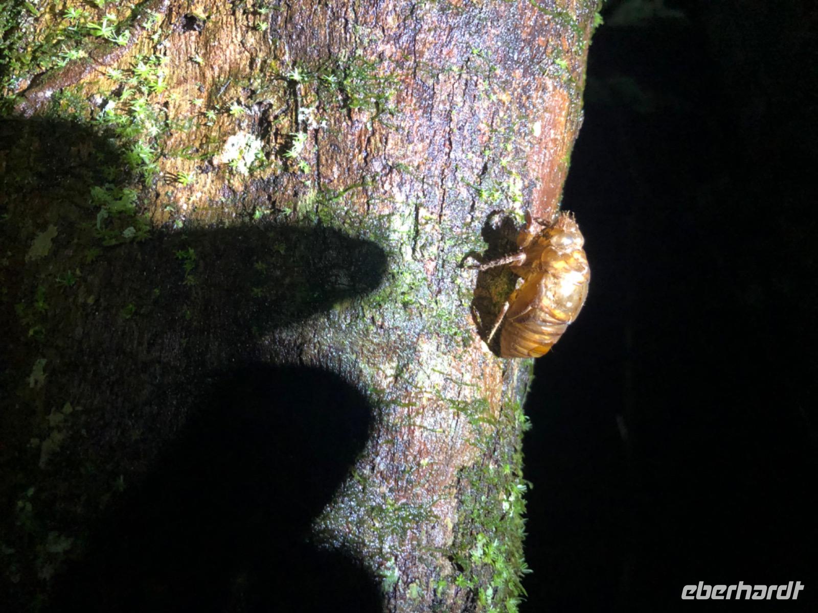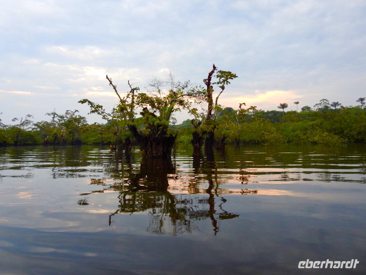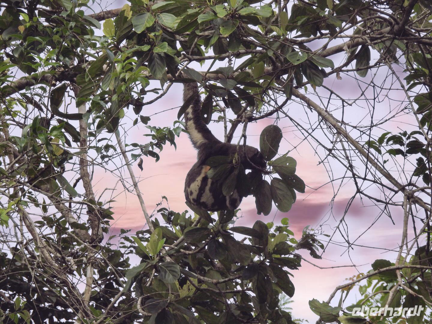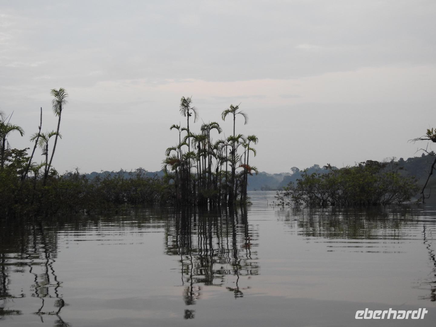Der Regen hat nachgelassen und wir fahren zurück zur Lodge. Nach dem Abendessen steigen wir wieder ins Boot. Ein letztes Mal suchen wir nach Affen, Faultieren und Vögeln. Die Sonne geht unspektakulär unter. Es ist zu wolkig. Zum Abschluss unternehmen wir eine Nachtwanderung durch den finsteren Regenwald. In der Nacht sieht alles ganz anders aus und auch die Geräuschkulisse ist eine andere. Insekten tanzen im Licht unserer Taschenlampen, die großen Tiere schlafen. Irgendwann lässt Kurt uns die Lampen ausmachen und wir lassen die seltsame Atmosphäre auf uns wirken. Nur hören, fühlen und riechen. Zu sehen ist nichts. Endlich ist der Spuk vorbei und wir fahren zurück in die Lodge. Ab ins Bett, morgen müssen wir früh raus.
