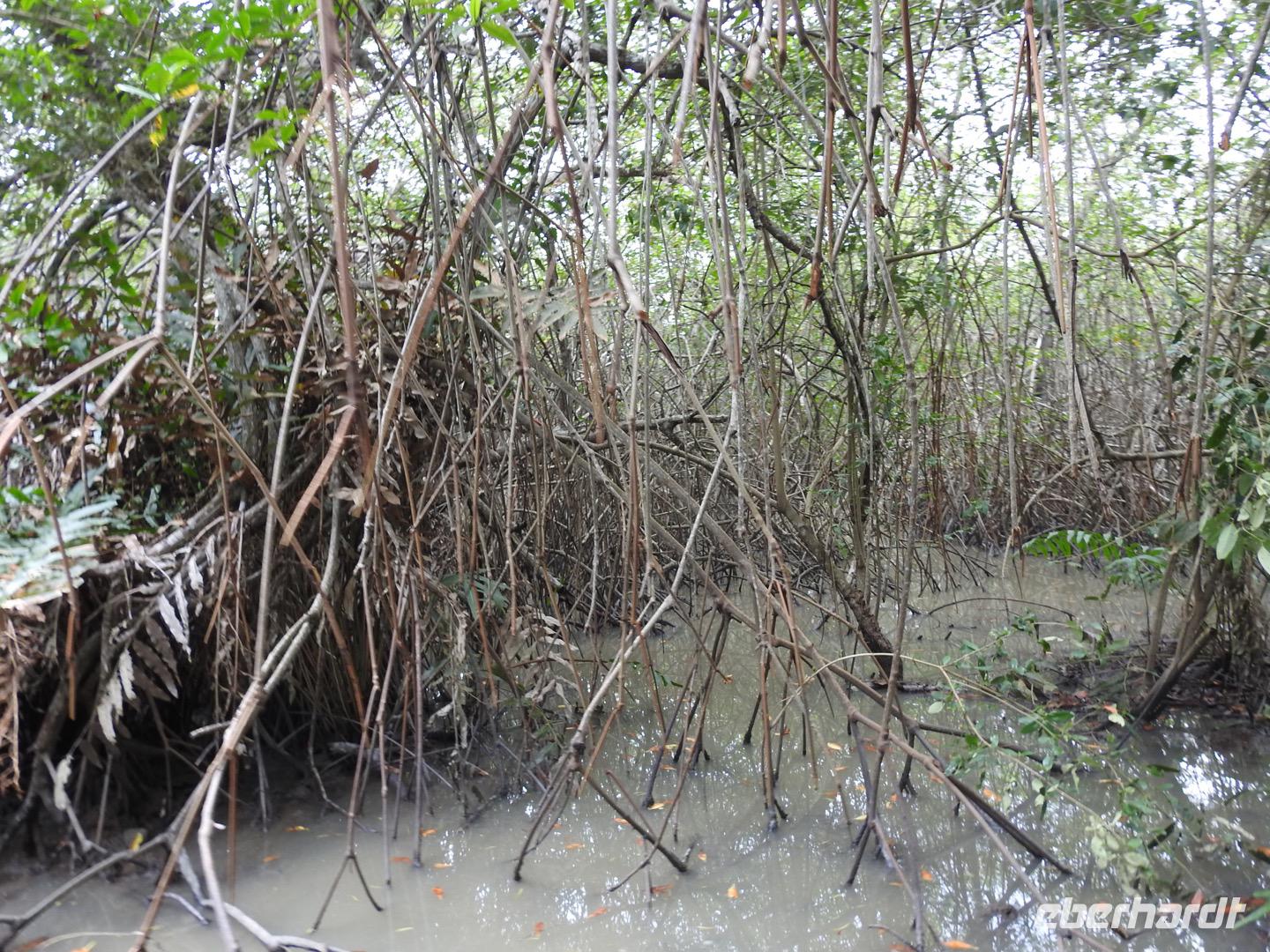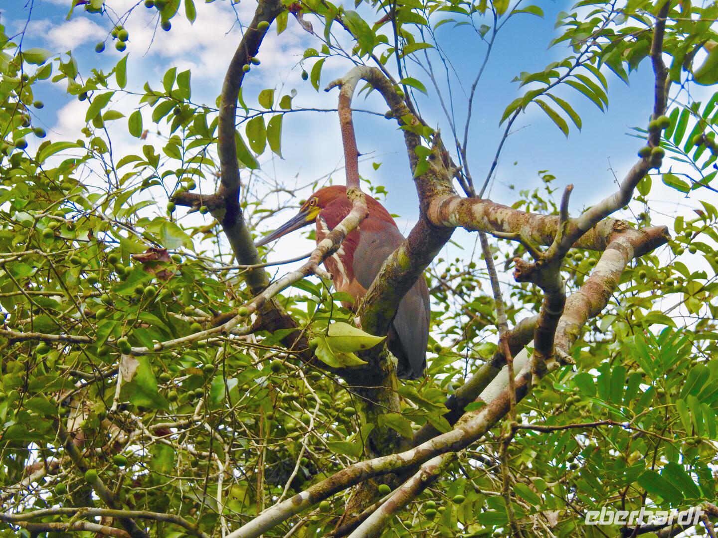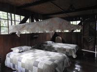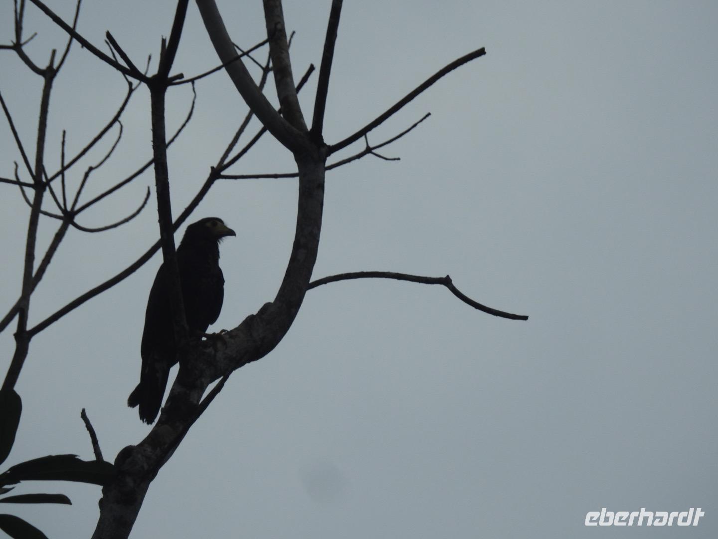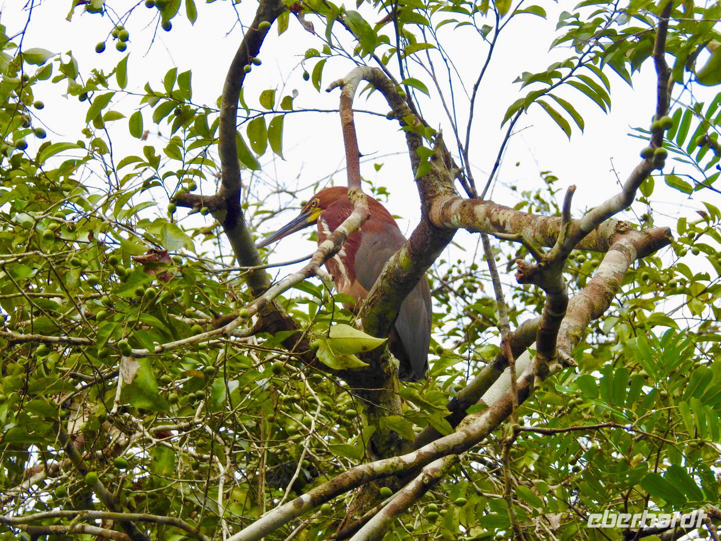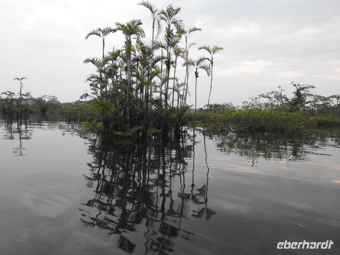 Der Regen hat nachgelassen und wir fahren zurück zur Lodge. Nach dem Abendessen steigen wir wieder ins Boot. Ein letztes Mal suchen wir nach Affen, Faultieren und Vögeln. Die Sonne geht unspektakulär unter. Es ist zu wolkig. Zum Abschluss unternehmen wir eine Nachtwanderung durch den finsteren Regenwald. In der Nacht sieht alles ganz anders aus und auch die Geräuschkulisse ist eine andere. Insekten tanzen im Licht unserer Taschenlampen, die großen Tiere schlafen. Irgendwann lässt Kurt uns die Lampen ausmachen und wir lassen die seltsame Atmosphäre auf uns wirken. Nur hören, fühlen und riechen. Zu sehen ist nichts. Endlich ist der Spuk vorbei und wir fahren zurück in die Lodge. Ab ins Bett, morgen müssen wir früh raus.