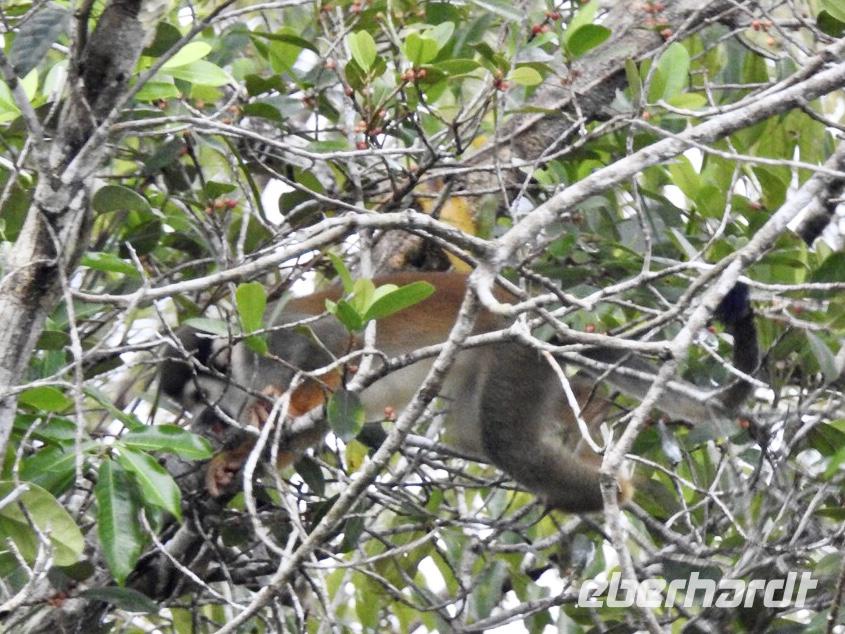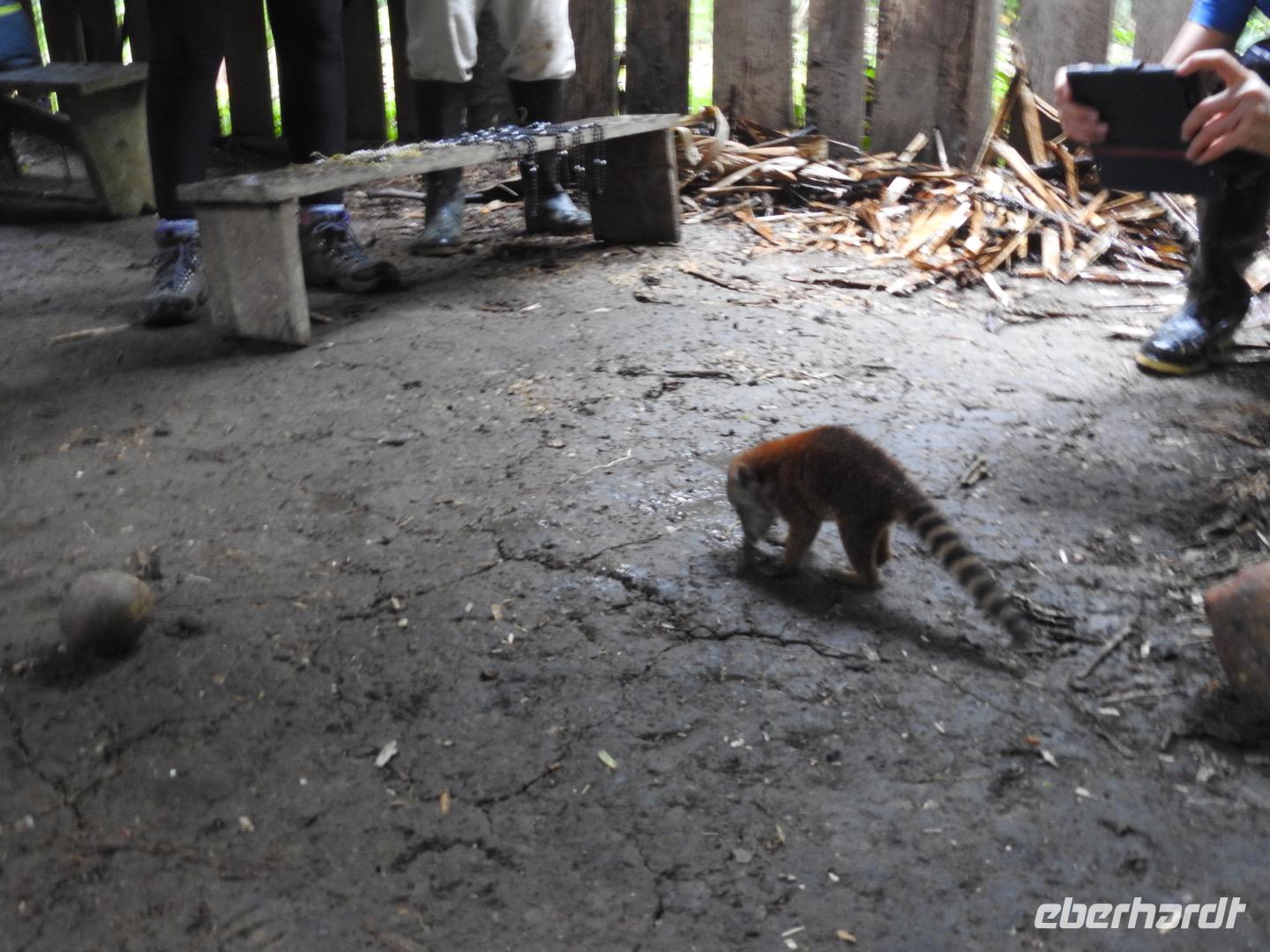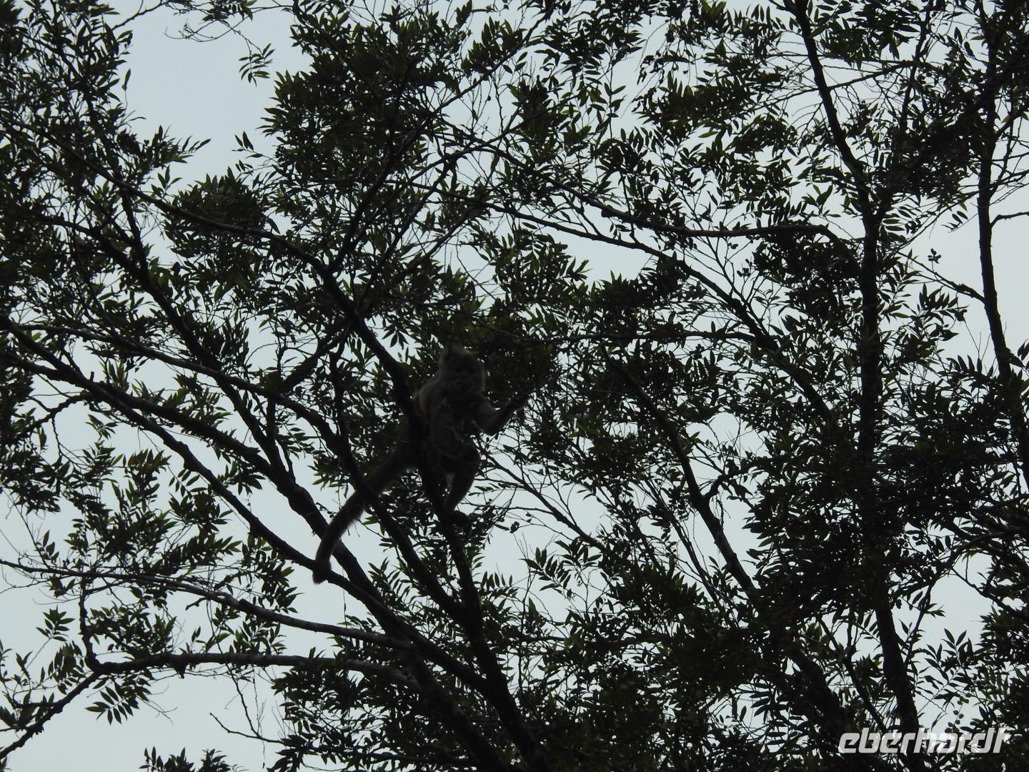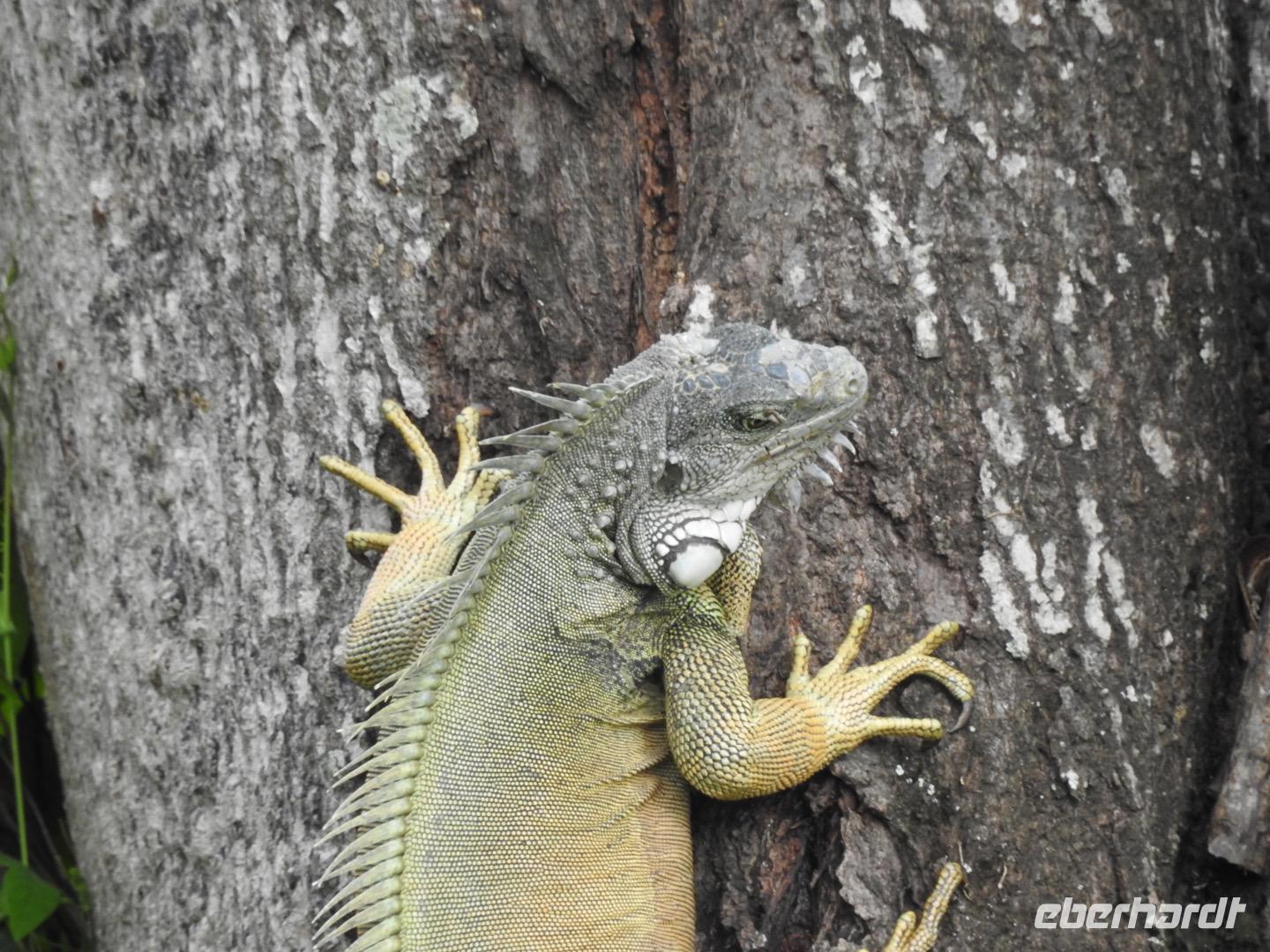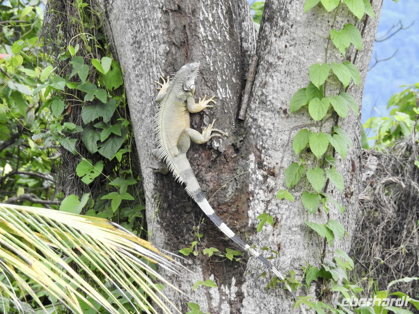 Wir nutzen den Tag und unternehmen einen Ausflug in ein Eco-Reservat in Naranjal. Wir spazieren durch dichten Dschungel und werden heftig von Moskitos attackiert. Naj, der Eine mehr, der andere weniger. Mit etwas Glück entdecken wir eine Affenfamilie - Mutter mit Kind und offensichtlich der dazu gehörende Vater. Die nächste Wanderung geht durch einen Mangrovenwald. Zum Mittagessen sind wir auf der Kakaoplantage eingealden, die wir von gestern schon kennen. Auf dem Rückweg in die Stadt entdeckt Walter am Wegesrand bzw. auf einem Baum eine große Echse. Ein Minitrostpflaster für unser entgangenes Galapagos-Erlebnis.