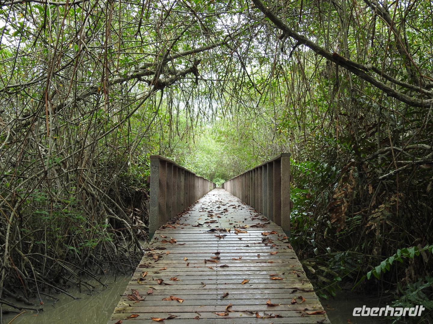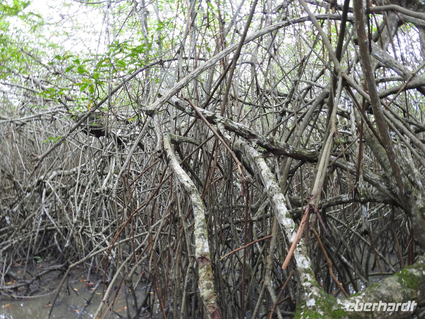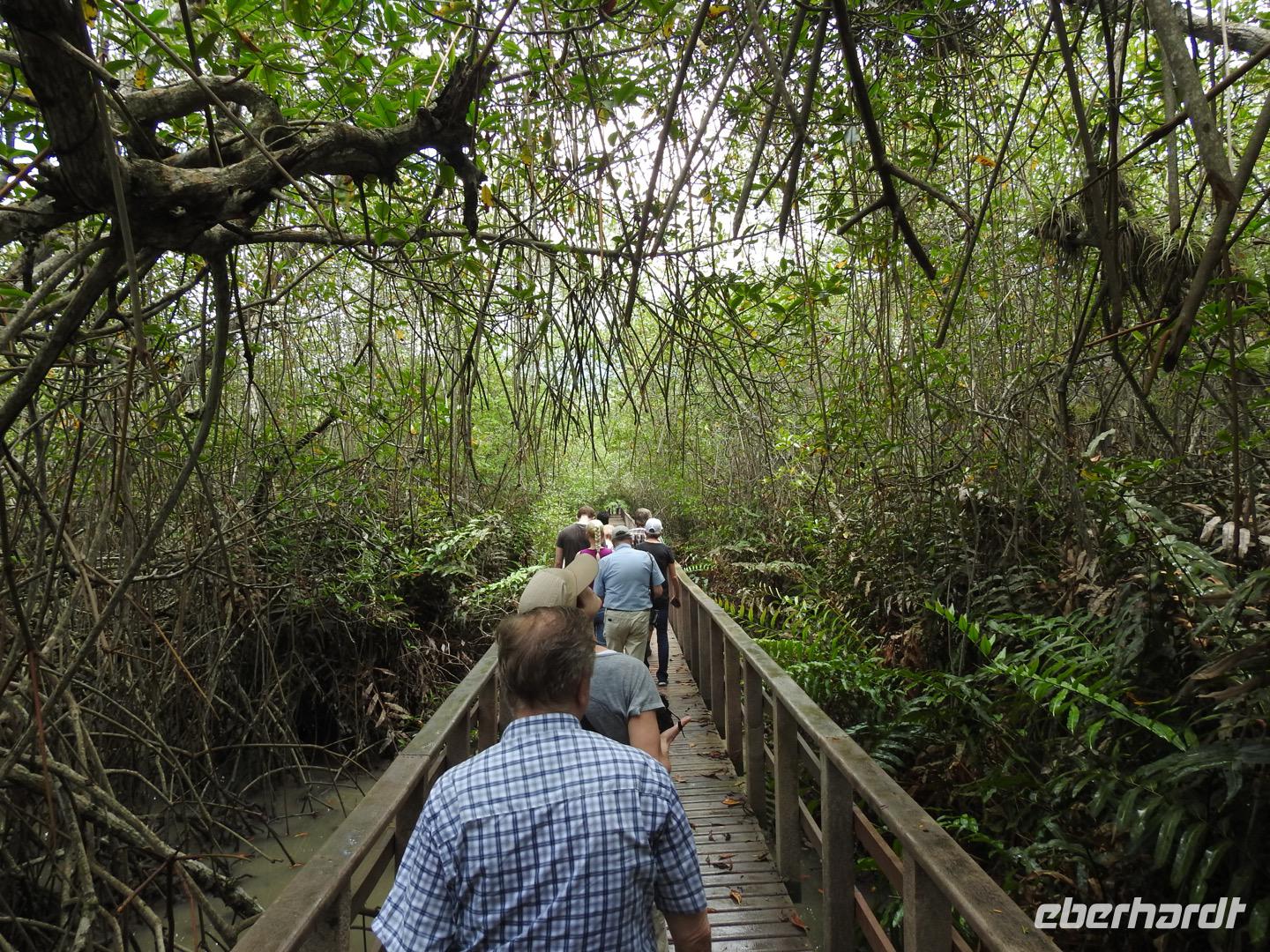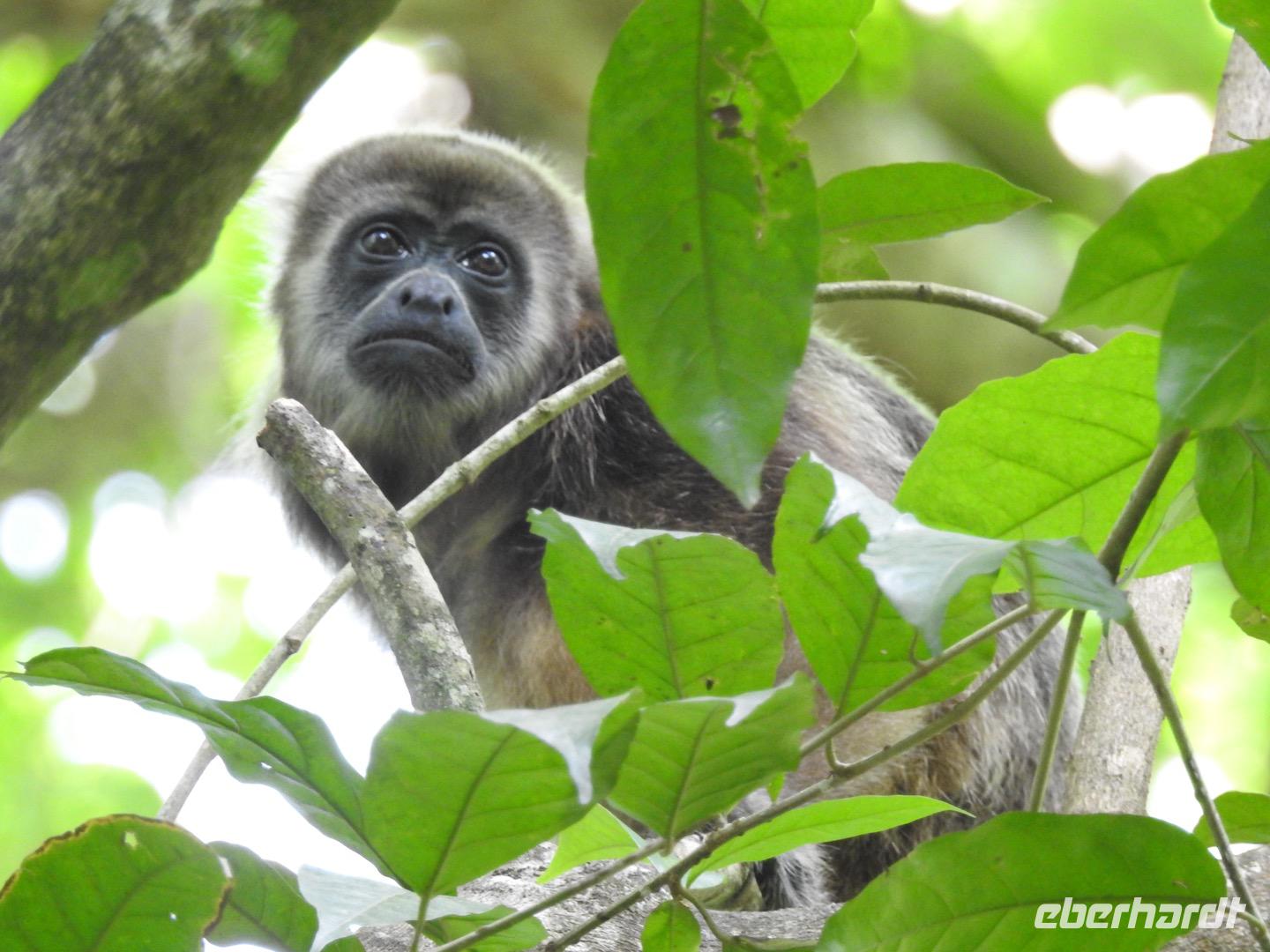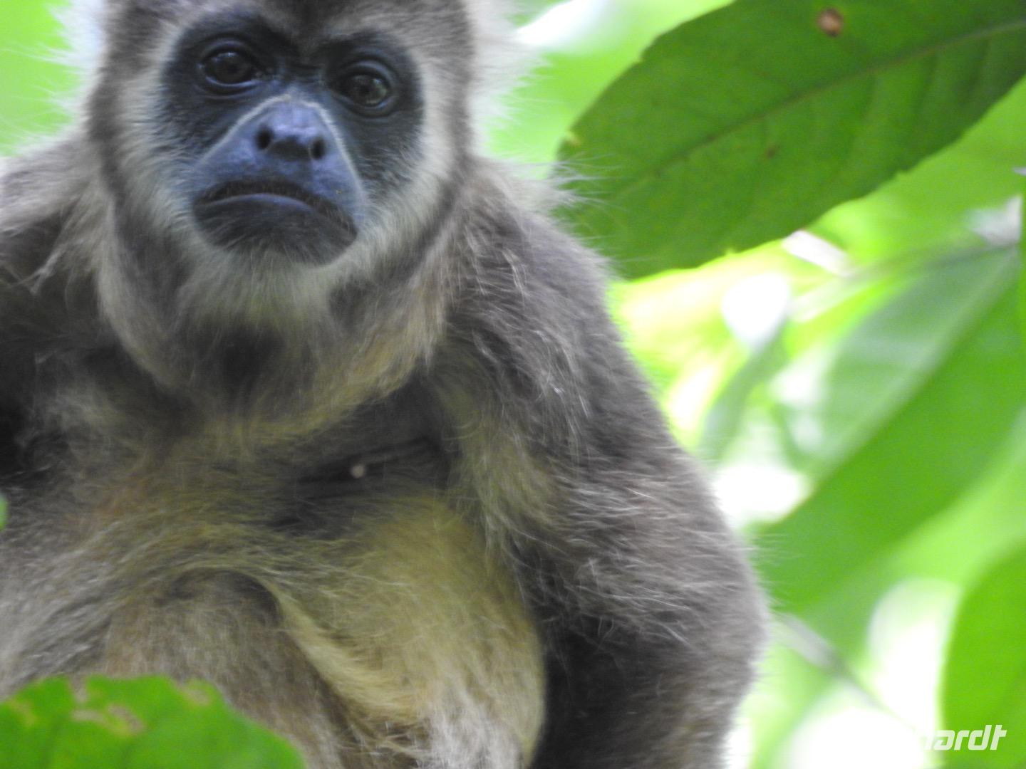 Wir nutzen den Tag und unternehmen einen Ausflug in ein Eco-Reservat in Naranjal. Wir spazieren durch dichten Dschungel und werden heftig von Moskitos attackiert. Naj, der Eine mehr, der andere weniger. Mit etwas Glück entdecken wir eine Affenfamilie - Mutter mit Kind und offensichtlich der dazu gehörende Vater. Die nächste Wanderung geht durch einen Mangrovenwald. Zum Mittagessen sind wir auf der Kakaoplantage eingealden, die wir von gestern schon kennen. Auf dem Rückweg in die Stadt entdeckt Walter am Wegesrand bzw. auf einem Baum eine große Echse. Ein Minitrostpflaster für unser entgangenes Galapagos-Erlebnis.
