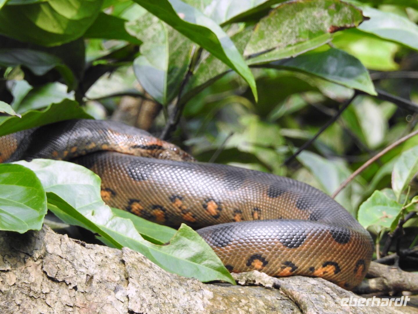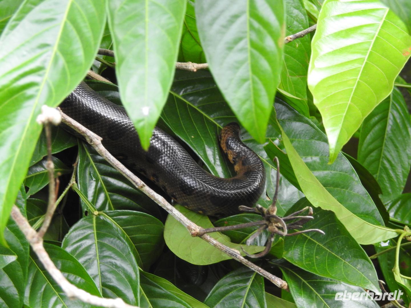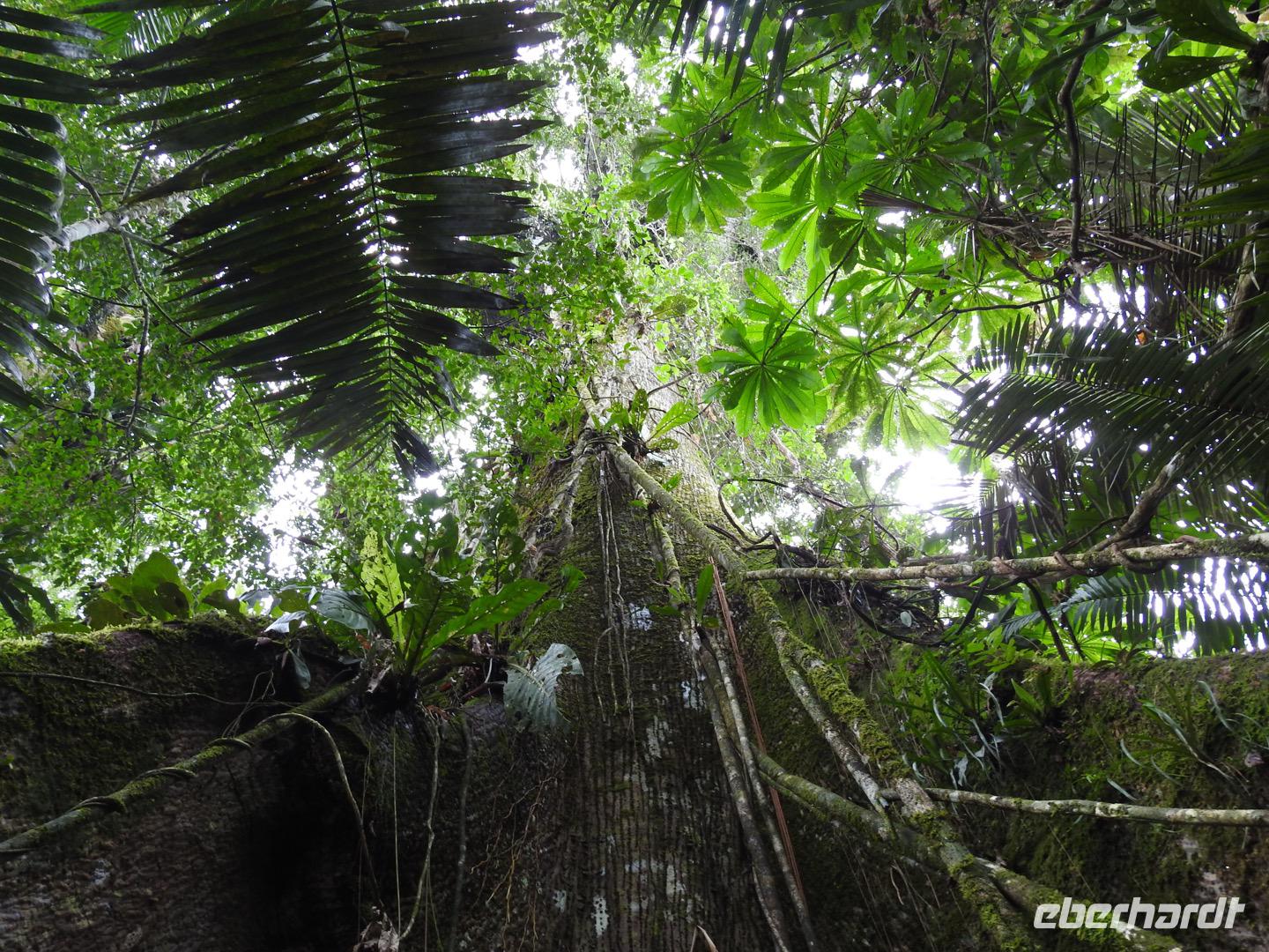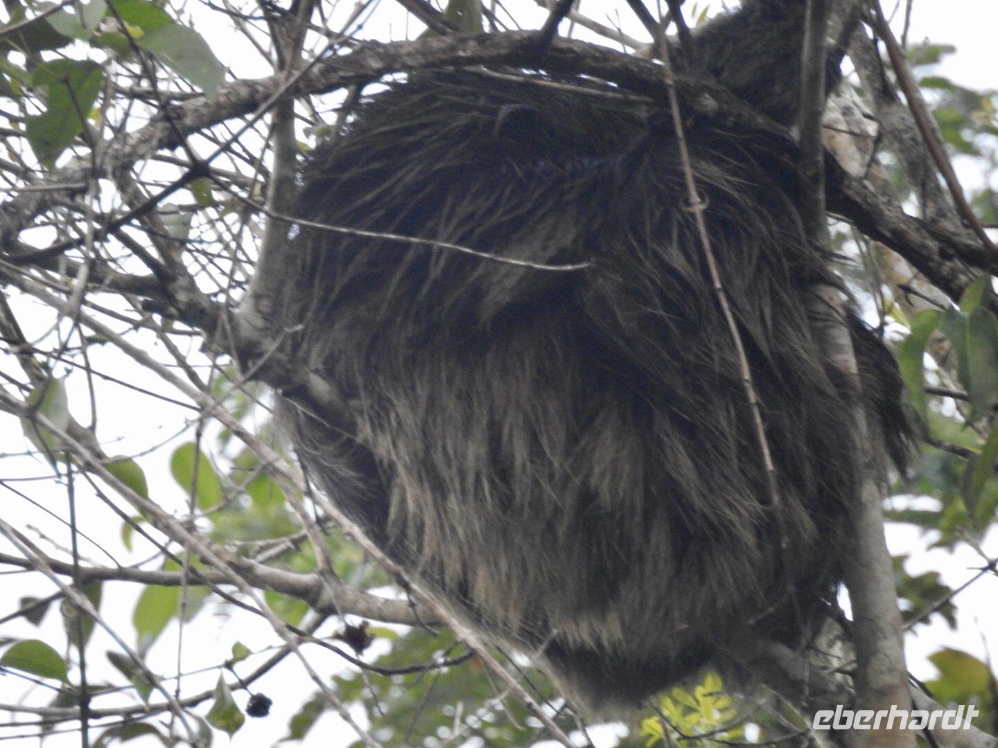 Am Vormittag fahren wir mit dem Boot in die andere Richtung. Wir lassen uns Zeit und uns gelingt es nun auch, selbst Vögel, Affen und andere Tiere auszumachen. Unser Blick hat sich geschärft. Im dichten Ufergestrüppt sonnt sich eine kleine Boa, die Fauchhühner schauen nach wie vor etwas irritiert aus der Wäsche. Ein Faultier liegt faul in den Ästen und so vergeht die Zeit. Mittags steigen wir kurz aus, um die riesigen Kapok Bäume zu bewundern. Hier nehmen wir auch unser Picknick ein, es gibt Reis und Bohnen.
