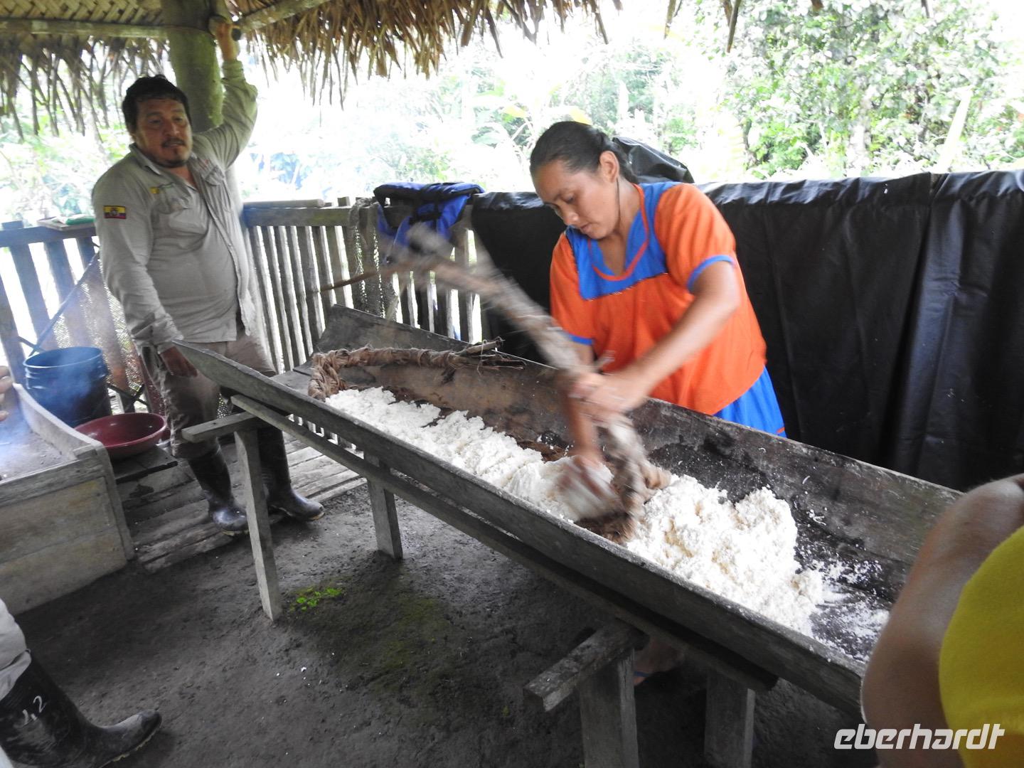 Wir danken unserem Schamanen und verabschieden uns. Es regnet weiter in Strömen. Gut verpackt in unsere schwarzen Regenponchos klettern wir in unser Boot. Um uns vor dem Regen zu schützen, müssen wir ganz tief in die Ponchos kriechen und die Kapuze weit über den Kopf ziehen. Nach etwa einer Viertelstunde erreichen wir das nächste Dorf. Hier sind wir bei einer Familie zu Gast. Eine junge Frau führt uns in einen Garten und zeigt uns, wie Maniok geerntet wird. Dabei müssen die Wurzeln der Maniokpflanze mit einem Ruck aus der Erde gezogen werden. Das probieren unsere Männer gleich mal aus. Die Knollen, die an den Wurzeln hängen, sind das, was verarbeitet und gegessen wird. Jeder von uns bekommt eine Knolle in die Hand mit dem Auftrag, diese abzuschälen. Die Knollen werden nun gewaschen und geraspelt. Auf einer Feuerstelle steht ein rundes Tablett, das als Pfanne dient. Unsere Gastgeberin verteilt die Maniokraspeln gleichmäßig darauf und backt einen leckeren Fladen, den wir sofort verkosten dürfen.