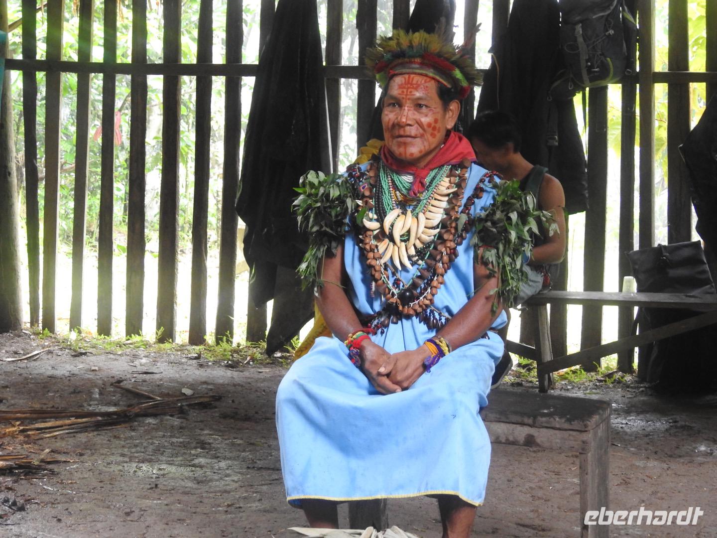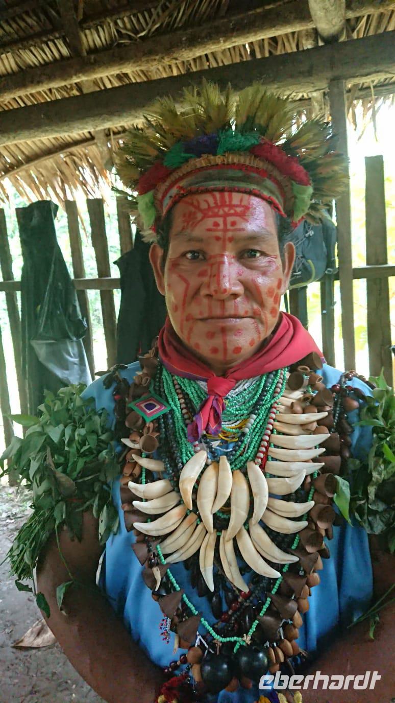 Wir setzen unsere Tour fort und besuchen einen Schamanen. Er heißt Thomas und hat sich für uns seine zeremonielle Kleidung angezogen und sein Gesicht angemalt. Wir dürfen ihn nach Herzenslust fotografieren, allerdings stiehlt ihm zunächst ein kleiner Ameisenbär die Show. Es regnet wie verrückt. Kurt versucht uns irgendwie in der Hütte zu platzieren, was gar nicht so einfach ist, denn das Dach ist von einem umgestürzten Baum zerstört und es regnet überall rein. Schamane Thomas berichtet über sein Leben und wie er zu einem Schamanen wurde. Anschließend demonstriert er am lebenden Objekt (also an Freiwilligen von uns) wie er mit Handauflegen und Schnalzgeräuschen herausfindet, ob er seinem Patienten helfen kann oder nicht.