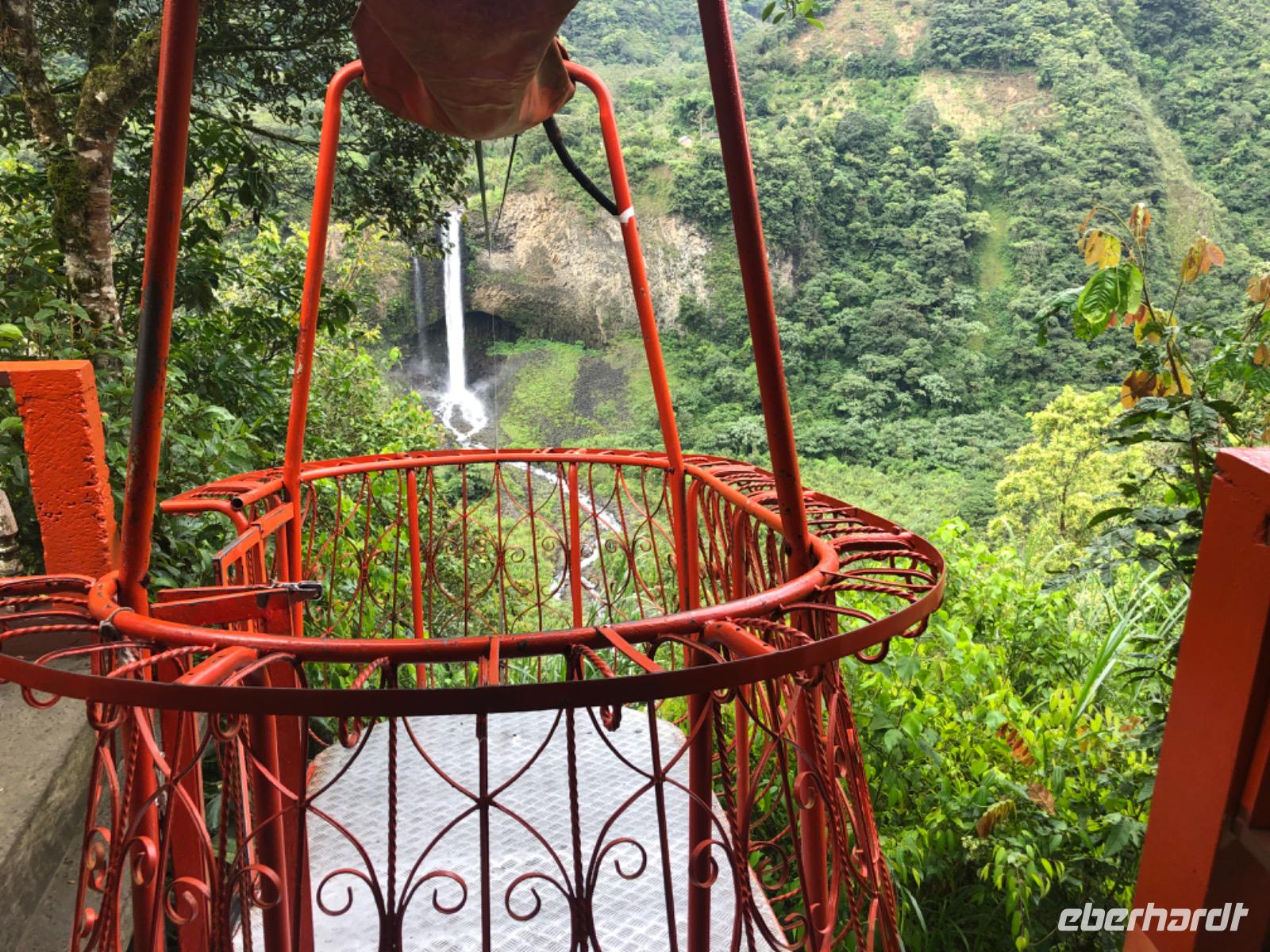 Spontan beschließen wir, heute Vormittag einen zusätzlichen Ausflug zu unternehmen. In der Nähe von Banos befindet sich eine beeindruckende Schlucht, die mit einer Gondel überquert werden kann. Die Region wird auch Avenue der Wasserfälle genannt, weil es von eben diesen hier so viele gibt. Gestern Abend haben wir in Banos viele kleine Reiseagenturen gesehen, die abenteuerliche Ausflüge in die Umgebung anbieten. Dazu gehört eben auch die Überquerung der Schlucht. Die Gondel macht einen eher zweifelhaften Eindruck und der Kollege, der die Bahn bedient, muss auch erst geweckt werden. Doch dann geht es endlich los. Vier Unternehmungslustige und Linda wagen den ersten Versuch. Die Gondel schaukelt ein bisschen, dafür ist die Aussicht atemberaubend. Am Wasserfall stoppt die Gondel kurz, ruckt dann hart an und fährt bis zur anderen Seite weiter. Von dort geht es dann direkt auf dem gleichen Weg zurück. Alternativ bietet sich die Möglichkeit, an einer Zipline die Schlucht zu erleben. Auch dafür finden sich zwei Verrückte. Bäuchlings werden sie an ein Seil geknüpft und fliegen dann frei wie ein Vogel (und mit lautem Geschrei) auf die andere Seite und wieder zurück. Adrenalin pur.