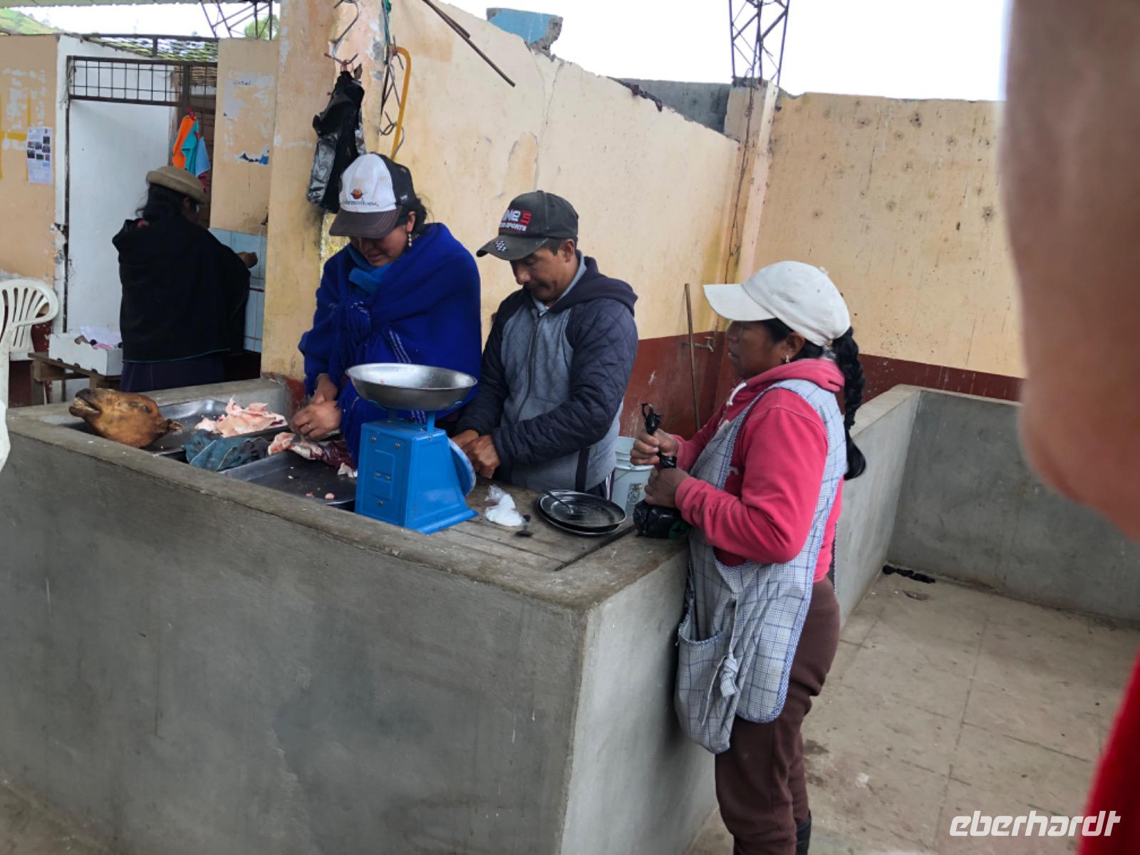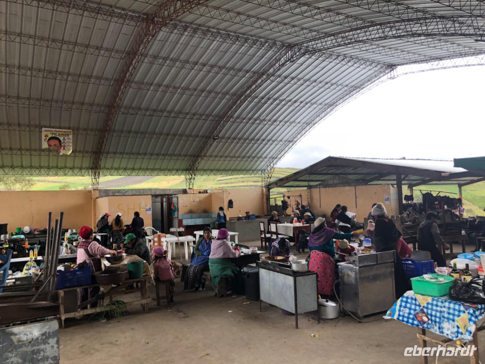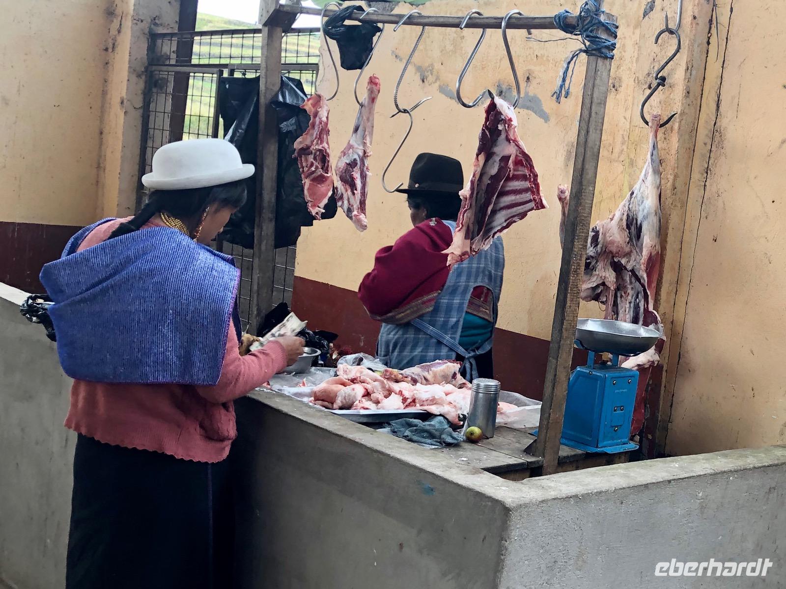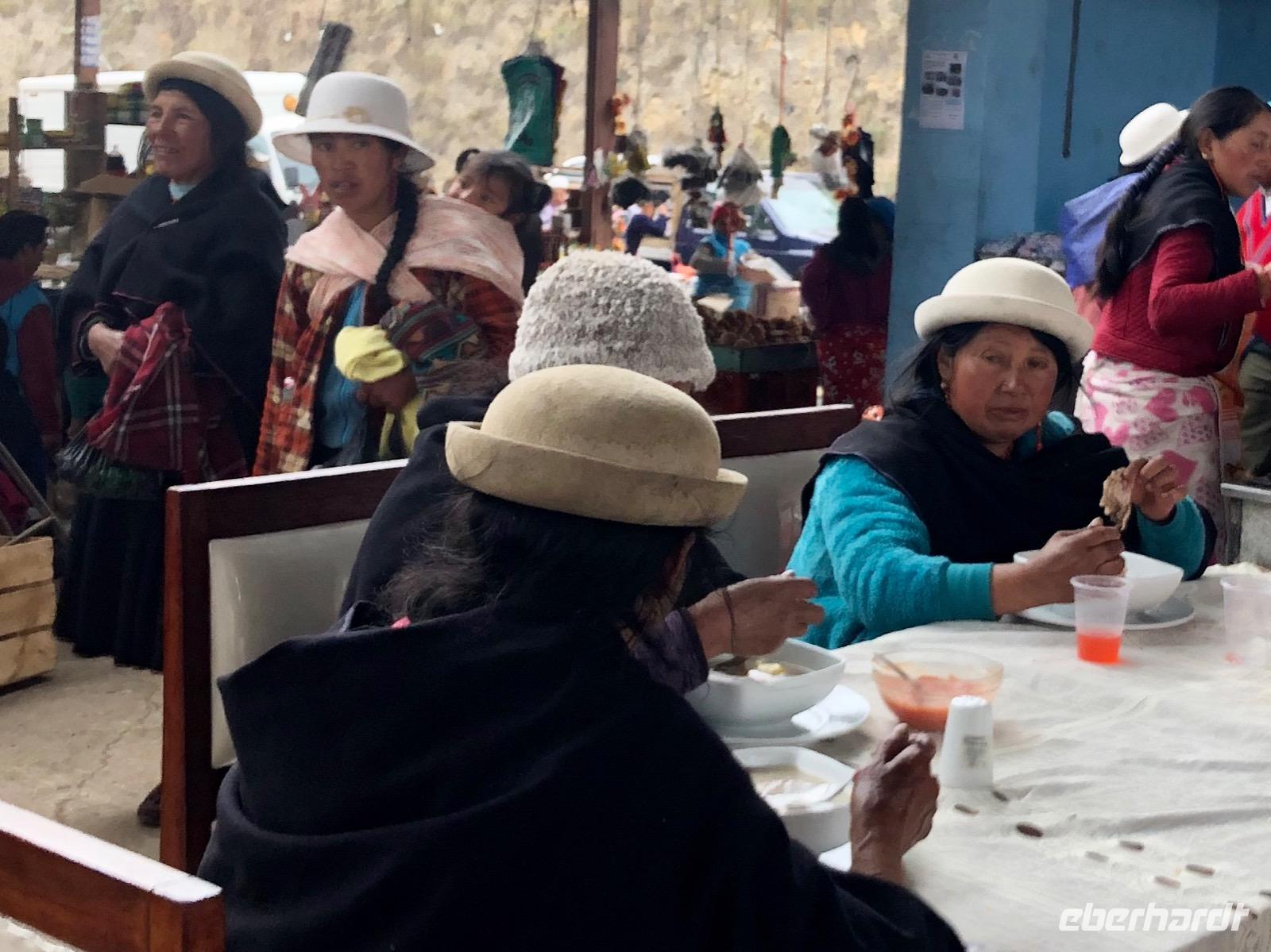 Wir machen uns jetzt auf den Weg zum Chimborazo. Unterwegs durchqueren wir einige Dörfer und kommen an Großmärkten vorbei. Wir sind in einer Region, die reich an Obst und Gemüse ist. An einem Markt, der nur von der indigenen Bevölkerung besucht wird, halten wir an. Wir sind hier die Außerirdischen, Gringos verlaufen sich nur selten hierher. Man beäugt sich gegenseitig und wir versuchen, unauffällig ein paar Fotos zu erhaschen. Ich glaube, die Leute waren froh, als wir wieder weg waren. Wer lässt sich schon gern von Touris beim Mittagessen zusehen (und fotografieren).