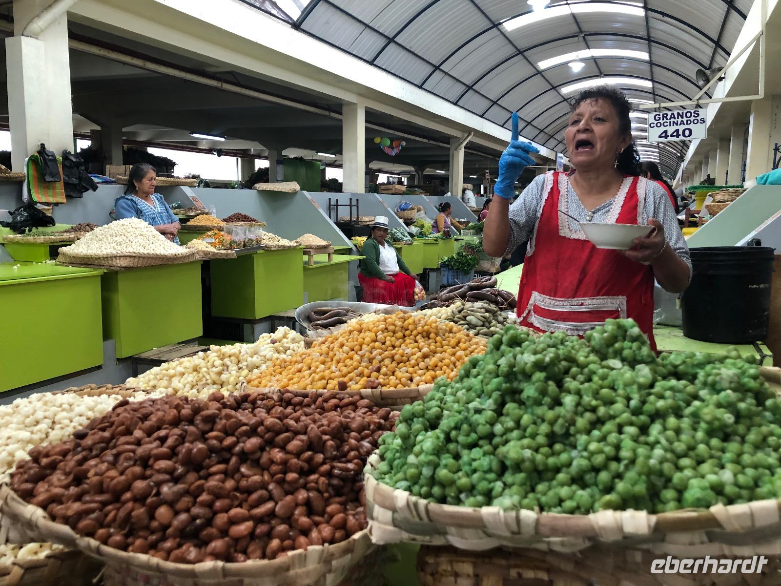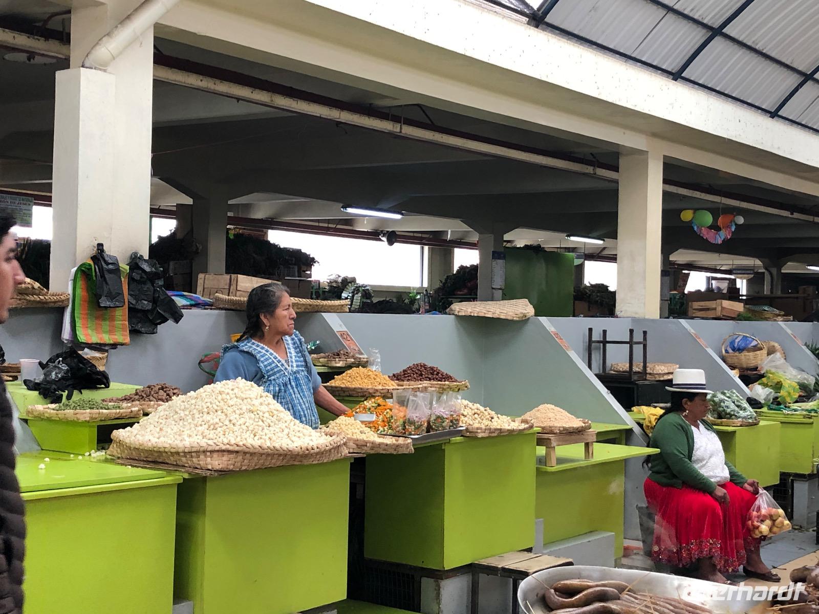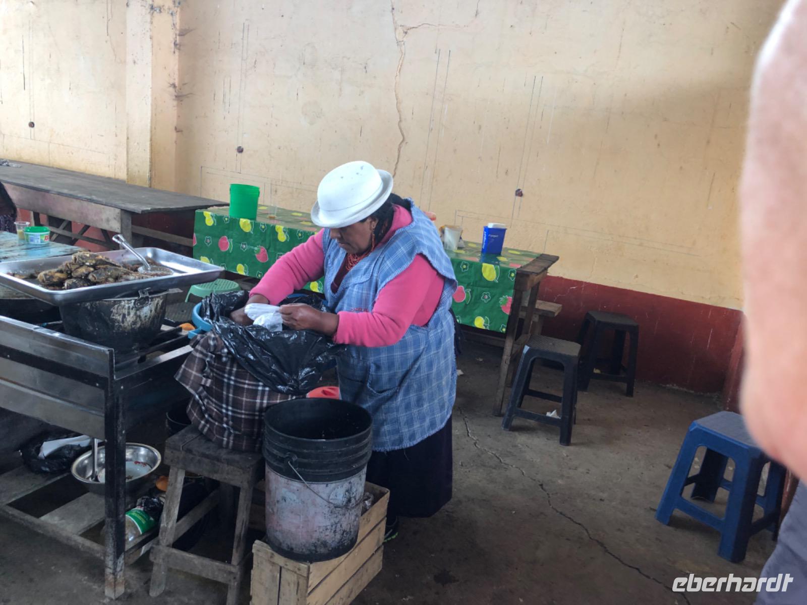 Wir machen uns jetzt auf den Weg zum Chimborazo. Unterwegs durchqueren wir einige Dörfer und kommen an Großmärkten vorbei. Wir sind in einer Region, die reich an Obst und Gemüse ist. An einem Markt, der nur von der indigenen Bevölkerung besucht wird, halten wir an. Wir sind hier die Außerirdischen, Gringos verlaufen sich nur selten hierher. Man beäugt sich gegenseitig und wir versuchen, unauffällig ein paar Fotos zu erhaschen. Ich glaube, die Leute waren froh, als wir wieder weg waren. Wer lässt sich schon gern von Touris beim Mittagessen zusehen (und fotografieren).