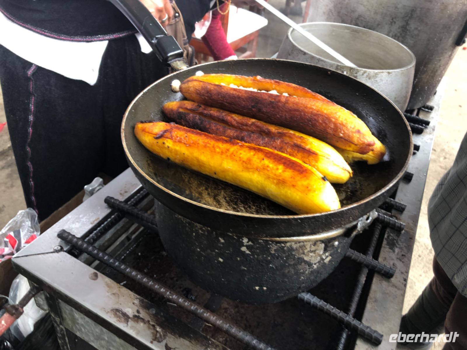 Den nächsten Stopp legen wir an einer Stelle ein, an der einige Frauen Maiskolben und Bananen grillen. Hier kommen wir ins Geschäft und stellen fest, wie gut das Angebotene schmeckt.