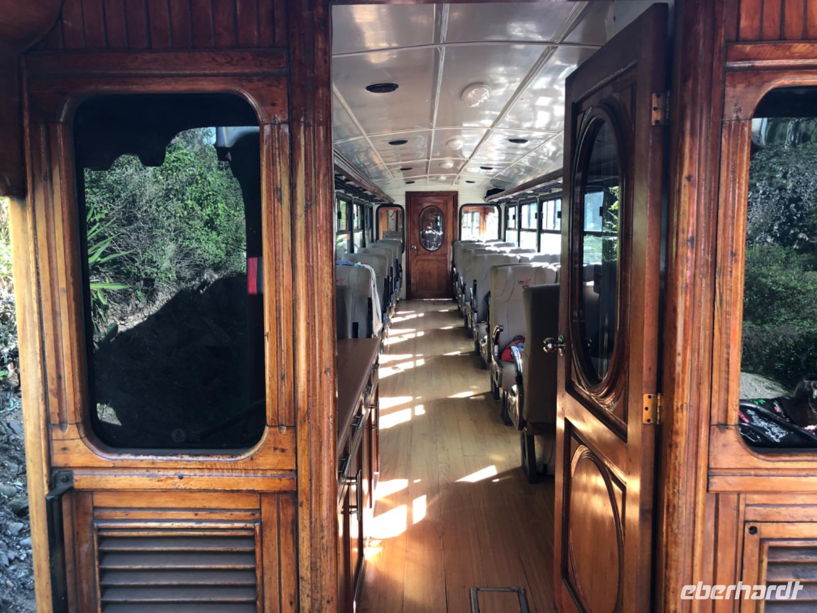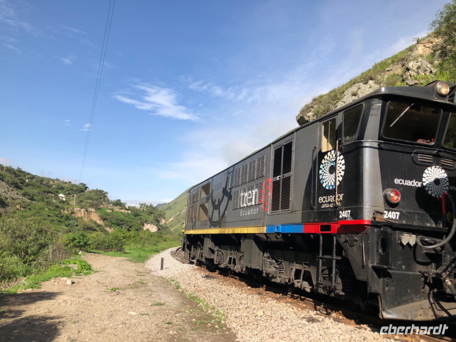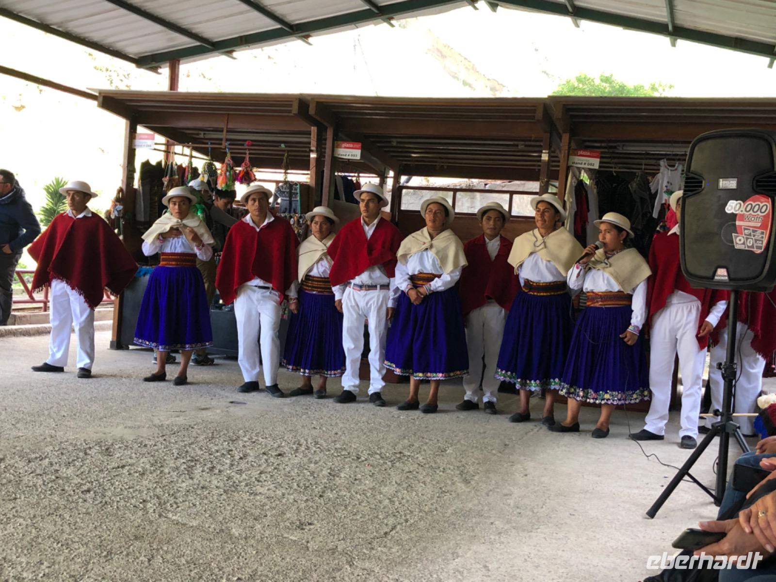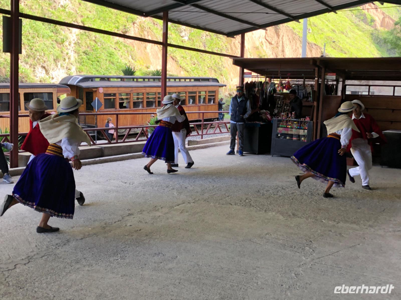 In Alausi steigen wir in die Transandenbahn. Diese wurde ursprünglich für den Transport von Waren gebaut, ist aber heute eine beliebte Touristenattraktion. Die Aussichten während der Fahrt sind grandios und eine junge engagierte Reiseführerin der Bahngesellschaft erklärt, was es links und rechts zu sehen gibt. Nach einer halben Stunde steigen wir zu einem Fotostopp aus. Dann geht es zurück bis nach Chunchi. Hier haben wir einen Aufenthalt von einer Stunde. Eine indigene Tanzgruppe präsentiert lokale Tänze und lädt zum Mittanzen ein. Es gibt ein kleines Museum, einen Souvenirshop und ein Café. Die Sonne scheint, die Umgebung ist toll, schöner kann's kaum sein.