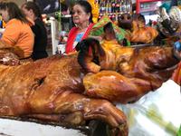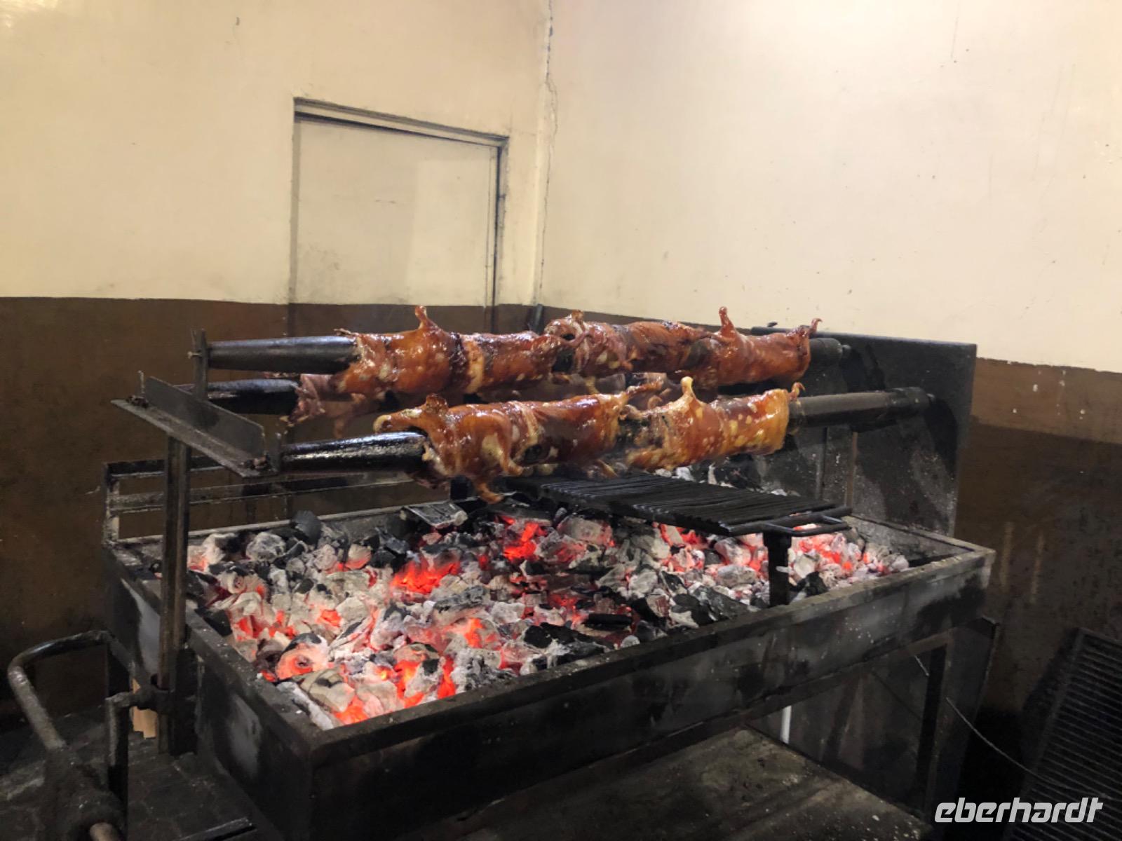 Am Abend hat Linda noch etwas Besonderes für uns geplant. Wir gehen Meerschweinchen essen. In Cuenca wird das als Spezialität angeboten. Eine Mahlzeit mit einem Schweinchen, Kartoffeln, Soße und Beilagen kostet lockere 24 Dollar. Zuerst dürfen wir einen Blick in die Küche werfen. Dort drehen sich die Spieße. Also, empfidlich sein darf man hier nicht. Nach dem Essen wil Linda noch mit uns ins eine Salsa-Bar gehen. Nur noch vier unternehmungslustige Gäste folgen ihr. Und das auch noch umsonst. Nach einem halbstündigen Marsch im strömenden Regen, müssen wir feststellen, dass Corona auch hier zugeschlagen hat. Die Bars sind geschlossen.