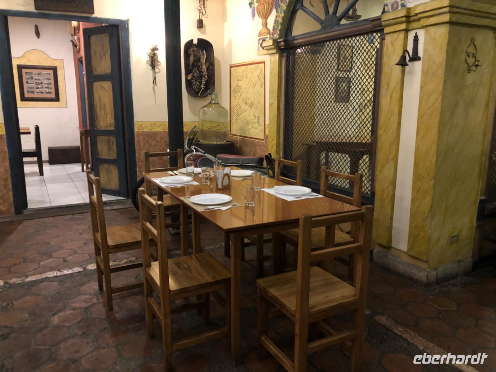 Nun ist es aber Zeit, etwas Handfestes zu verputzen. Gleich im ersten Hof hatten wir ein Restaurant entdeckt, wo wir jetzt zu Abend essen wollen. Aber, Irrtum vom Amt, es hat inzwischen geschlossen. Nun dann, hier gibt es genügend Auswahl, gehen wir eben in ein anderes. Die Bedienung ist freundlich, aber überfordert. Dass wir uns nur schwer mit ihr verständigen können, weil sie kein Wort Englisch spricht und wir kein Spanisch, ist die eine Seite, ihre etwas andere Organisation die Andere. Nicht alle von uns werden glücklich hier. Es ist schon dunkel, als wir zurück zum Plaza Grande laufen. Ab hier nehmen wir ein Taxi, die uns umgebenden Gestalten werden immer unheimlicher.