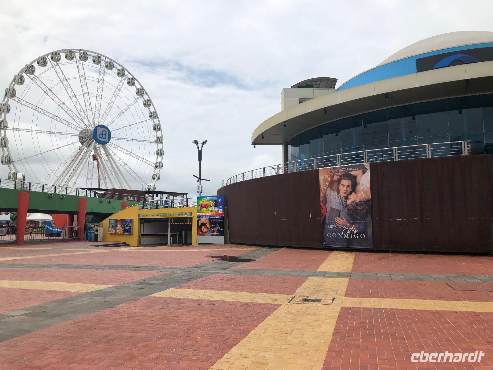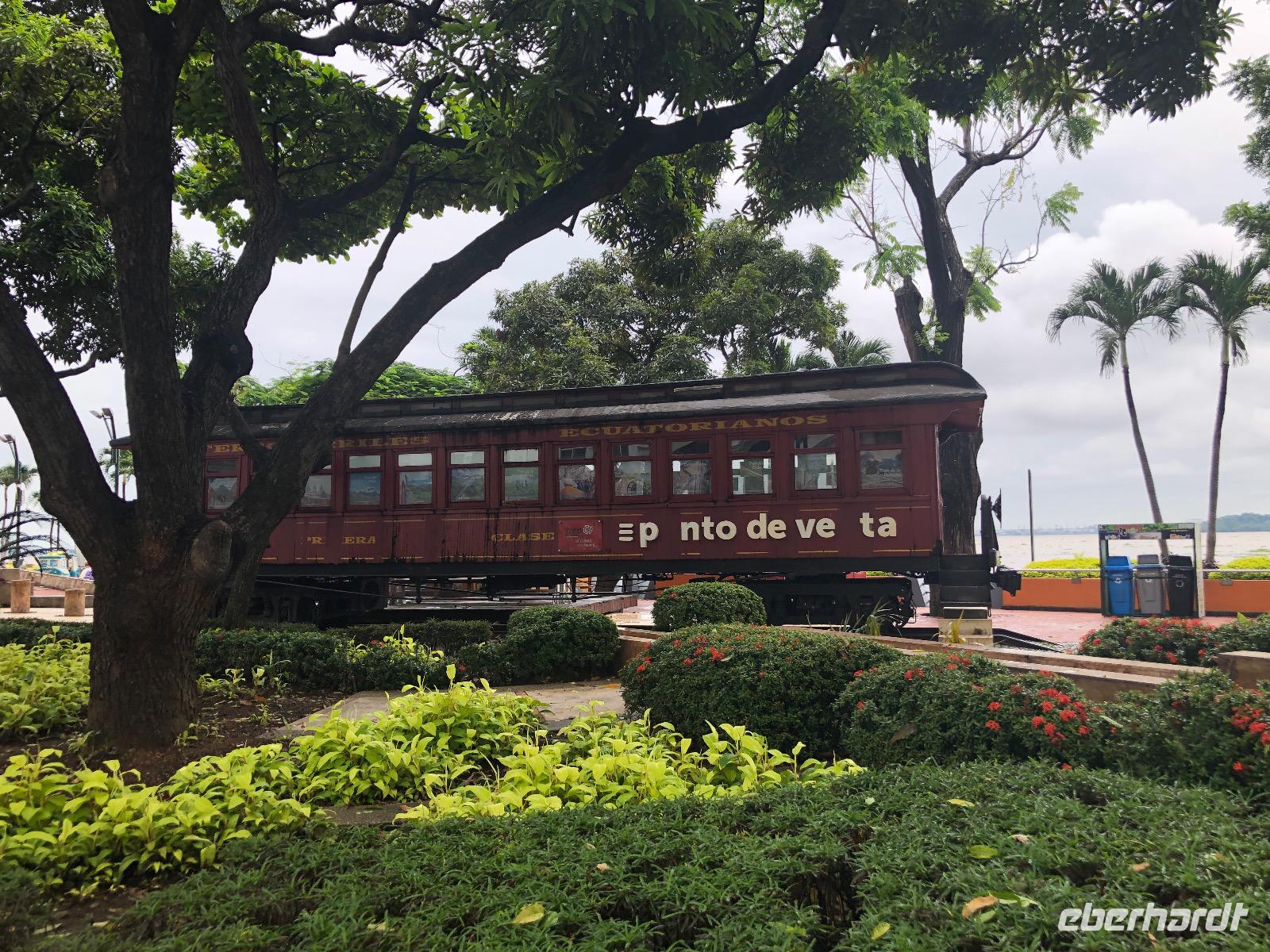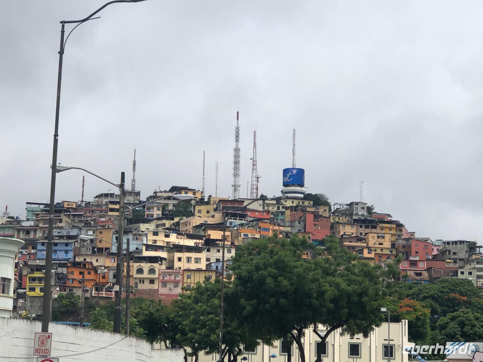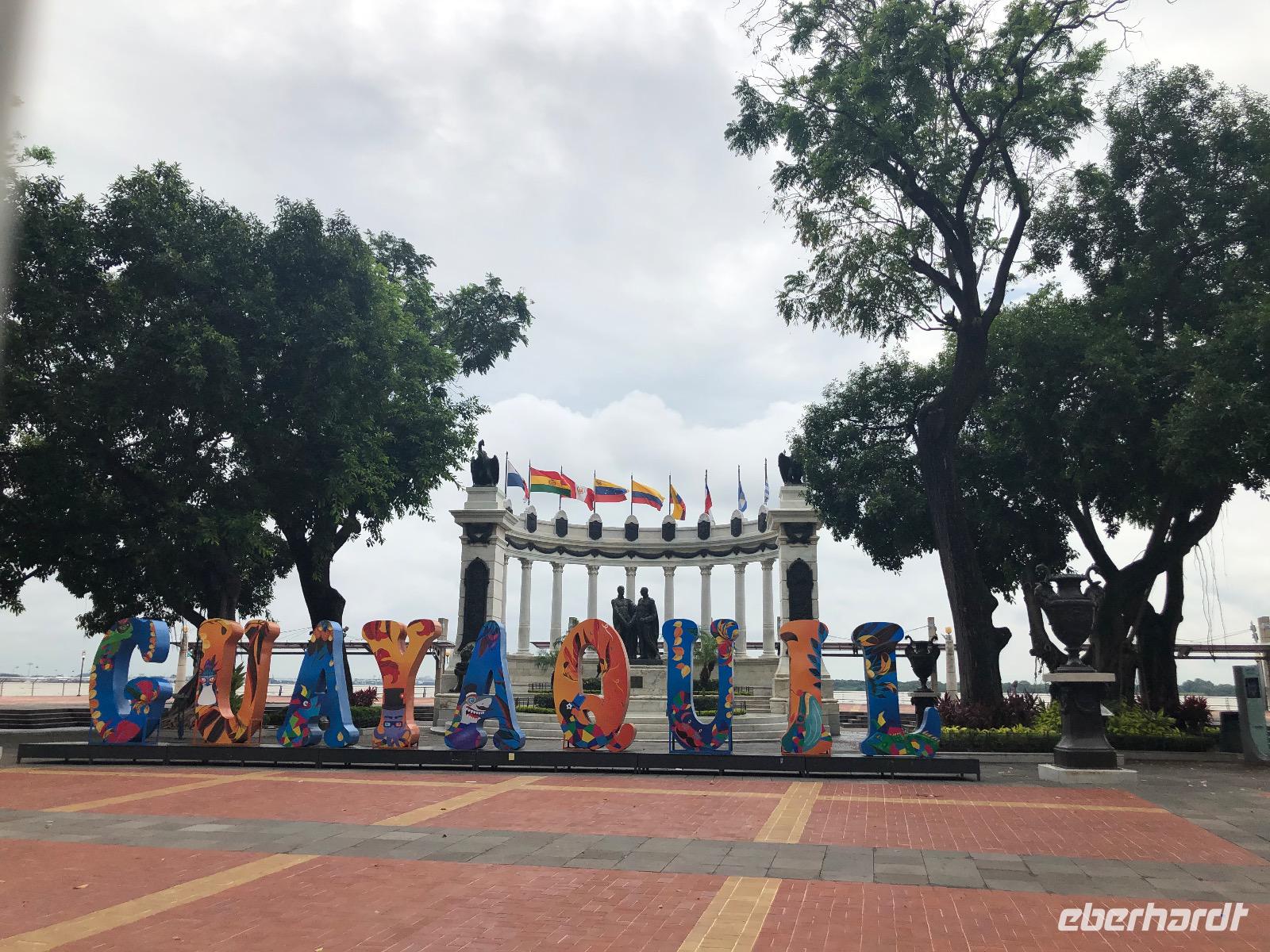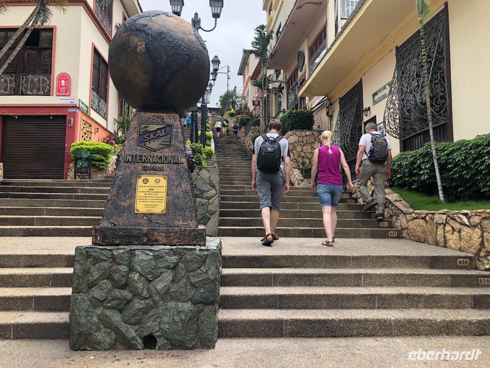 Der Flug geht erst abends und so nutzen wir die Zeit zu einem großen Spaziergang durch Guayaquil. Vorbei geht es an der Universität zum Denkmal für Sucre, einem der Freiheitskämpfer von Ecuador. Wir laufen entlang des Malecon2000, der sonst so belebten Strandpromenade, die aber nun wegen Corona geschlossen ist. Am Ende des Malecon entdecken wir eine Seilbahn, die über den Fluss führt und so neu ist, dass nicht einmal Linda sie kannte. Noch befindet sie sich aber im Probebetrieb. Wir erreichen den Hügel Santa Ana und bewältigen 444 Stufen. Überall sind hier kleine Restaurants, Cafés und Bars und alle sind geschlossen. Wir sind die einzigen Touristen hier. Trotzdem besuchen wir, vom Hügelchen zurück gekehrt, das Künstlerviertel mit seinen pastellfarbenen Häusern. Auch hier ist kein Mensch zu sehen. An einem Café wird die Leuchtreklame abmontiert. Corona möchte hier keiner mehr heißen.