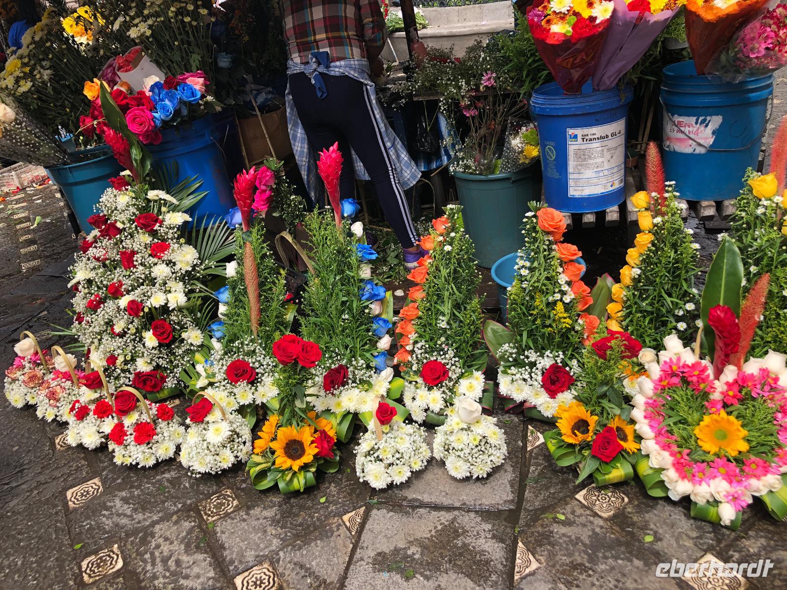 Den Vormittag verbringen in der Stadt. Unsere Koffer und die schweren Rucksäcke konnten wir im Hotel lassen, die bringt Walter nachher mit. Wir gehen zu Fuß. An einigen beeindruckenden Gebäuden vorbei bis zur Kathedrale, die Innen prächtig gestaltet und mit Marmor ausgekleidet ist. Am Blumenmarkt bewundern wir die schönen Gebinde, die hier angeboten werden. Ecuador und vor allem Cuenca sind international für ihren Blumenexport bekannt. Nach dem Blumenmarkt besuchen wir die Markthalle. Eine Händlerin sieht uns schräg an und fragt: Corona? Nachdem wir ihr versichert haben, dass wir alle kern gesund sind, dürfen wir ihre vegetarische Bratwurst kosten, die aus Weißkohl und Kartoffeln hergestellt wird. Lecker. Wir schlendern durch die Abteilungen. Gar nicht vegetarisch geht es im Bereich Schwein zu. An jedem Stand liegt hier ein riesiges im Ofen gebackenes Schwein und wartet auf hungrige Mäuler. Linda versichert uns, dass am Abend alles aufgegessen sein wird. Bevor wir die Markthalle verlassen, gönnen wir uns einen frisch gepressten Saft.