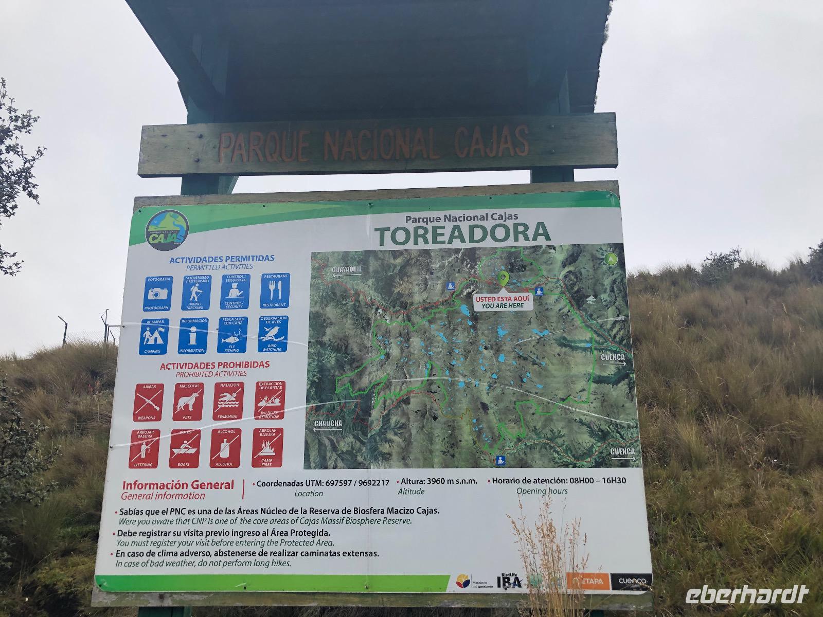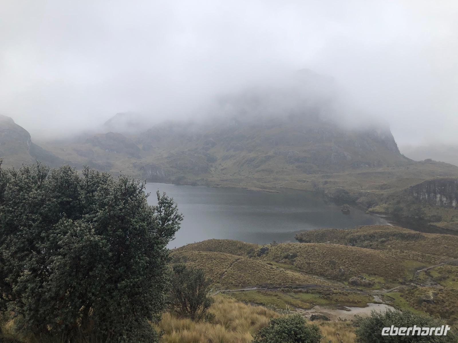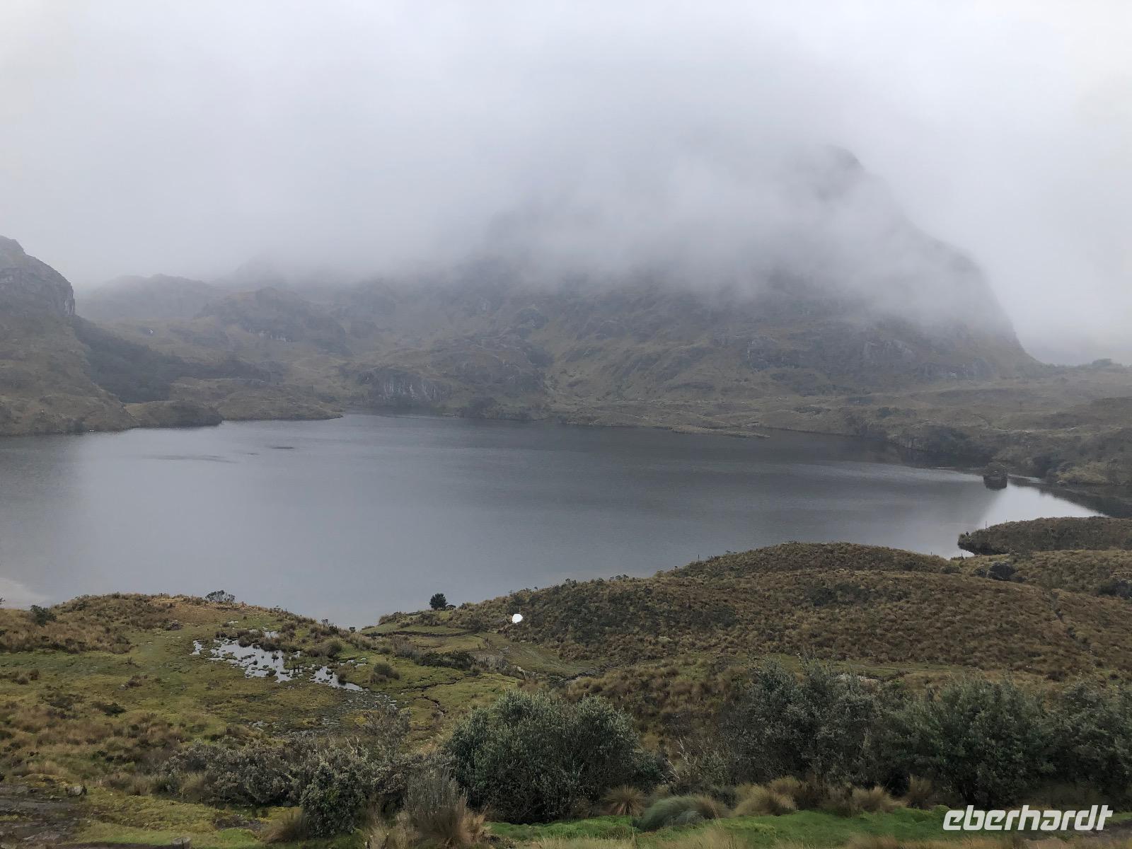Walter sammelt uns ein, wir prüfen, ob alles Gepäck eingeladen ist und weiter gehts. Wir haben einen weiten Weg vor uns. Bald versinkt die Straße im Nebel. Im Nationalpark Cajas, einem wichtigen Biosphärereservat Ecuadors legen wir einen kurzen Fotostopp ein. Gemütlich ist es huer nicht. Es ist der kälteste Ort in Ecuador und durch den Nebel grau in grau. Immerhin sind wir noch 3800 Meter hoch. An einer Tankstelle halten wir, auch, um uns mit einem mittäglichen Imbiss zu versorgen. Es gibt Hühnersuppe mit Einlage.