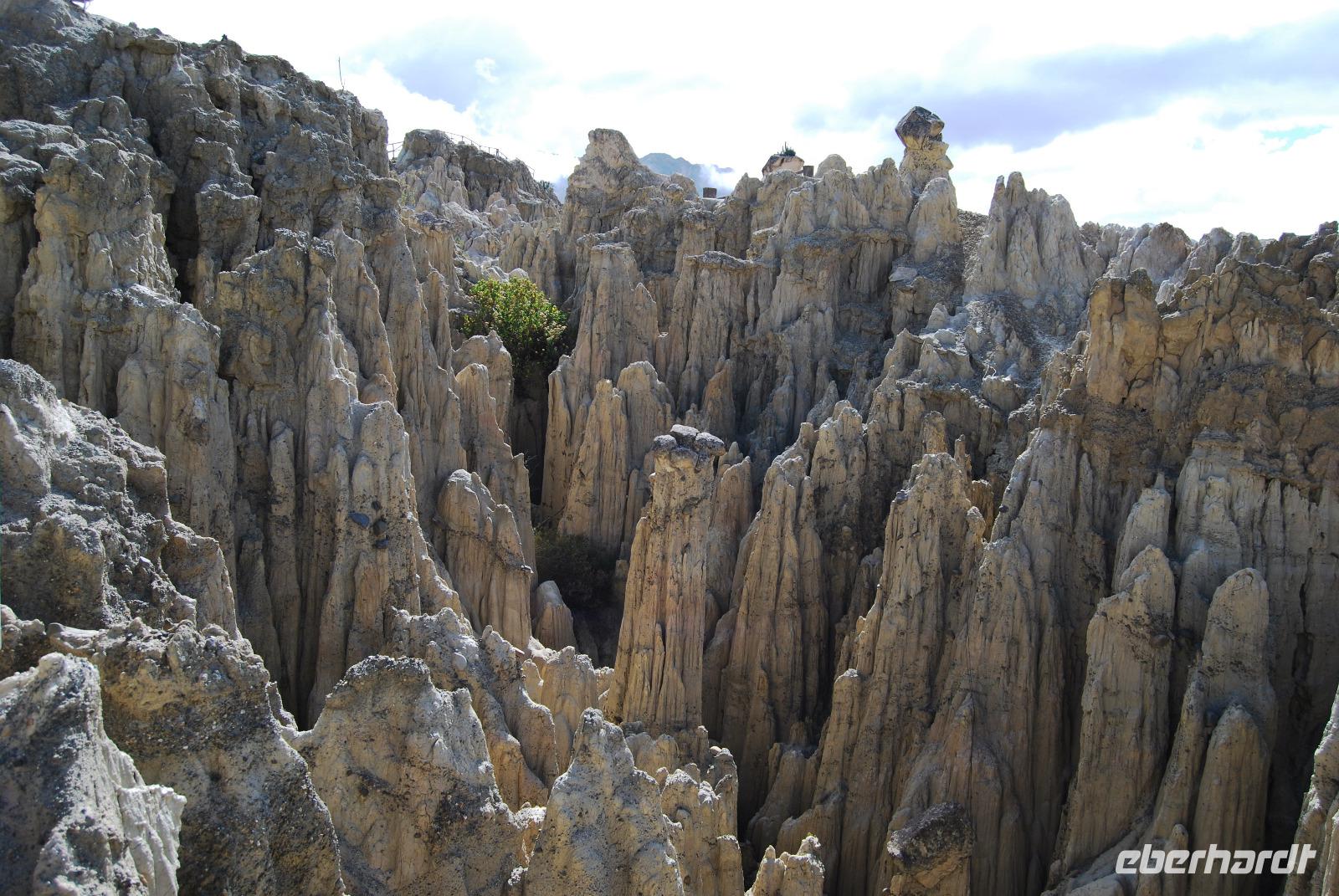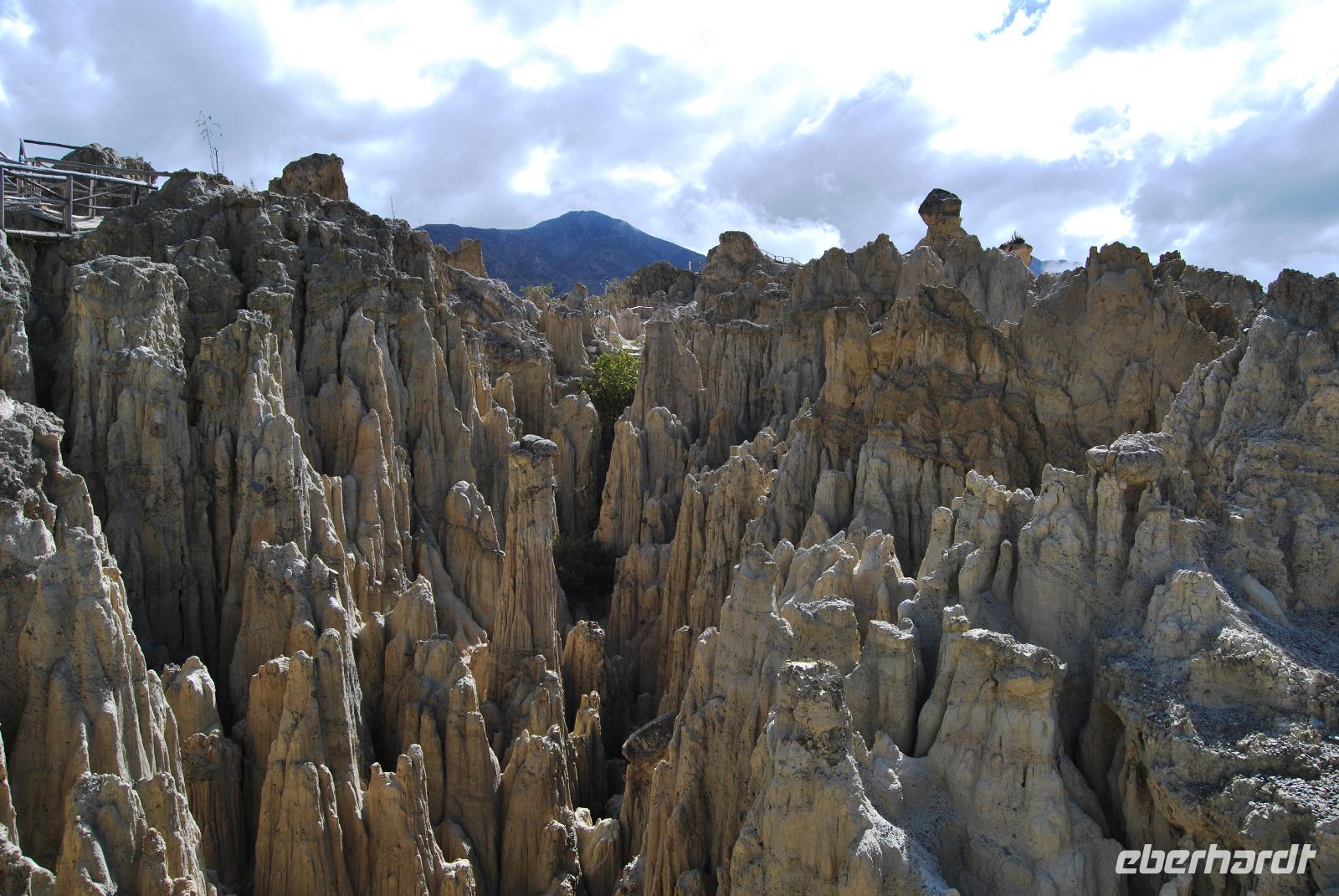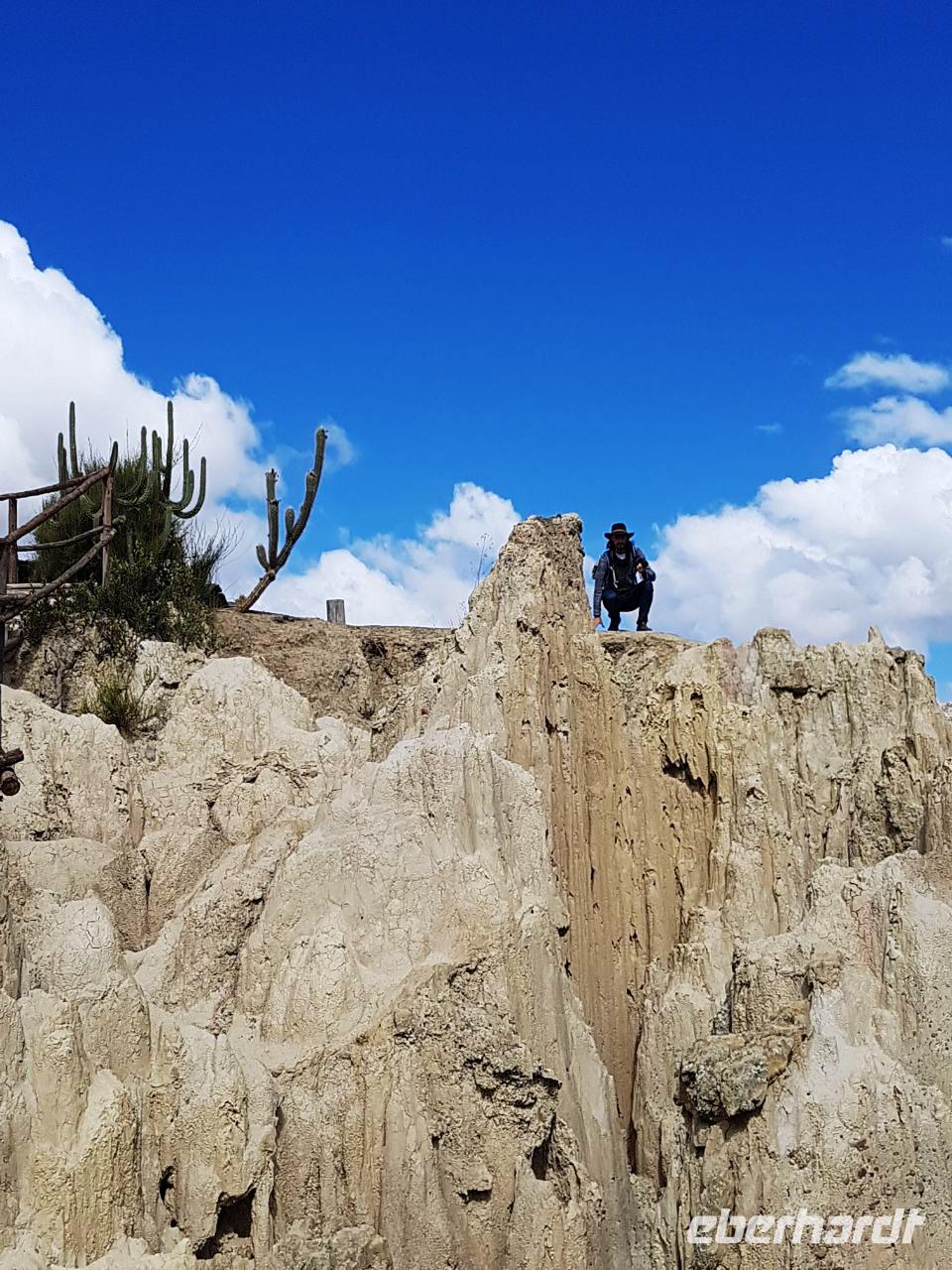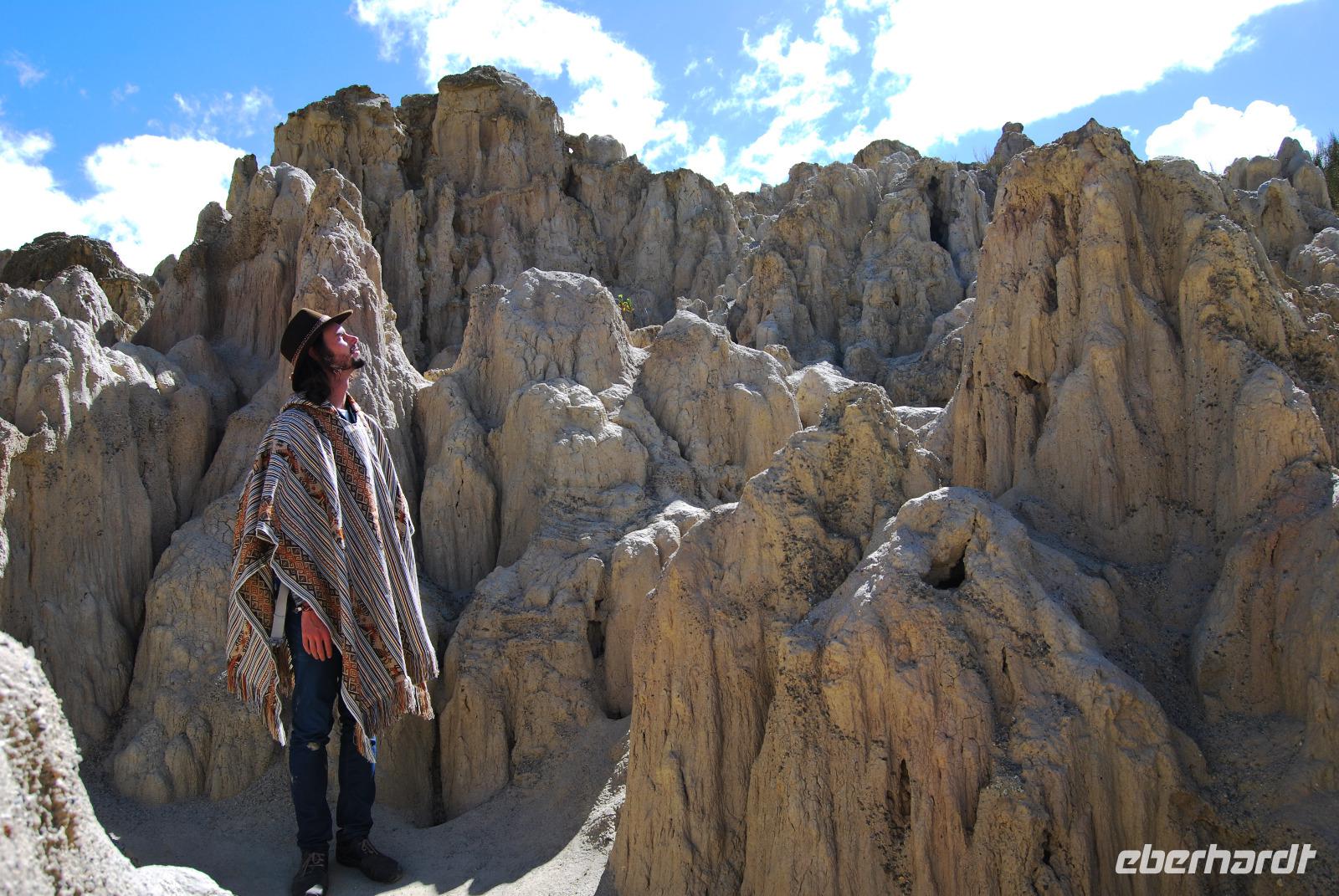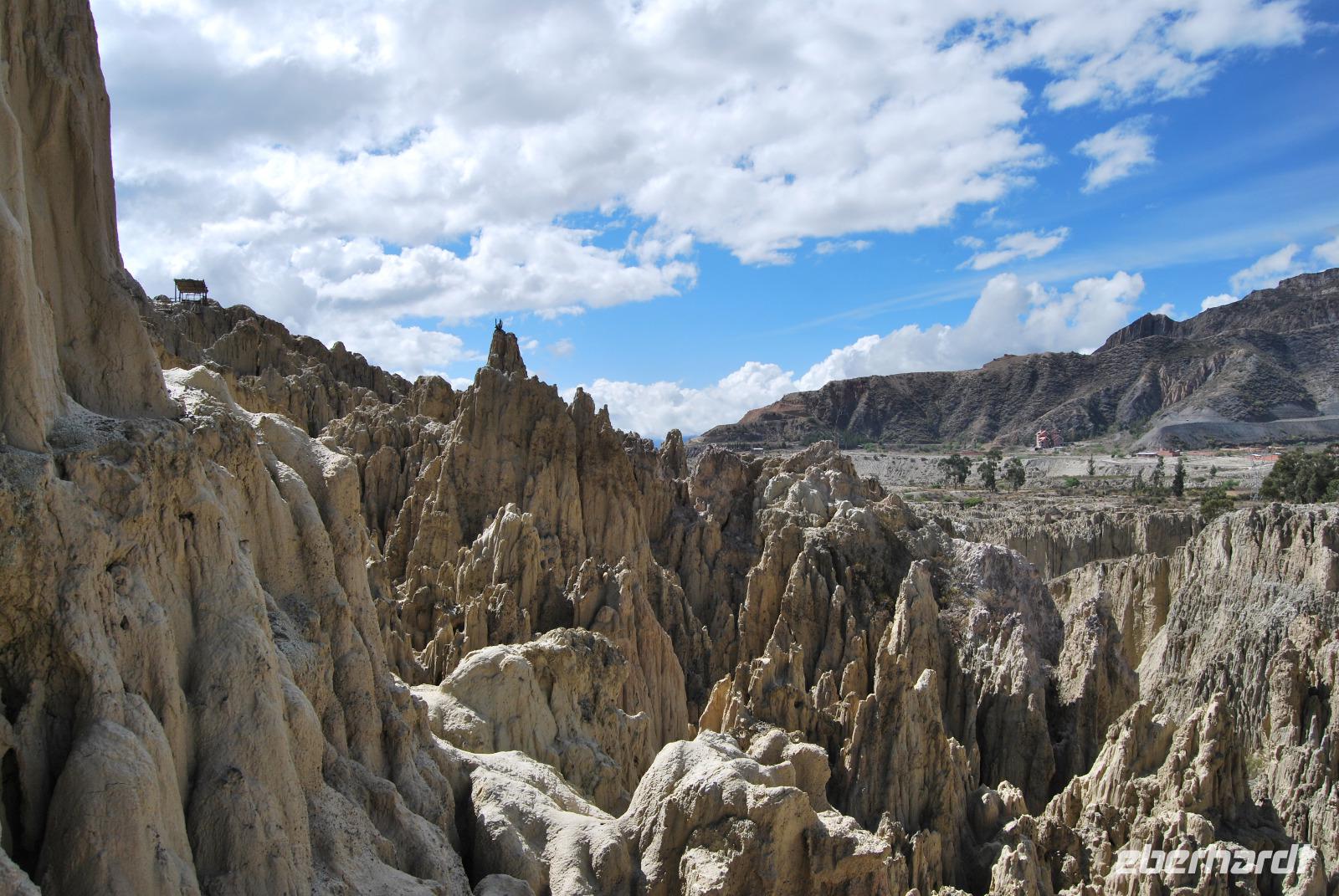 Am Morgen nach dem Frühstück fuhren wir in das "Valle de la luna" - das Tal des Mondes, was etwa zehn Kilometer von unserem Hotel entfernt war, abseits der Stadt. Eine spektakuläre Landschaft, die aber in weiten Teilen südlich von La Paz zu finden ist. Doch gerade dieses kleine, zum Park erklärte Stück, hat es in sich! Das steil abfallende Gelände weist viele Spalten und Schluchten auf. Es sieht so ein bisschen aus wie eine riesige Klecker-Burg, wie man sie früher als Kind am Strand gebaut hat. Die Witterung und gerade der Regen haben hier in das aus Kies und Sand bestehende Gestein tiefe Furchen gewaschen. Dennoch ist es sehr stabil. Man kann problemlos an einer sechs Meter tiefen Spalte stehen, ohne dass etwas einbricht. Im Umland wurden sogar Häuser auf diesem "Schweizer Käse" gebaut.