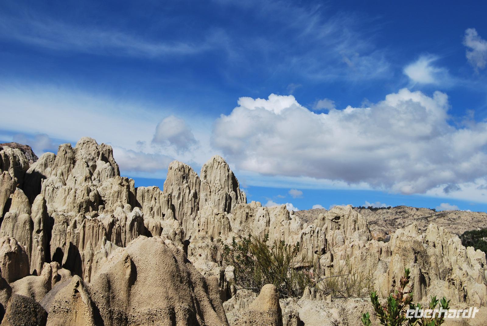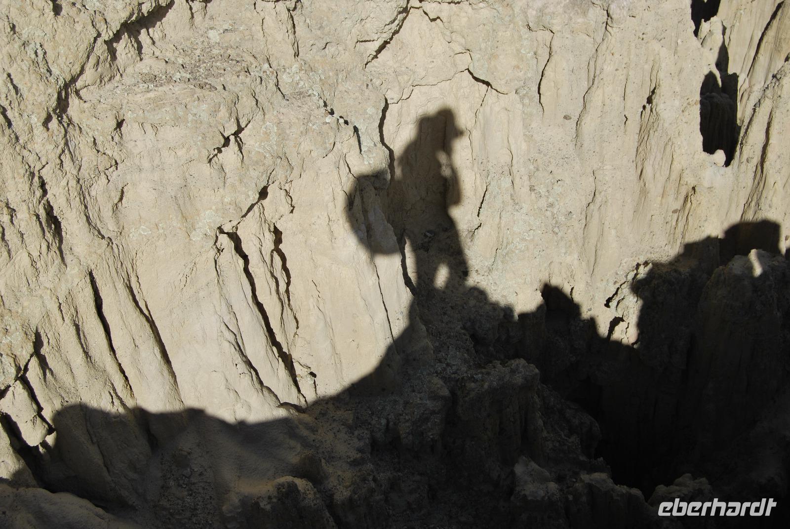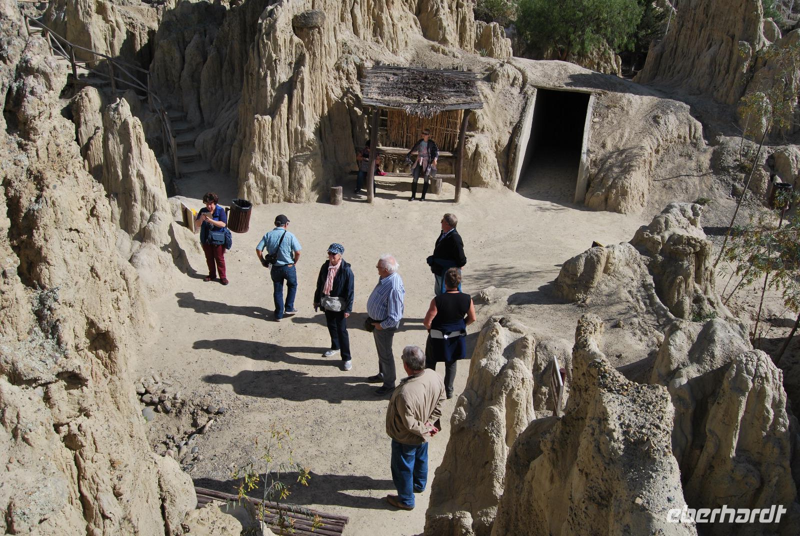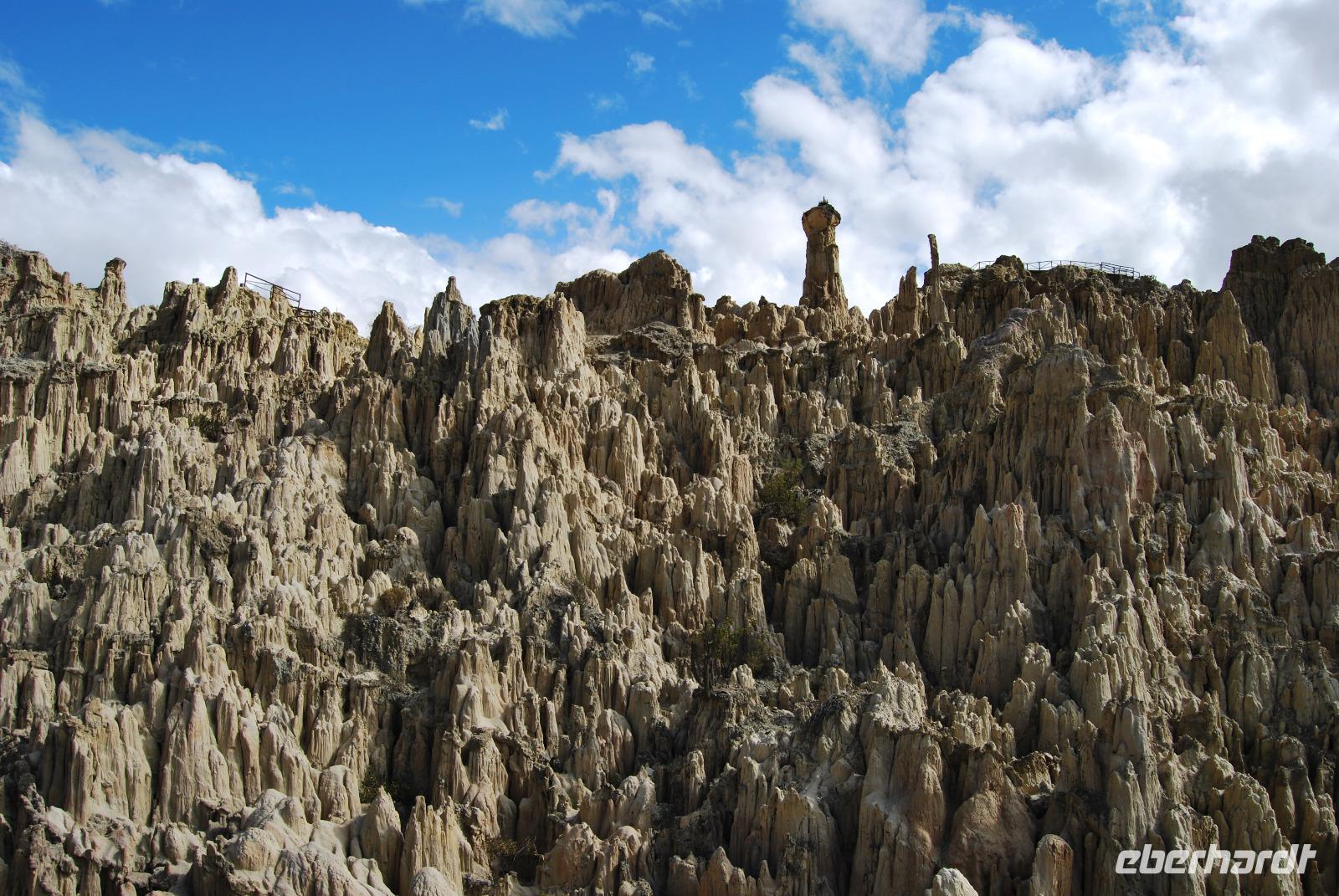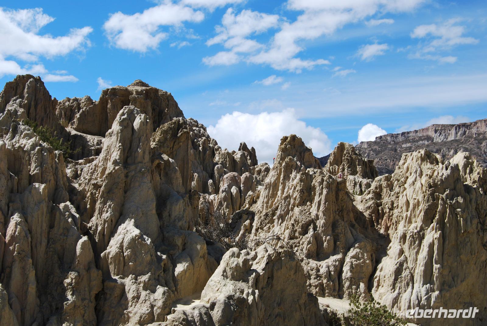 Am Morgen nach dem Frühstück fuhren wir in das "Valle de la luna" - das Tal des Mondes, was etwa zehn Kilometer von unserem Hotel entfernt war, abseits der Stadt. Eine spektakuläre Landschaft, die aber in weiten Teilen südlich von La Paz zu finden ist. Doch gerade dieses kleine, zum Park erklärte Stück, hat es in sich! Das steil abfallende Gelände weist viele Spalten und Schluchten auf. Es sieht so ein bisschen aus wie eine riesige Klecker-Burg, wie man sie früher als Kind am Strand gebaut hat. Die Witterung und gerade der Regen haben hier in das aus Kies und Sand bestehende Gestein tiefe Furchen gewaschen. Dennoch ist es sehr stabil. Man kann problemlos an einer sechs Meter tiefen Spalte stehen, ohne dass etwas einbricht. Im Umland wurden sogar Häuser auf diesem "Schweizer Käse" gebaut.