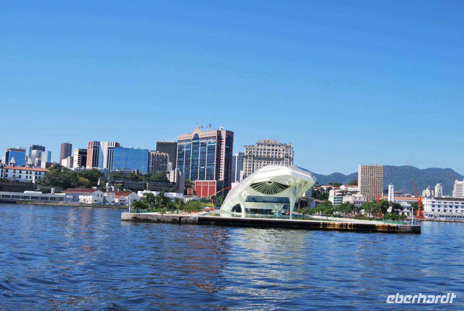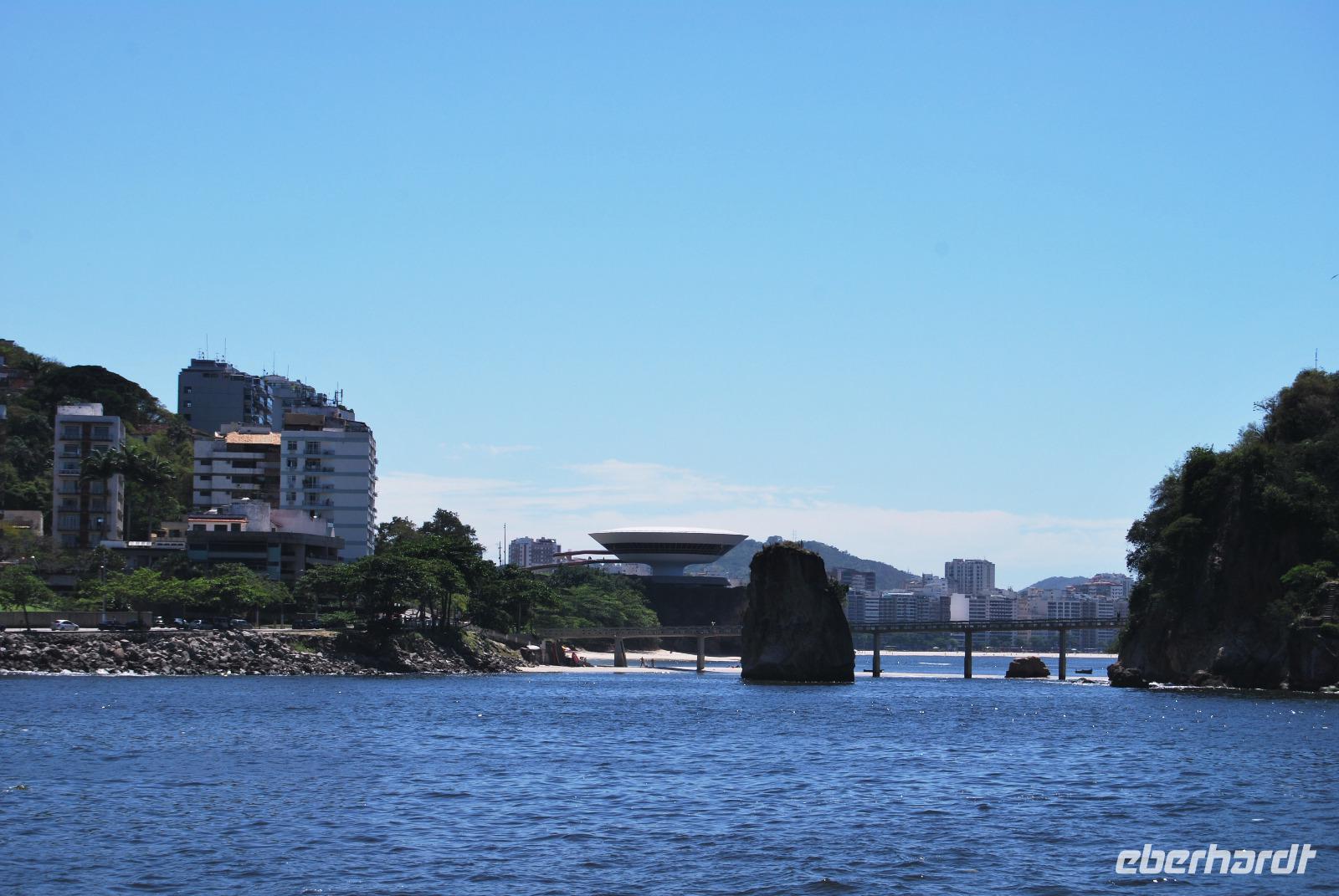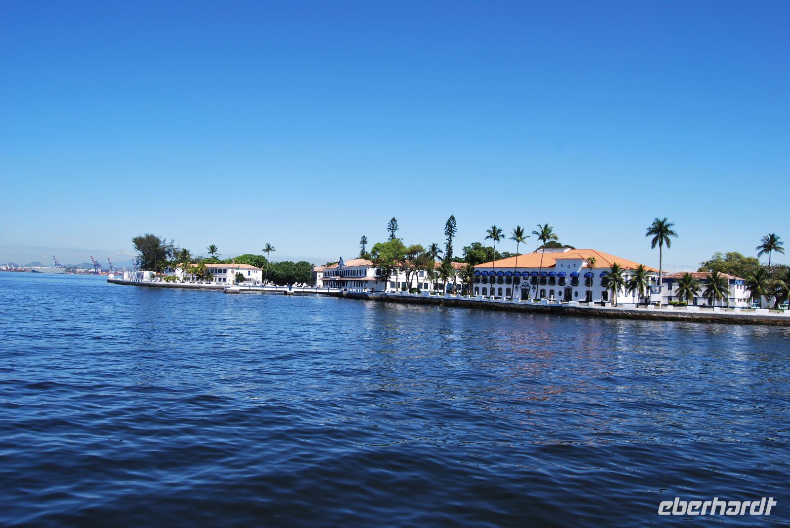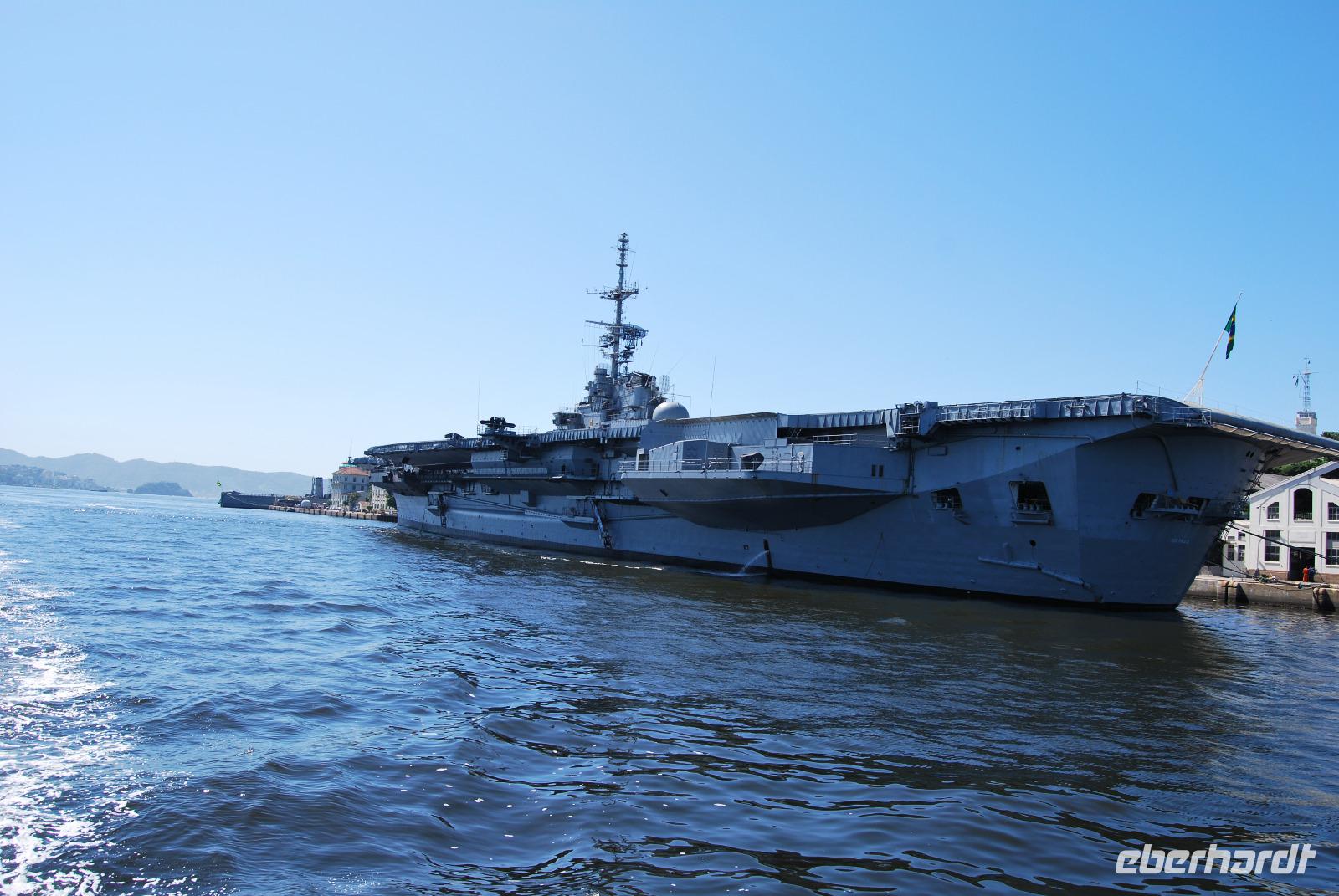 Blauer Himmel, pralle Sonne - kaum zu glauben! Begeistert starteten wir unsere heutige Tour. Da leider der Zuckerhut am gestrigen Tag gesperrt war, hatten wir heute als kleine, aber wunderbare, Entschädigung eine Bootsfahrt reserviert. Maik brachte uns zum Yachthafen Marina da Glória. Wir schipperten mit unserem Holzboot am Flughafen Rio de Janeiro-Santos Dumont vorbei, wo die Flugzeuge nur knapp über unsere Köpfe hinwegstreiften. Wir hatten ein unbeschreibliches Panorama bei exzellentem Sonnenschein vor den Augen. Wir kamen am alten Zollhaus Ilha Fiscal vorbei und sahen wenig später interessante Marineschiffe, darunter den Flugzeugträger São Paulo, am Marinestützpunkt Ihla das Cobras. Es folgte das Museu do Amanhã - das Museum von Morgen am Pier Maua, mit seinem futuristischen Gebäude sowie die Ilha das Enxadas und wenig später unterfuhren wir sogar die Rio-Niterói-Brücke. Sie verbindet Rio de Janeiro mit der gegenüberliegenden Stadt Niterói. Die Balkenbrücke ist über 13 Kilometer lang und bringt rund 151.000 Fahrzeuge pro Tag über die Bucht. Dann fuhren wir an der Küste von Niterói zurück zum Hafen. Wir passierten dabei die „Insel der guten Reise" mit der darauf liegenden katholischen Kirche. Dahinterliegend sah man das moderne Bauwerk des Museums für zeitgenössische Kunst, welches wie ein Ufo aussieht! Entworfen wurde das Gebäude passenderweise vom bekanntesten brasilianischen Architekten der Moderne - Oscar Niemeyer. Bevor wir in den Hafen Marina Gloria bogen, konnten wir das grandiose Panorama auf die beeindruckende und größte Befestigungsanlage Südamerikas, die Festung Santa Cruz da Barra, und den weltberühmten Zuckerhut genießen.