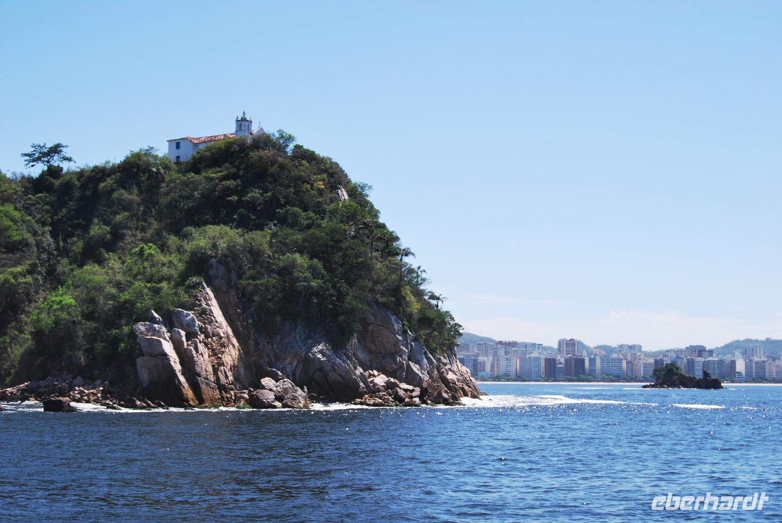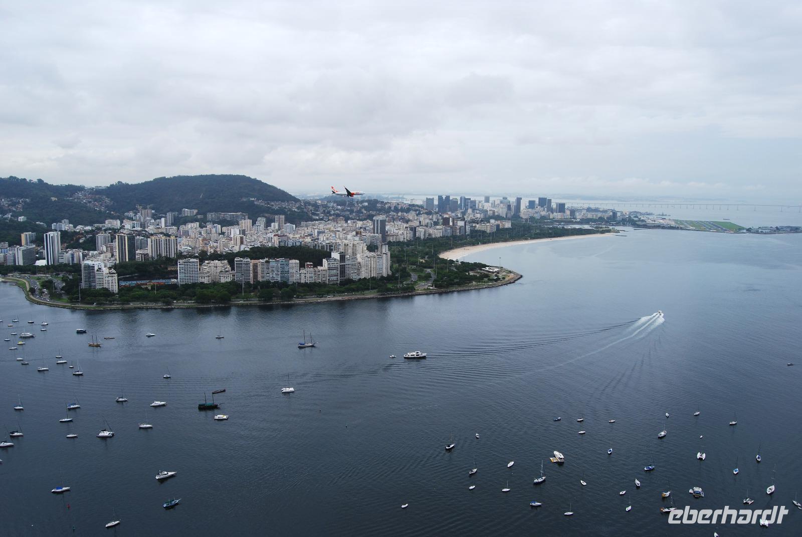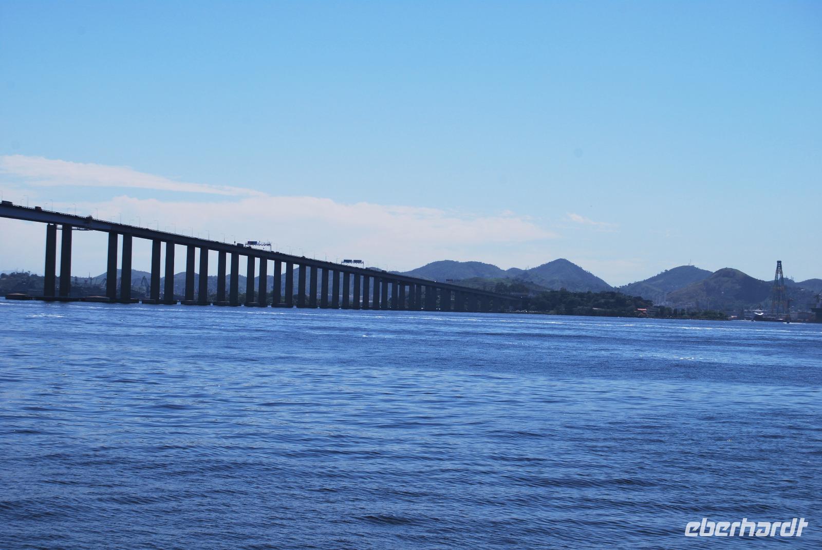 Blauer Himmel, pralle Sonne - kaum zu glauben! Begeistert starteten wir unsere heutige Tour. Da leider der Zuckerhut am gestrigen Tag gesperrt war, hatten wir heute als kleine, aber wunderbare, Entschädigung eine Bootsfahrt reserviert. Maik brachte uns zum Yachthafen Marina da Glória. Wir schipperten mit unserem Holzboot am Flughafen Rio de Janeiro-Santos Dumont vorbei, wo die Flugzeuge nur knapp über unsere Köpfe hinwegstreiften. Wir hatten ein unbeschreibliches Panorama bei exzellentem Sonnenschein vor den Augen. Wir kamen am alten Zollhaus Ilha Fiscal vorbei und sahen wenig später interessante Marineschiffe, darunter den Flugzeugträger São Paulo, am Marinestützpunkt Ihla das Cobras. Es folgte das Museu do Amanhã - das Museum von Morgen am Pier Maua, mit seinem futuristischen Gebäude sowie die Ilha das Enxadas und wenig später unterfuhren wir sogar die Rio-Niterói-Brücke. Sie verbindet Rio de Janeiro mit der gegenüberliegenden Stadt Niterói. Die Balkenbrücke ist über 13 Kilometer lang und bringt rund 151.000 Fahrzeuge pro Tag über die Bucht. Dann fuhren wir an der Küste von Niterói zurück zum Hafen. Wir passierten dabei die „Insel der guten Reise" mit der darauf liegenden katholischen Kirche. Dahinterliegend sah man das moderne Bauwerk des Museums für zeitgenössische Kunst, welches wie ein Ufo aussieht! Entworfen wurde das Gebäude passenderweise vom bekanntesten brasilianischen Architekten der Moderne - Oscar Niemeyer. Bevor wir in den Hafen Marina Gloria bogen, konnten wir das grandiose Panorama auf die beeindruckende und größte Befestigungsanlage Südamerikas, die Festung Santa Cruz da Barra, und den weltberühmten Zuckerhut genießen.