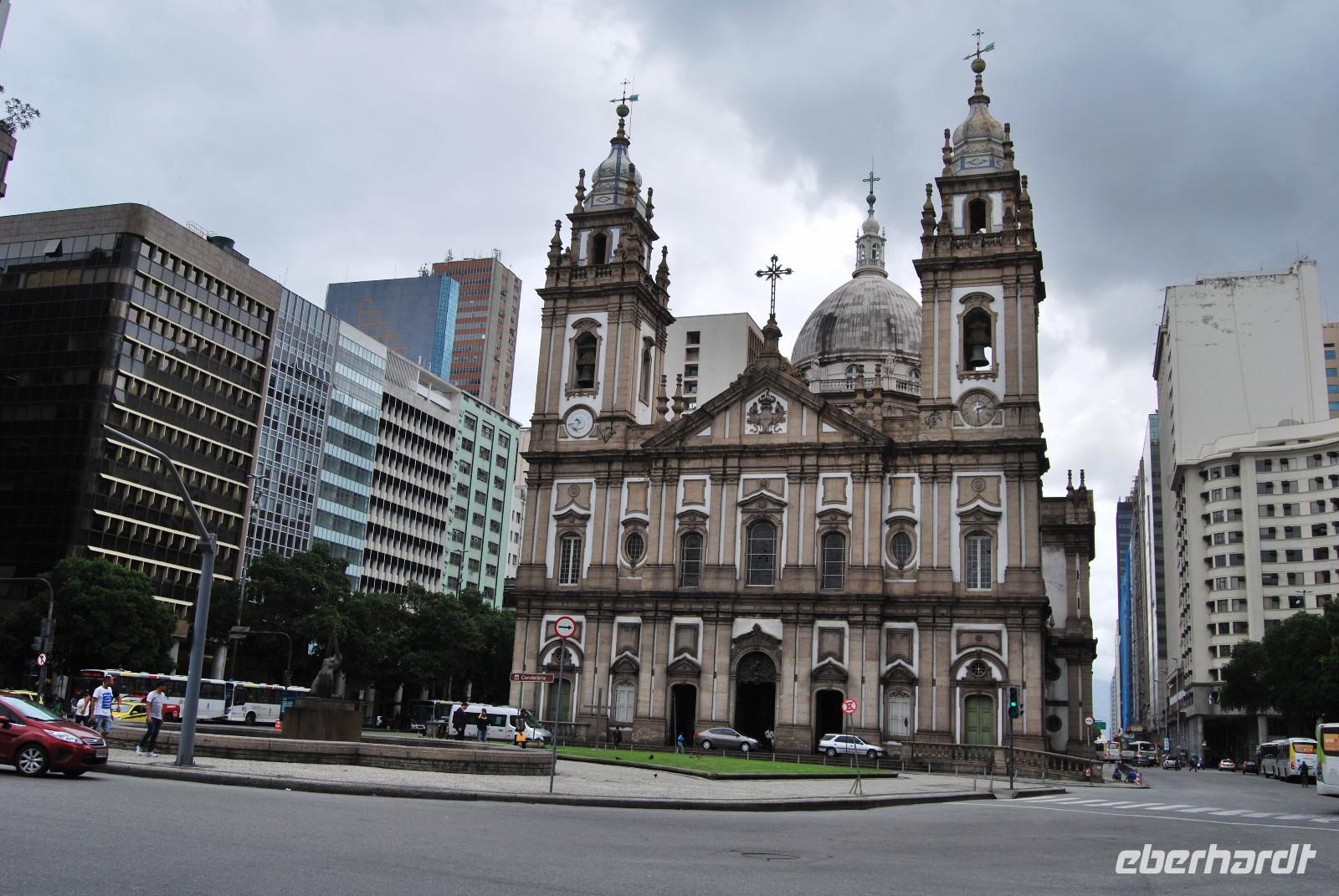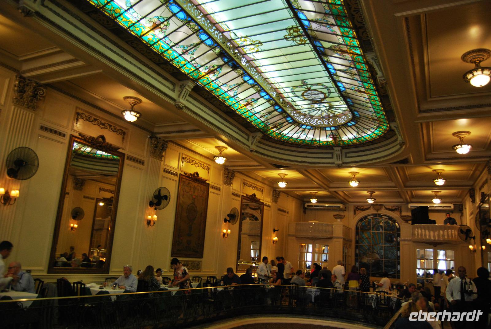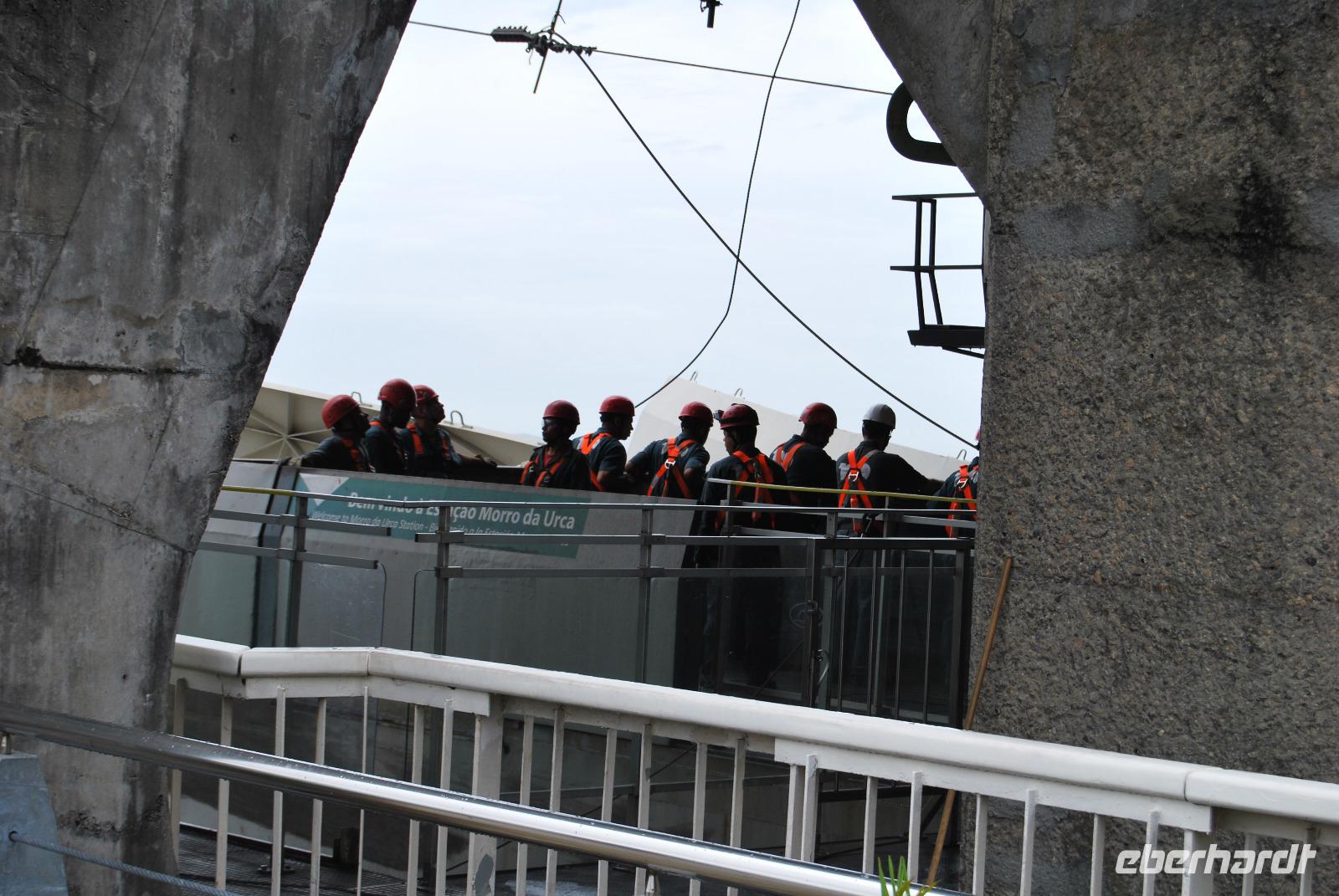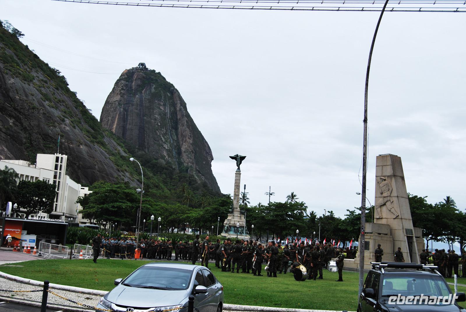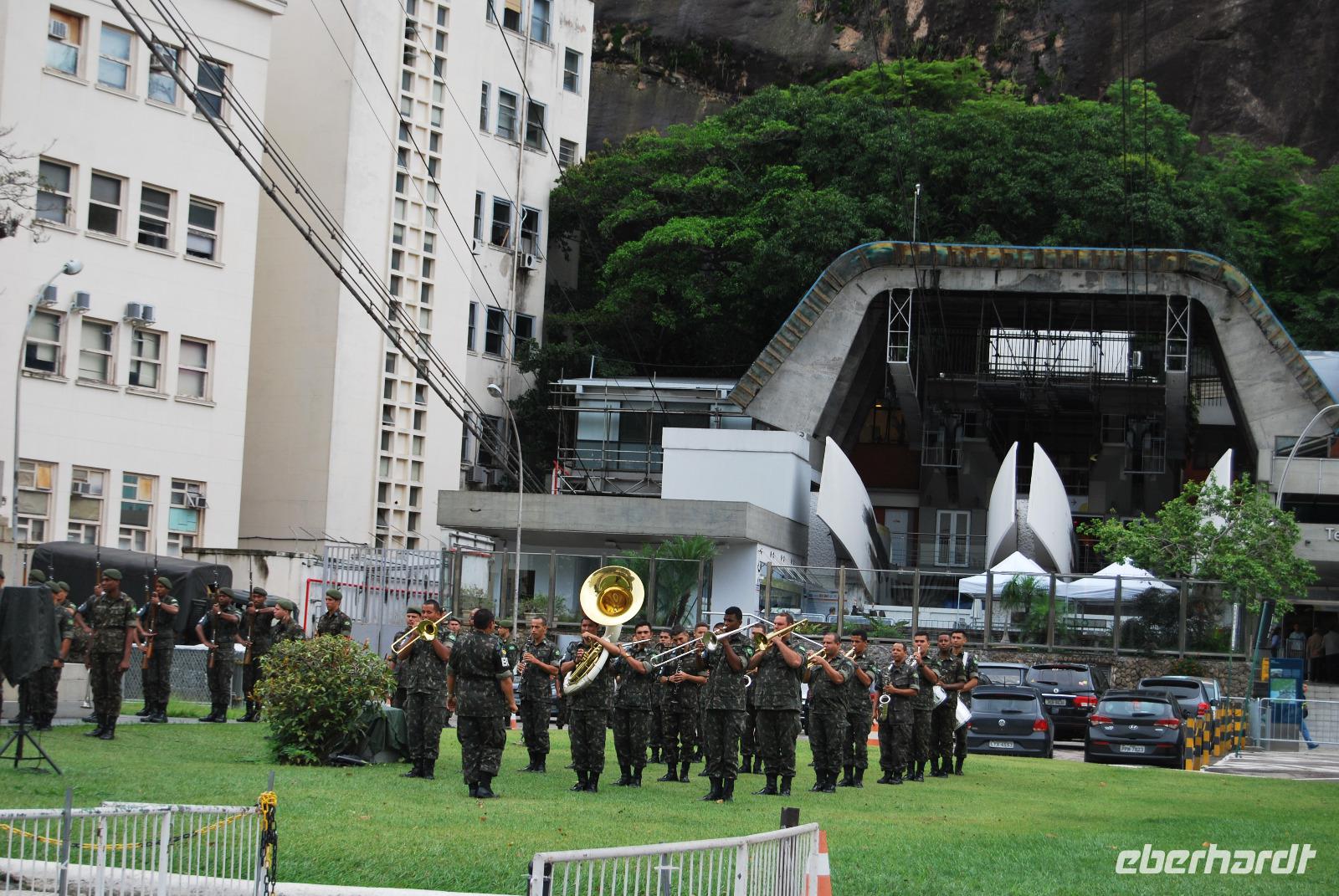 Heute stand Stadtrundfahrt in Rio de Janeiro auf dem Programm. Als erstes fuhren wir mit Maik zu der nicht weitentfernten Seilbahnstation, die normalerweise auf den Zuckerhut fährt. Leider waren aber Bauarbeiten angekündigt, so dass die Auffahrt auf den Zuckerhut nicht möglich war. Jedoch hatten wir die Chance die untere Station zu besuchen - Morro Da Urca. Dort angekommen, wurden wir von einer Militärkapelle empfangen, die am Fuße der Station ihren Zapfenstreich vollbrachte. Wir fuhren mit den großen Gondeln nach oben. Von dort konnten wir die kleine Bucht und die Stadtteile Botafogo und Flamengo gut überblicken. Auch das Wetter spielte mit. Es war lediglich etwas bewölkt und der Christo, der über der Stadt thront, war klar zu erkennen. Nächster Halt war das berühmte Maracanã-Stadion in dem zur Eröffnung 1950 knapp 200.000 Zuschauer Platz hatten und damit das größte Stadion der Welt war. Nach heutigen Sicherheitsauflagen und Modernisierungsmaßnahmen gibt es nur noch Sitzplätze. Aber es haben immerhin noch 74.738 Zuschauer Zugang. Als nächstes besuchten wir ein weiteres Stadion, das Sambódromo. Die Tribünen sind etwa 700 Meter lang und bieten Platz für 88.500 Zuschauer. Zur Karnevals-Zeit bebt dort die Erde. Unter den Tribünen findet man einen kleinen Kostümverleih, wo wir die Gelegenheit hatten mal ein solch buntes Gewand anzuprobieren. Dann ging es für uns in das Zentrum von Rio. Zuerst zur St. Sebastian Stadtkathedrale, die aussieht wie ein Tempel der Maya, knapp 75 Meter hoch und 100 Meter im Durchmesser. Wir kamen zur prunkvollen Oper von Rio, die aus dem frühen 20. Jahrhundert stammt und von der Pariser Opéra Garnier inspiriert wurde. Wir folgten Maik weiter und schließlich am Kloster St. Antonio vorbei und der Relogio Da Carioca, einer Uhr und Laterne, mit der erstmals 1909 elektrisches Licht die Straßen in Rio erhellte. Dann gingen wir in die belebte Straße Rua Gonçalves Dias und besuchten die Confeitaria Colombo. Ein interessantes Gebäude mit Elementen aus Historismus und Jugendstil. Ebenso der altertümliche Fahrstuhl, der uns eine Ebene höher, zu dem hervorragenden Buffet, brachte. Am Nachmittag sahen wir noch die Kirche der Marktleute an der Straße Travessa Comercio und Rúa do Ouvidor bei unserem Rundgang sowie die ehemalige Zentralbank Brasiliens und die Kathedrale Candelaria aus dem 19. Jahrhundert.