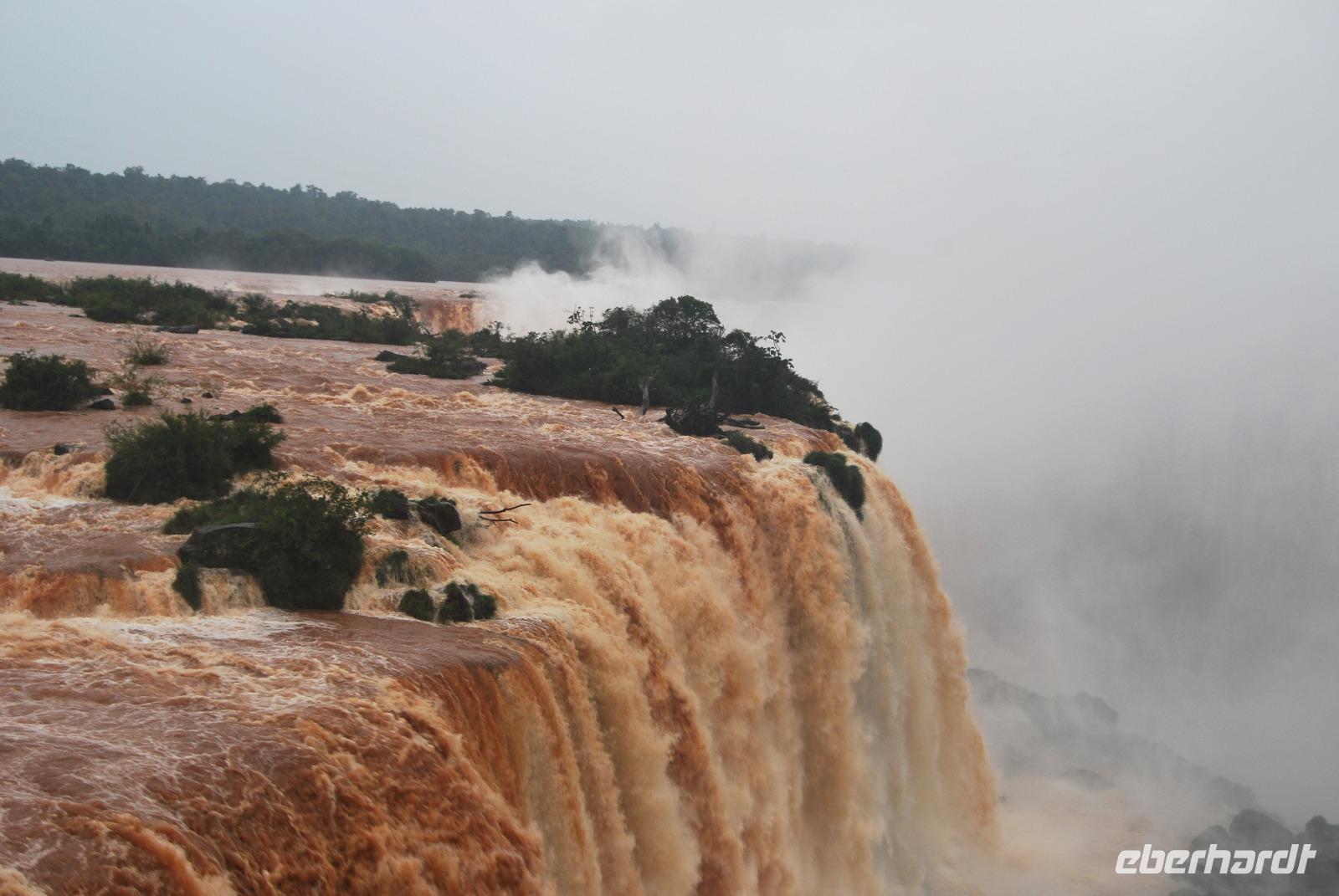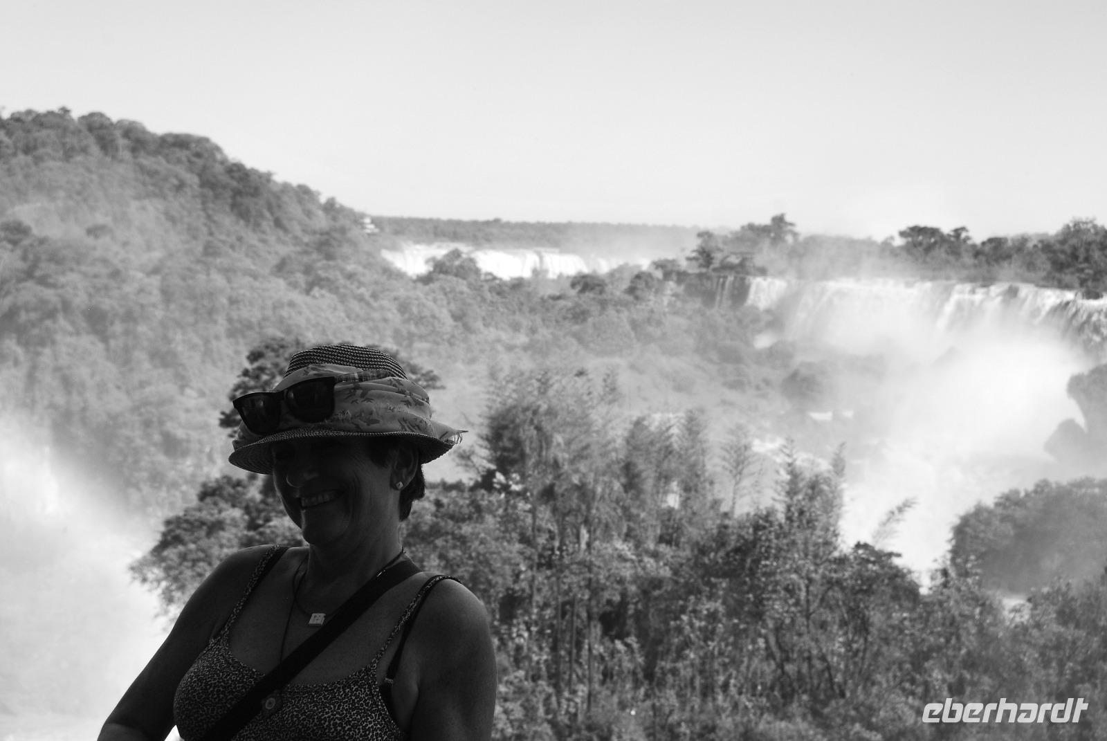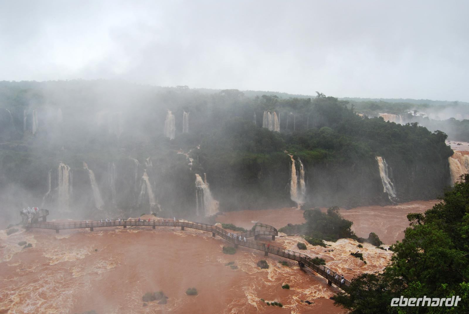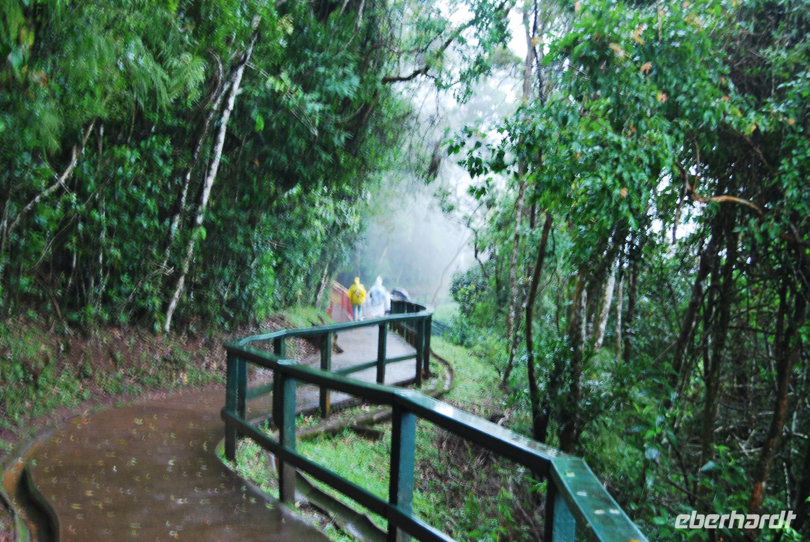 Heute stand die brasilianische Seite der Iguazú-Wasserfälle auf dem Programm. Sie befinden sich in der Provinz Paraná und fließen auch in den Fluss namens Paraná und von dort bis nach Buenos Aires, wo sie in den Atlantik münden. Doch der Himmel hatte an diesem Morgen nichts Gutes zu verheißen. Es zogen dunkle Wolken über uns. Als erstes fuhren wir zur Helikopter-Station und tauschten ein paar Real. Dann ging es weiter zum National-Park. Es fing mit Regnen an. Hin und wieder hörte man ein Gewitter. Norberto, unser Guide, besorgte uns die Tickets für den Park - zunächst mussten wir aber noch ein Stück mit dem Bus fahren. An der ersten Aussichtsplattform hielten wir und stiegen aus. Der Regen wurde heftiger. Meine Regenjacke, die ich schon tagelang durch die größte Hitze mit mir herumtrug, hatte ich natürlich nicht dabei. Aber wahrscheinlich hätte sie mir heute auch nicht viel genützt. Binnen weniger Minuten waren wir durchweicht. Ich besorgte mir noch einen der weißen Nationalpark-Ponchos um mich vor dem kühlen Wind zu schützen. Den Pfad, mit seinen zahlreichen Aussichtsplattformen auf den Wasserfall, schafften wir in Rekordzeit. Ich versuchte meine Kamera herauszuholen um wenigstens ein paar Bilder der atemberaubenden Wassermassen zu machen, aber mit wenig Erfolg. Am Ende ging ich mit nur einer Hand voll Bildern nach Hause. Trotz des starken Regens, und der Tatsache, dass wohl kein Fleck an uns trocken geblieben ist, hat sich jede Sekunde dieses Naturspektakels gelohnt. So hatten wir wenigstens beide Seiten des Wasserfalls und des Regenwaldes gesehen - nass und trocken.