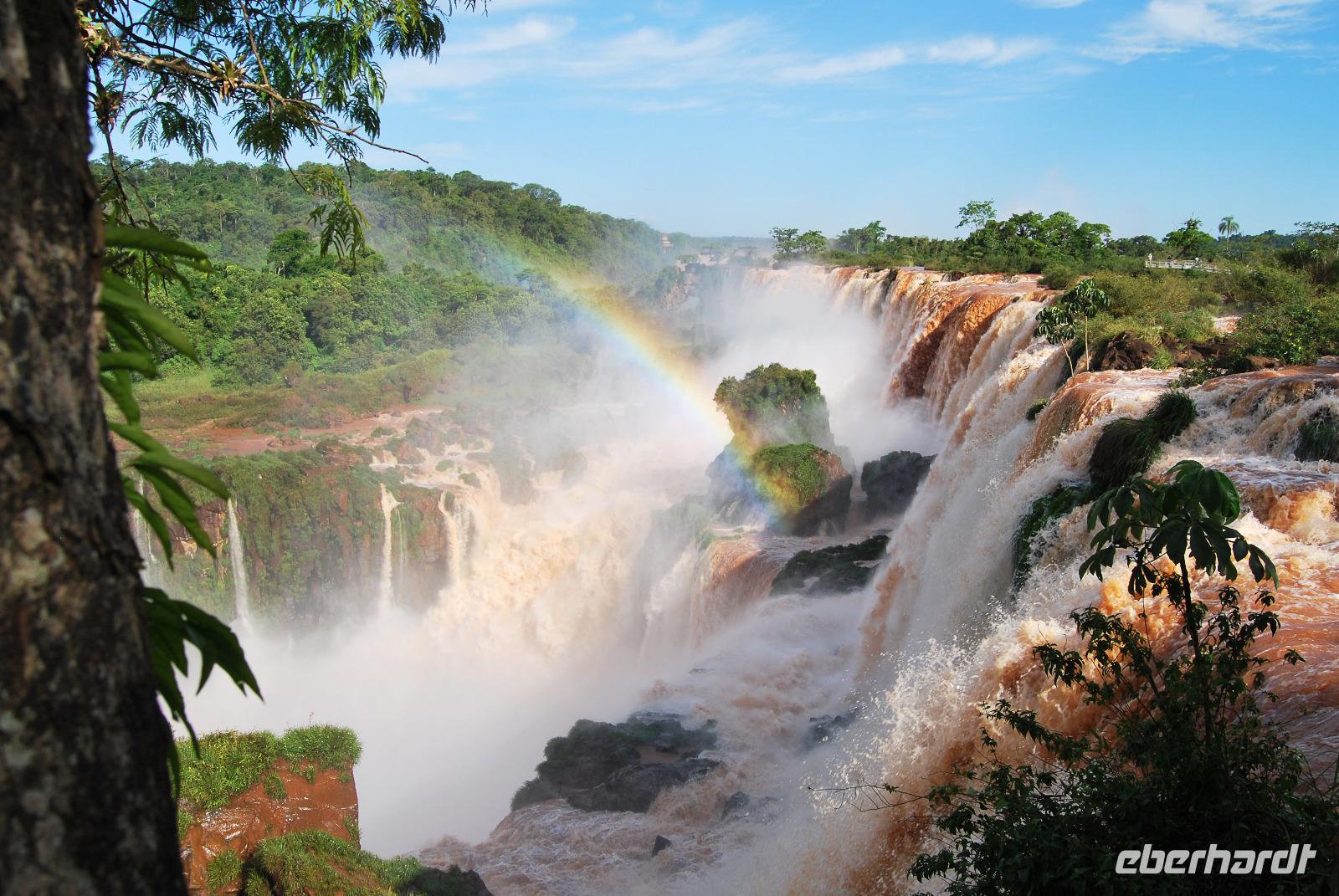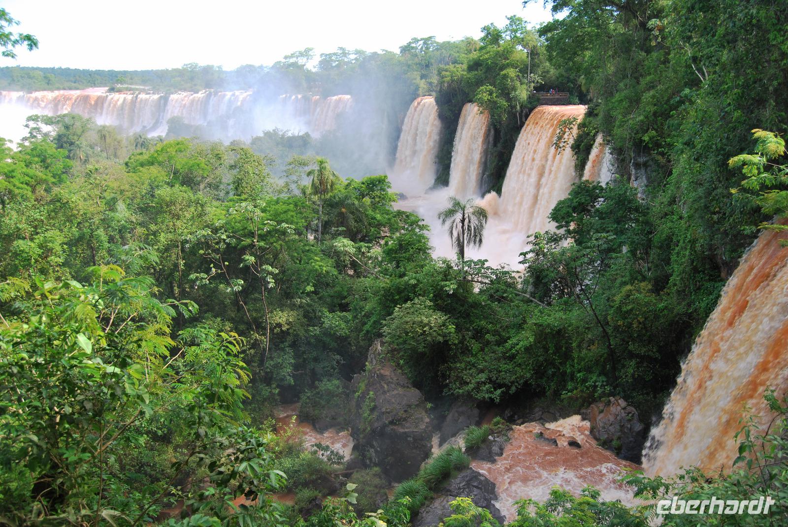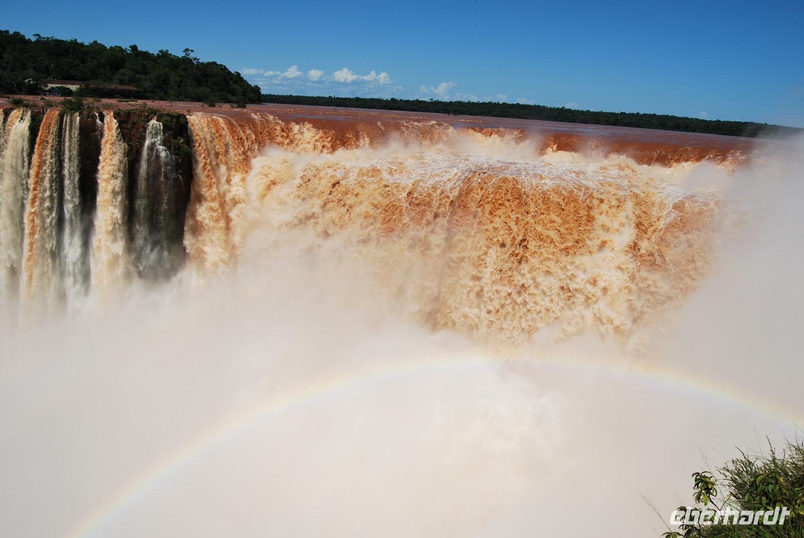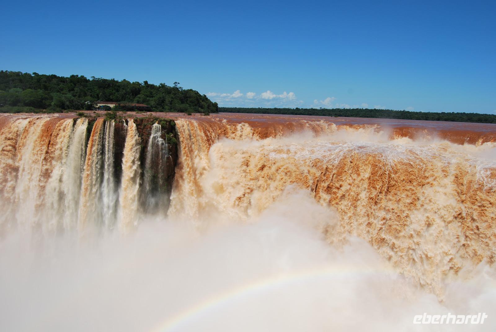 Morgens reisten wir von San Nicolas zum Flughafen. Es war sehr regnerisch. Am Vortag hatten wir großes Glück die Stadt Buenos Aires bei herrlichem Sonnenschein zu erleben. Kurz vor dem Mittag landeten wir am Drei-Länder-Eck von Brasilien, Paraguay und Argentinien auf der argentinischen Seite. Wir spazierten direkt zu den gewaltigen Wasserfällen im Iguazú-Nationalpark und sahen in den Teufelsschlund hinein. Der Iguazú-Wasserfall hat eine Ausdehnung von ungefähr 2,7 Kilometern, bestehend aus 20 größeren sowie 255 kleineren Wasserfällen. Die Wassermassen schwanken von 1.500 m³/s bis über 7.000 m³/s, wobei wir das Maximum erleben durften. Es hatte sehr viel geregnet in der letzten Zeit. So war der Fluss voll mit Wasser. Aus den höherliegenden Gebieten brachte der rauschende Fluss auch jede Menge Sediment mit sich und er war Rot-braun, schon fast Kupfer gefärbt. Wir genossen jeden Winkel, jeden anderen Blickpunkt, die uns die zahlreichen Aussichtsplattformen boten. Bei stahlblauem Himmel und bei schwüler, tropischer Hitze konnten wir den roten Donner bestaunen. In der indianischen Sprache Guaraní heißt Iguazú großes Wasser. Am Abend fuhren wir über die Grenze nach Brasilien in unser komfortables Wald-Hotel San Martin in Foz do Iguaçu.