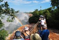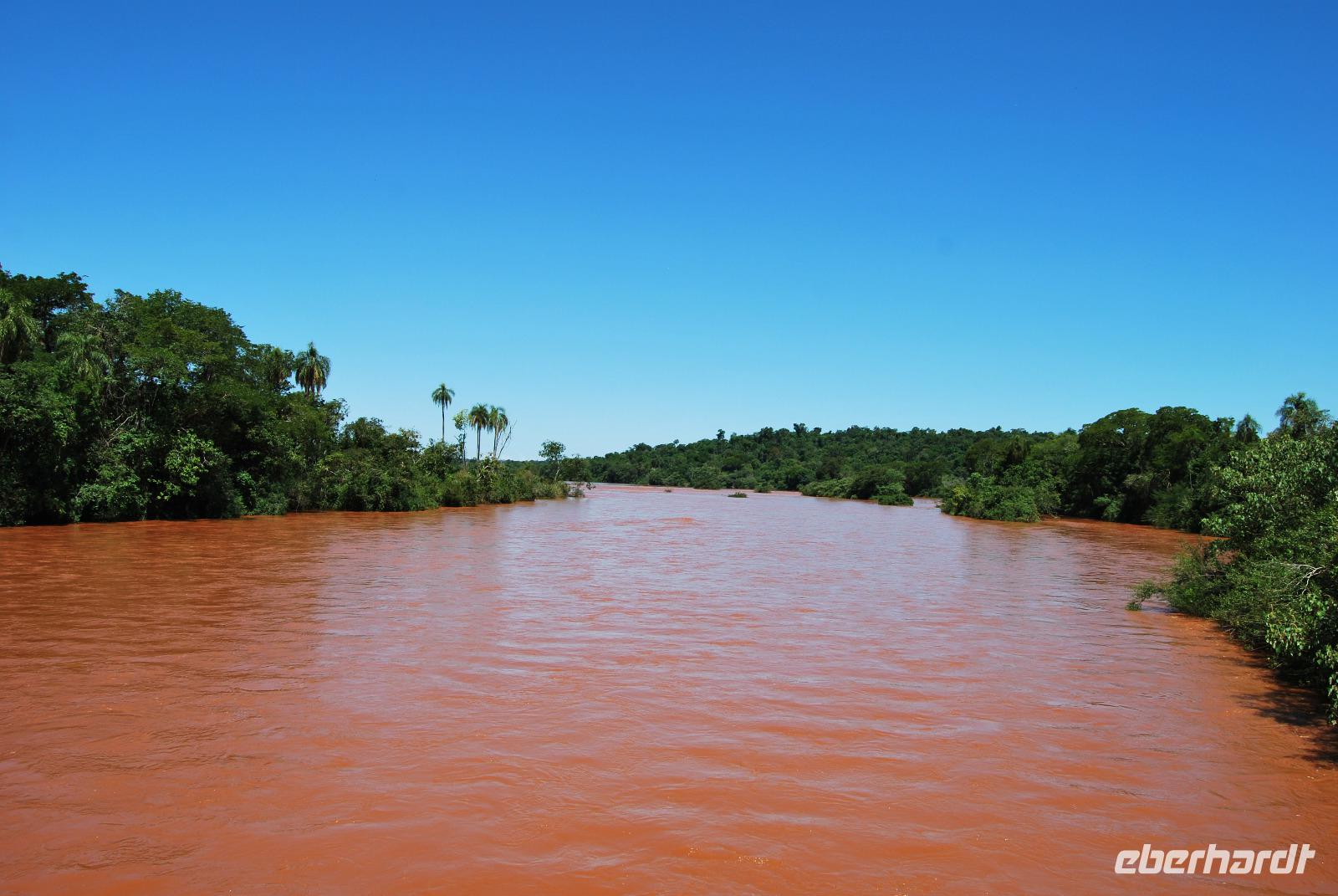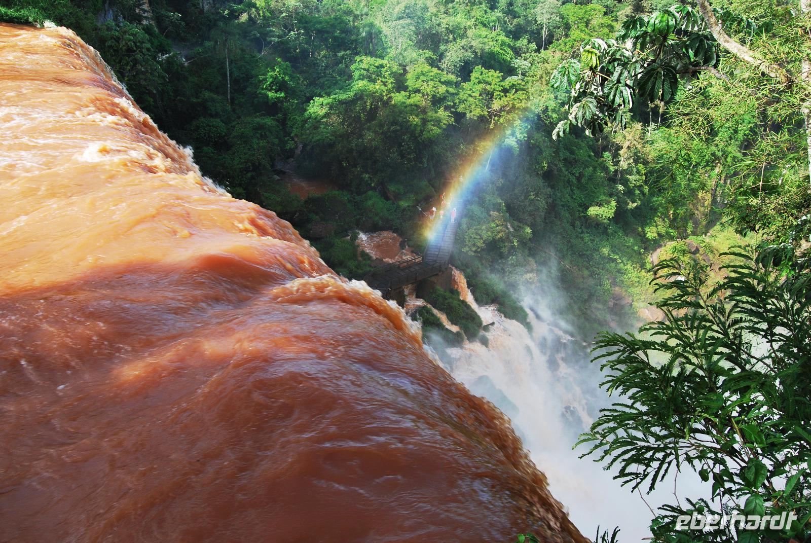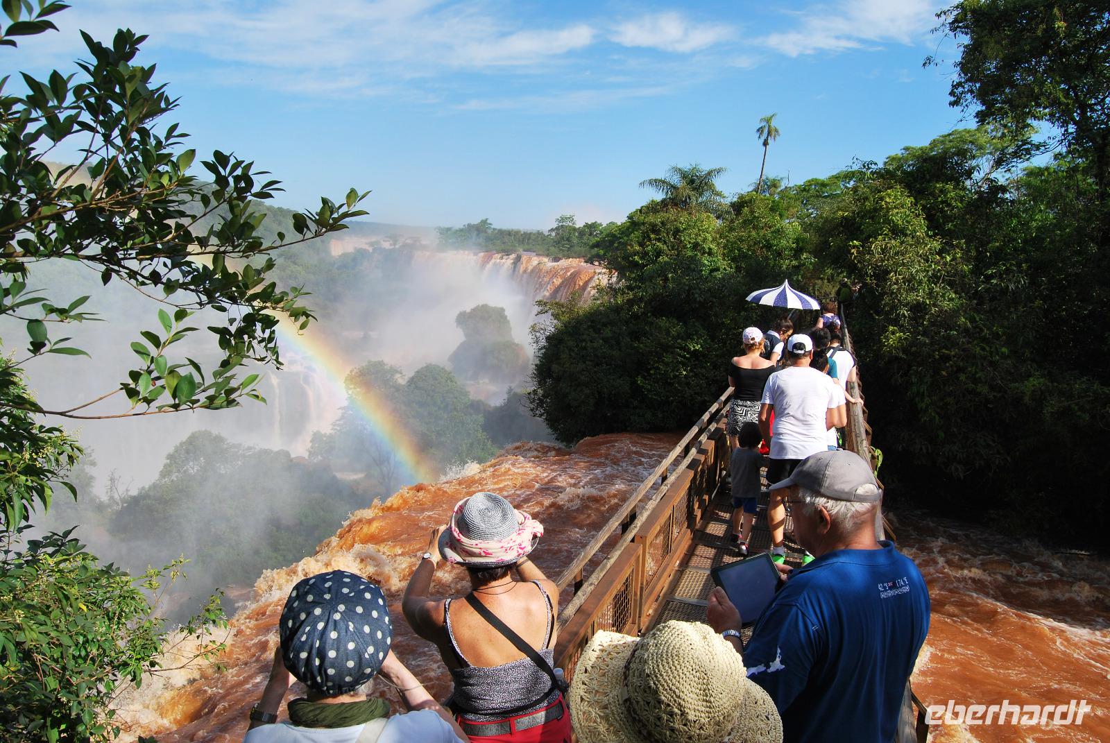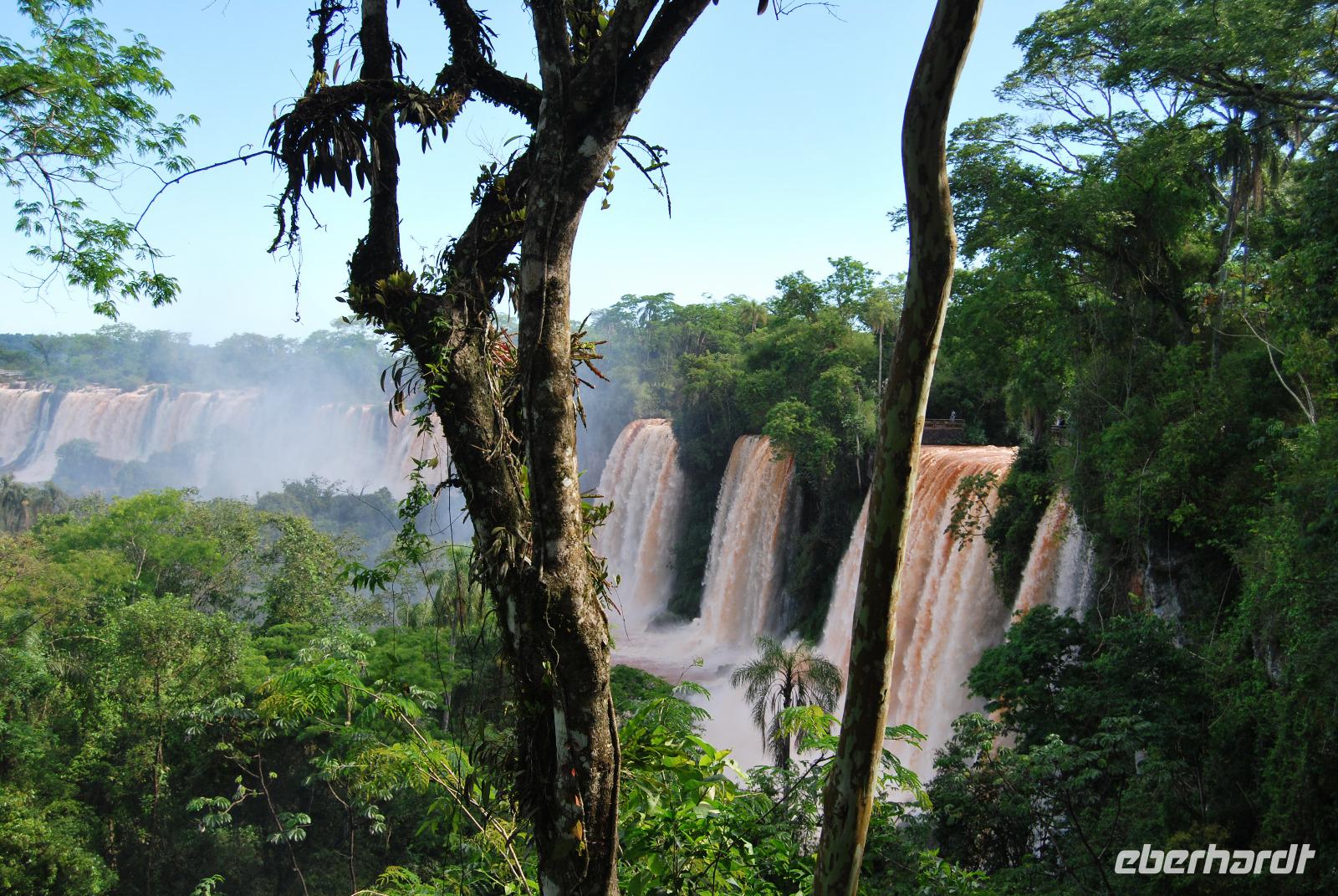 Morgens reisten wir von San Nicolas zum Flughafen. Es war sehr regnerisch. Am Vortag hatten wir großes Glück die Stadt Buenos Aires bei herrlichem Sonnenschein zu erleben. Kurz vor dem Mittag landeten wir am Drei-Länder-Eck von Brasilien, Paraguay und Argentinien auf der argentinischen Seite. Wir spazierten direkt zu den gewaltigen Wasserfällen im Iguazú-Nationalpark und sahen in den Teufelsschlund hinein. Der Iguazú-Wasserfall hat eine Ausdehnung von ungefähr 2,7 Kilometern, bestehend aus 20 größeren sowie 255 kleineren Wasserfällen. Die Wassermassen schwanken von 1.500 m³/s bis über 7.000 m³/s, wobei wir das Maximum erleben durften. Es hatte sehr viel geregnet in der letzten Zeit. So war der Fluss voll mit Wasser. Aus den höherliegenden Gebieten brachte der rauschende Fluss auch jede Menge Sediment mit sich und er war Rot-braun, schon fast Kupfer gefärbt. Wir genossen jeden Winkel, jeden anderen Blickpunkt, die uns die zahlreichen Aussichtsplattformen boten. Bei stahlblauem Himmel und bei schwüler, tropischer Hitze konnten wir den roten Donner bestaunen. In der indianischen Sprache Guaraní heißt Iguazú großes Wasser. Am Abend fuhren wir über die Grenze nach Brasilien in unser komfortables Wald-Hotel San Martin in Foz do Iguaçu.