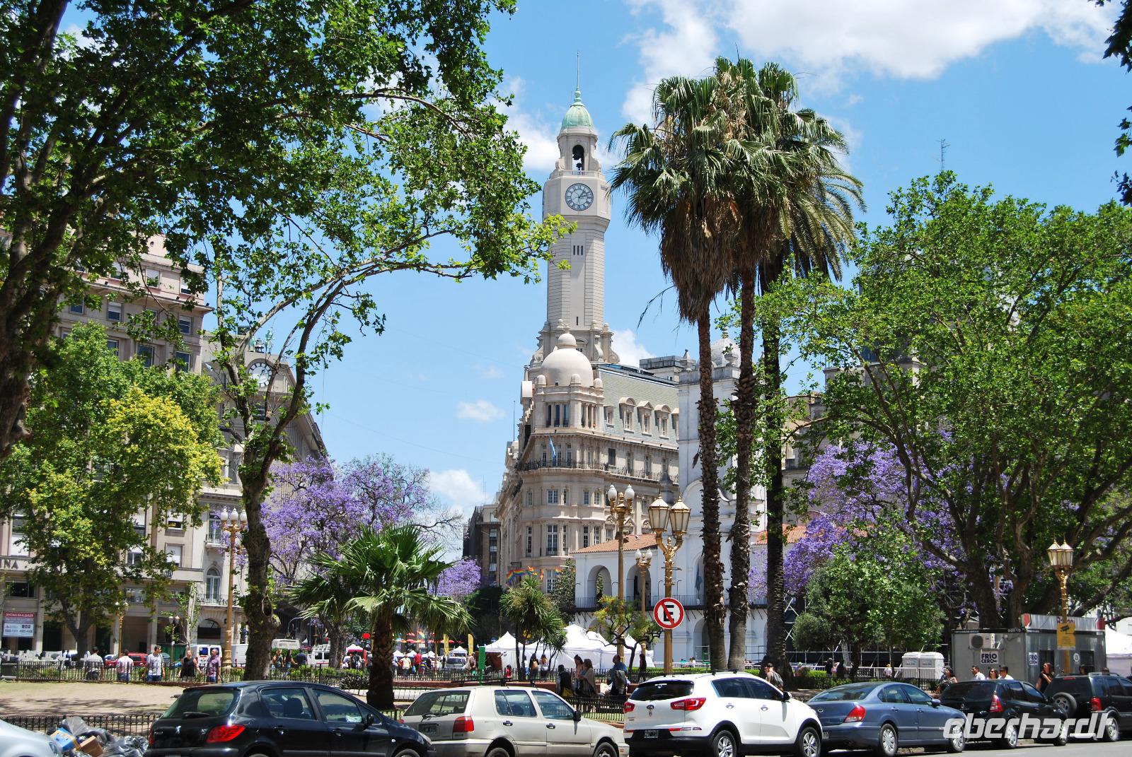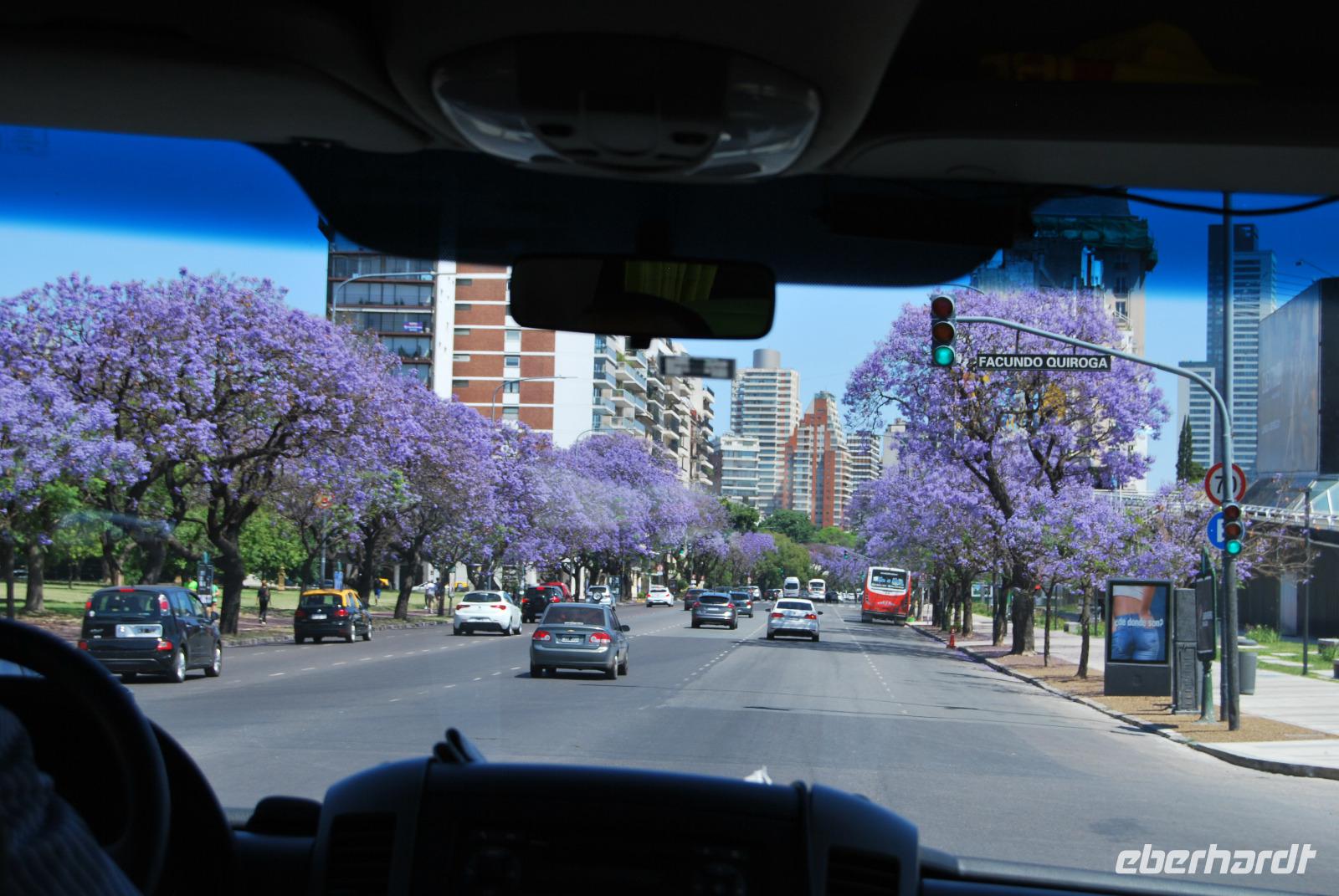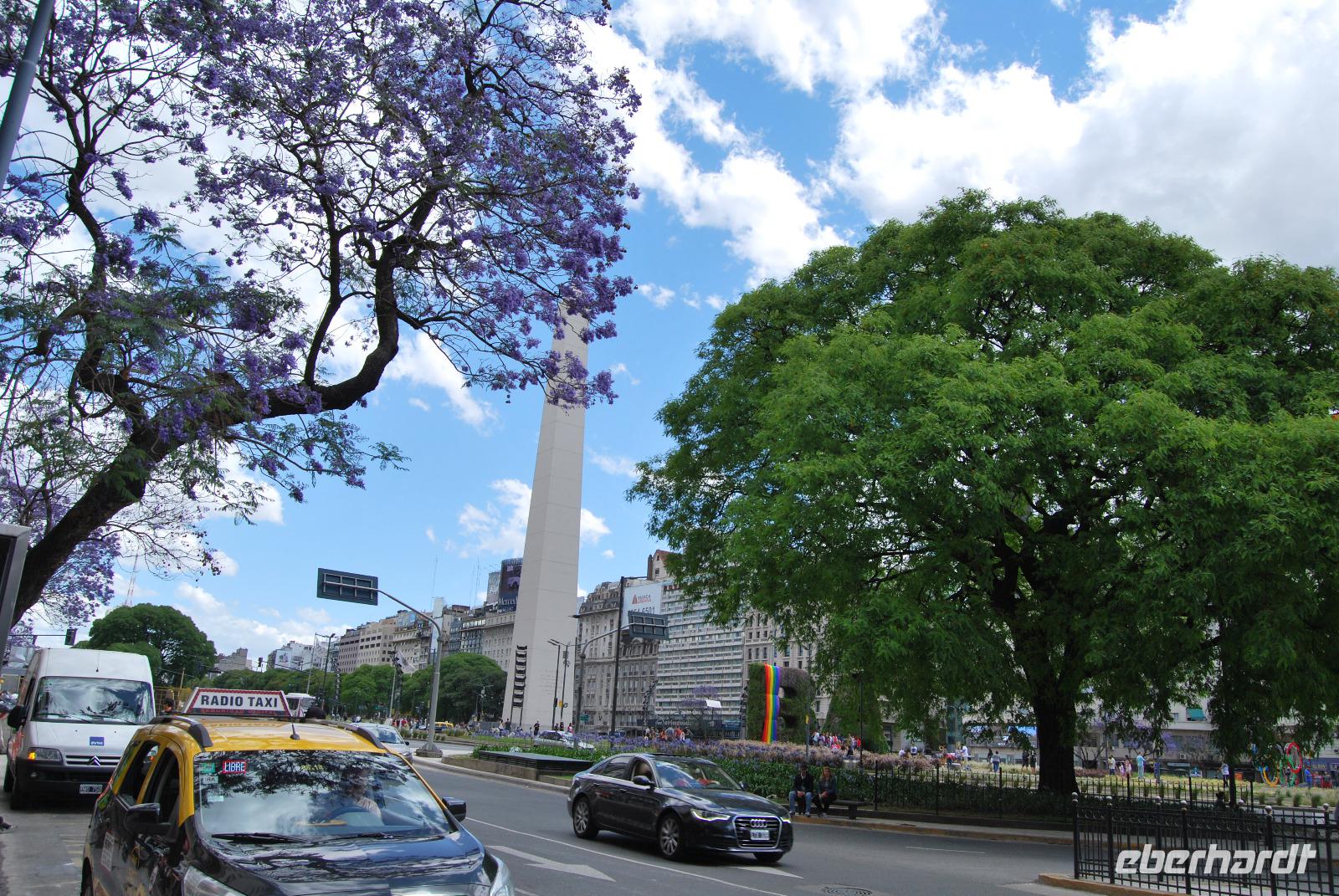 Wir begannen unseren Tag mit einer Stadtrundfahrt in der Millionen-Metropole. Betrachtet man die gesamte Region Buenos Aires, so kommt man auf 14 Millionen Einwohner. Das entspricht etwa einem Drittel von ganz Argentinien. Die Stadt selbst hat fast 2,9 Millionen und teilt sich in 48 Barrios - Stadtteile. Unser Hotel befand sich im Stadtteil San Nicolas, quasi gleich neben dem berühmten Obelisken von Buenos Aires. Das 67 Meter hohe Denkmal wurde 1936 anlässlich des 400-jährigen Jubiläums der Stadtgründung errichtet. Von dort sind wir mit Ines zum Torre Monumental, ein Glockenturm im englischen Stil, im Stadtteil Retiro. Es war eine hübsche Parkanlage von der man auch das erste Hochhaus von Buenos Aires sehen konnte. Die auffälligen Jacarandá-Bäume, mit ihren intensiven violetten Blüten, schmückten die zahlreichen Alleen von Buenos Aires und begleiteten uns auf der gesamten Stadtrundfahrt. Der nächste Halt war im Stadtteil Recoleta. Wir besuchten den gleichnamigen Friedhof. Zahlreiche Mausoleen und Grabhäuser luden zum Staunen ein. Denn die aufwändig, liebevoll und meisterlich gearbeiteten Skulpturen tummeln sich dort dicht an dicht. Zahlreiche Präsidenten und berühmte Persönlichkeiten aber auch reiche Kaufleute sind dort bestattet. Darunter auch die berühmte María Eva Duarte de Perón, die Primera Dama von Argentinien anfangs des 20. Jahrhunderts, die ihren Mann an die Spitze brachte und sich selbst für die Armen einsetzte. Vom Friedhof Recoleta fuhren wir am ehemaligen Kloster, und heutigem Kulturzentrum, vorbei nach Palermo. Der Stadtteil ist seit Jahrhunderten bekannt für seine Gärten und wurde auch in einem Tango von Juan Villalba besungen. Wir besuchten dort den Rosengarten von Palermo, der schon im Jahre 1914 eröffnet wurde. Von Palermo aus ging es durch Monserrat nach La Boca. Der auch durch den weltberühmten Fußball Club Boca Juniors bekannte Stadtteil zeigte sich uns bei prallem Sonnenschein in seiner ganzen Farbenpracht. Da an diesem Sonntag Boca Juniors ein Heimspiel hatte, erschwerte dies durch zahlreiche Absperrungen die Anreise ein wenig. Einige Fans in blau-gelb trieben auch schon durch die sehenswerten Straßen um den Caminito - das Wegchen. Kleine Bars, Restaurants und zahlreiche Händler belebten die Gassen. In den Lokalen und auf der Straße wird fleißig Tango getanzt, überall erklingt die typische Musik. Zum Abschluss streiften wir den Stadtteil Puerto Madero und sahen uns das Regierungsgebäude Casa Rosada von außen an. Dabei schlenderten wir über die Plaza de Mayo. Vor dem historischen Münz-Museum stolzierten ein paar Soldaten in historischer Kleidung Richtung Casa Rosada, als wir den Platz verließen. Um die Mittagszeit war unsere Stadtführung beendet und wir konnten den Nachmittag für einen Bummel am Hafen oder in der Galerías Pacífico, einem der schönsten Kaufhäuser überhaupt, nutzen.