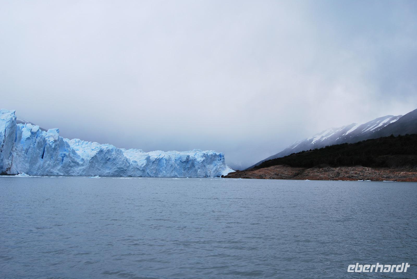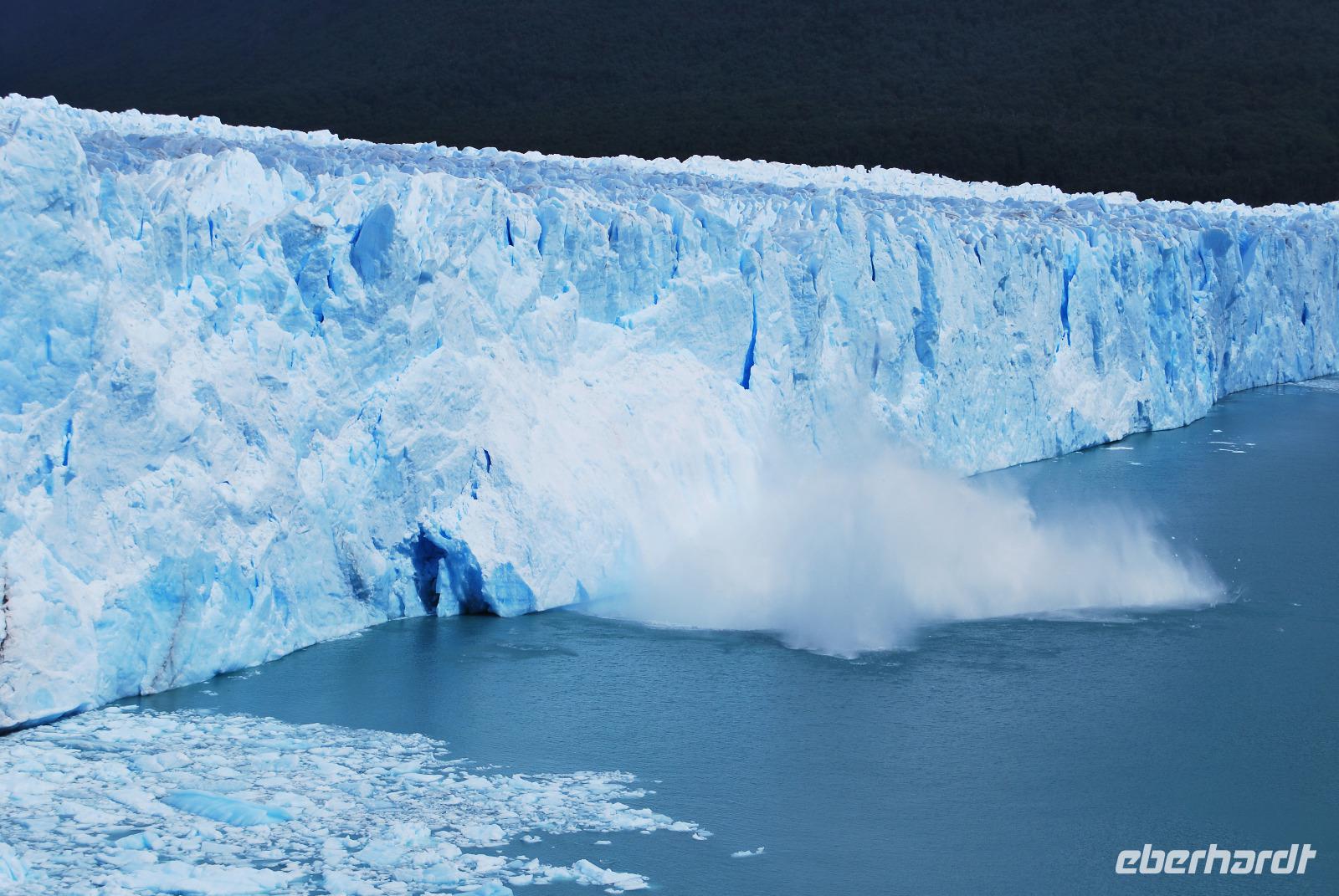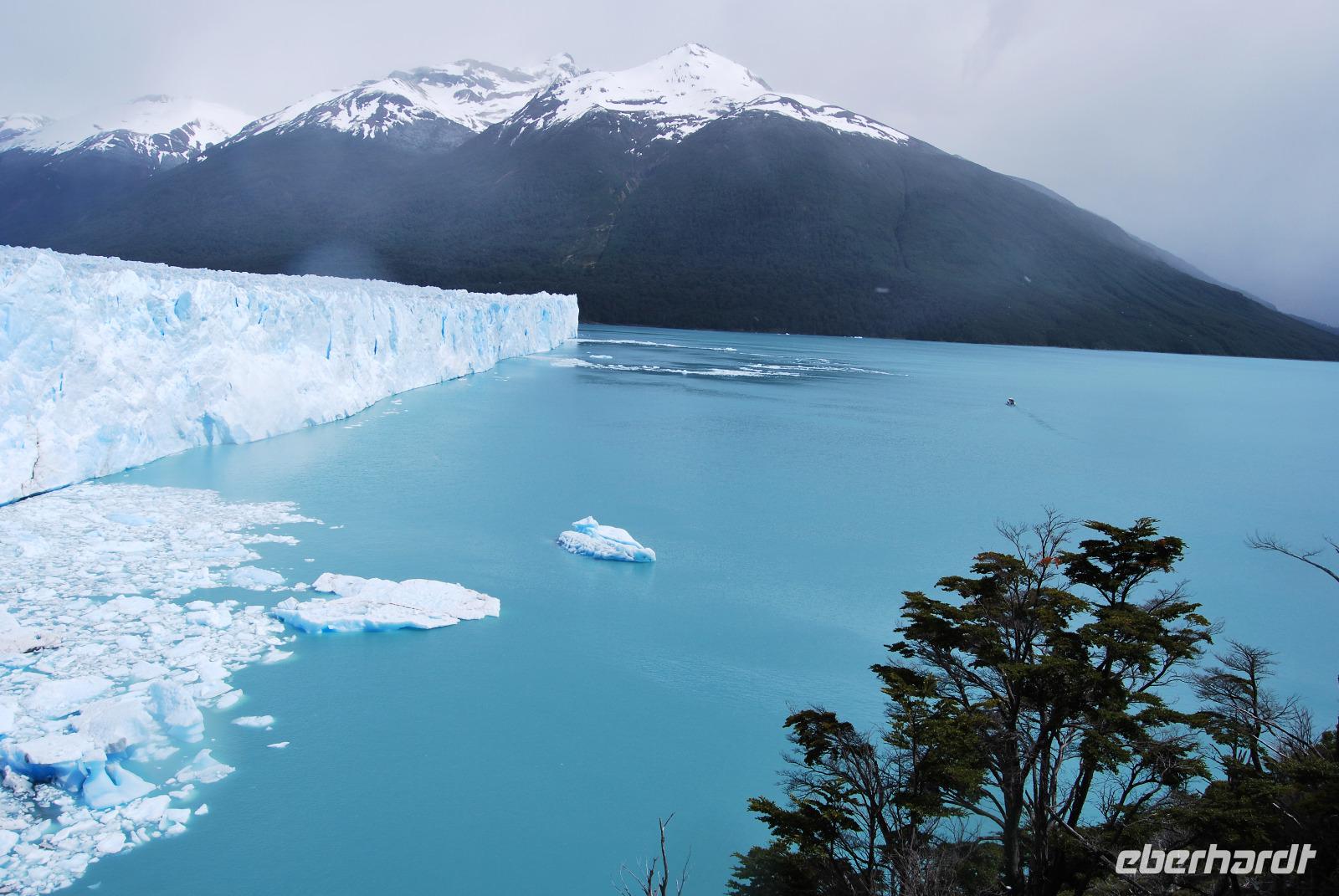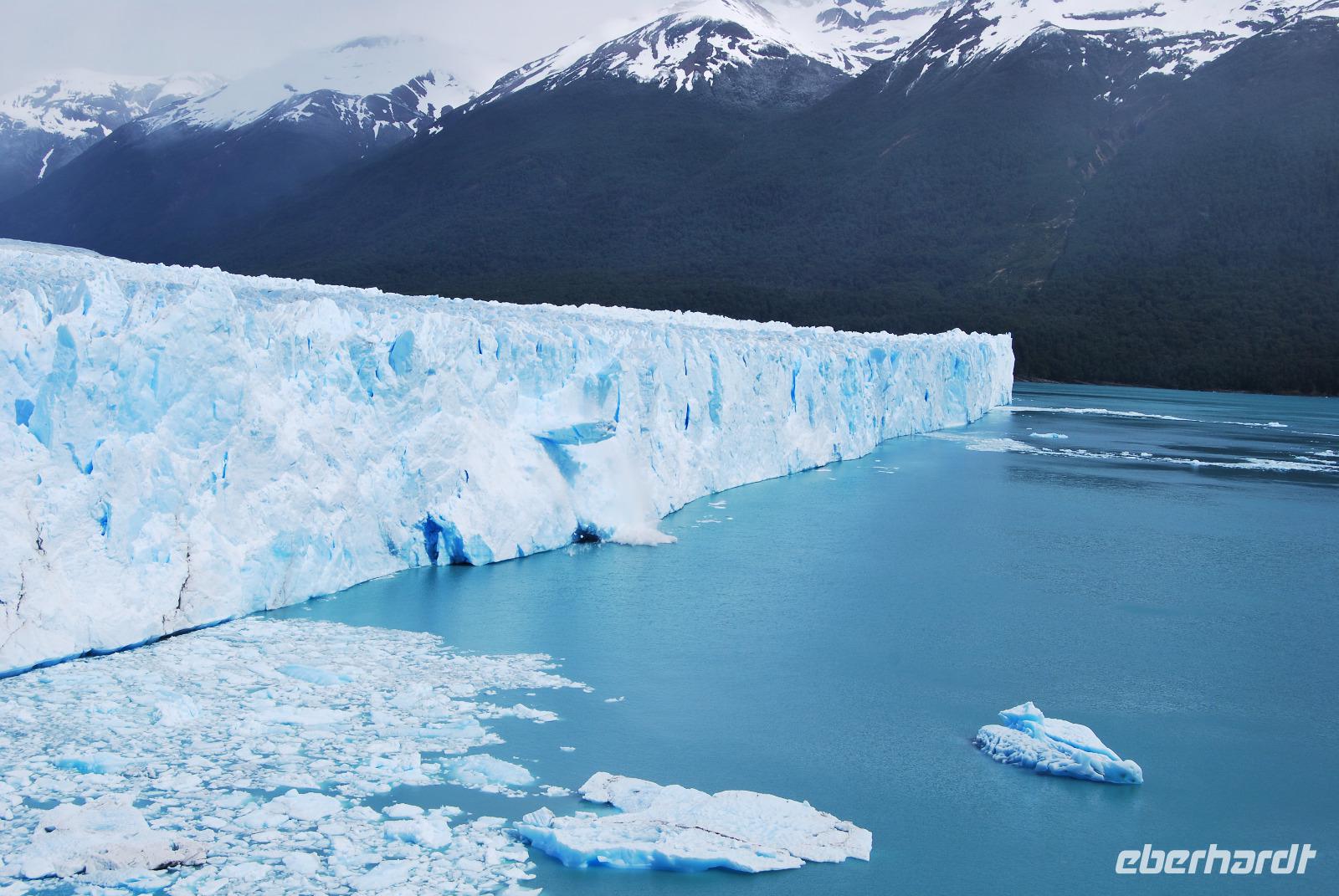 Wir gingen den Pfad entlang und da war er vor uns. Mit tief-blauen Spalten, kilometerlanges Eis - der Perito Moreno Gletscher. Wir betrachteten in aller Ruhe die eindrucksvolle Nordseite des Gletschers. Ab und zu hörte man wie sich der Gletscher bewegt. Ein lauter, dumpfer Knall schallte durch die Luft. Dann durften wir noch dabei sein, als der Gletscher kalbte. Ein Stück von der Wand brach ab, es knallte! Sekunden später schwappte eine Welle über den See und brachte alle ruhenden Eisberge in Wallung. Der Bus sammelte uns wieder ein und brachte uns zum Restaurant. Wir nahmen dort eine Kleinigkeit zu uns - natürlich mit Blick auf das Eis. Die nächste Station hieß Bootsanleger. Mit einem Katamaran begaben wir uns zur einstündigen Gletscher-Expedition und betrachteten den südlichen Teil des Perito Moreno Gletschers vom Wasser aus. Die Matrosen waren so gütig und fischten für uns ein Stück des tausendjährigen Eises aus dem Wasser. Mit diesem absolut reinen Eis konnten wir hervorragend unseren Whiskey kühlen, den wir zufällig mit an Bord hatten...