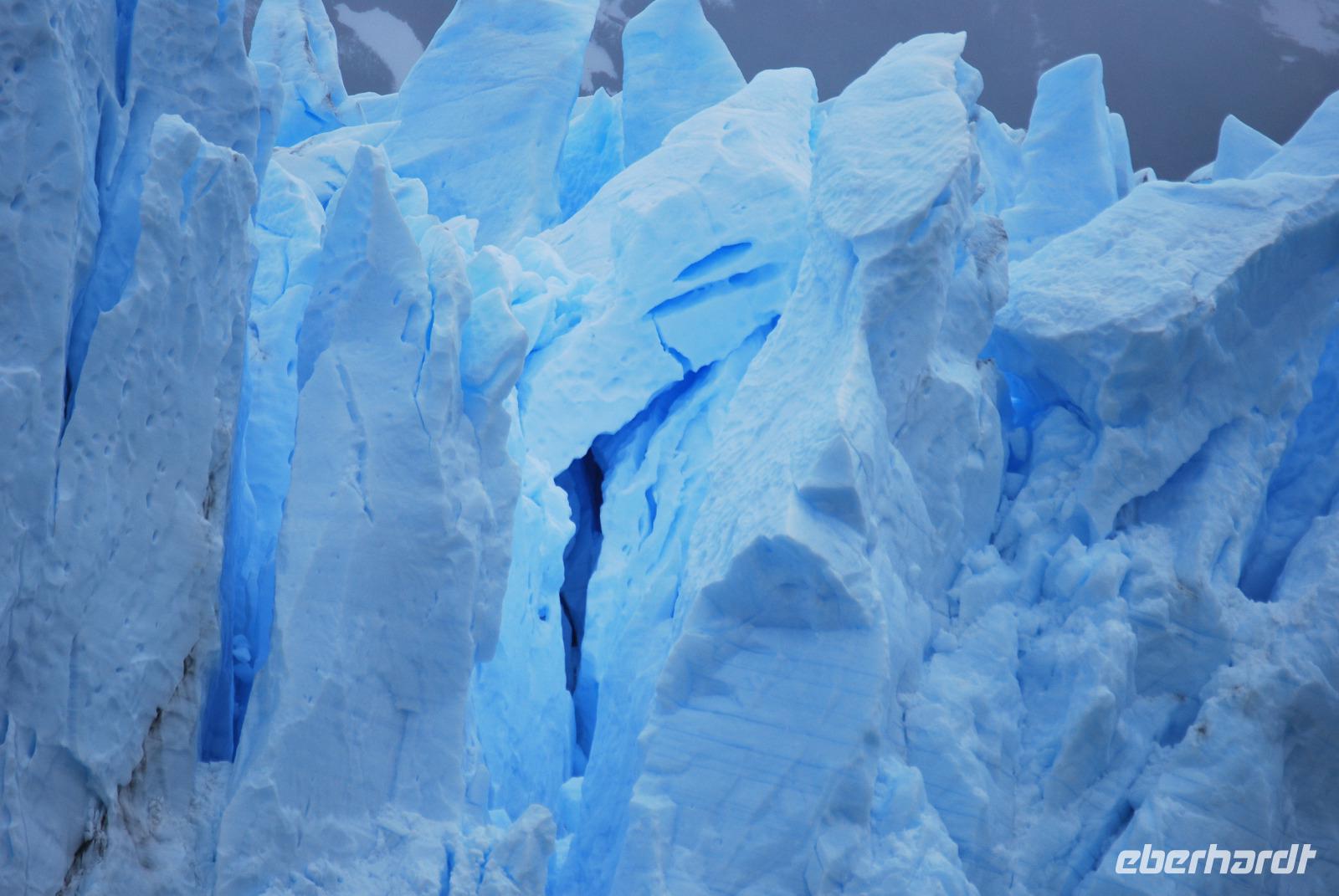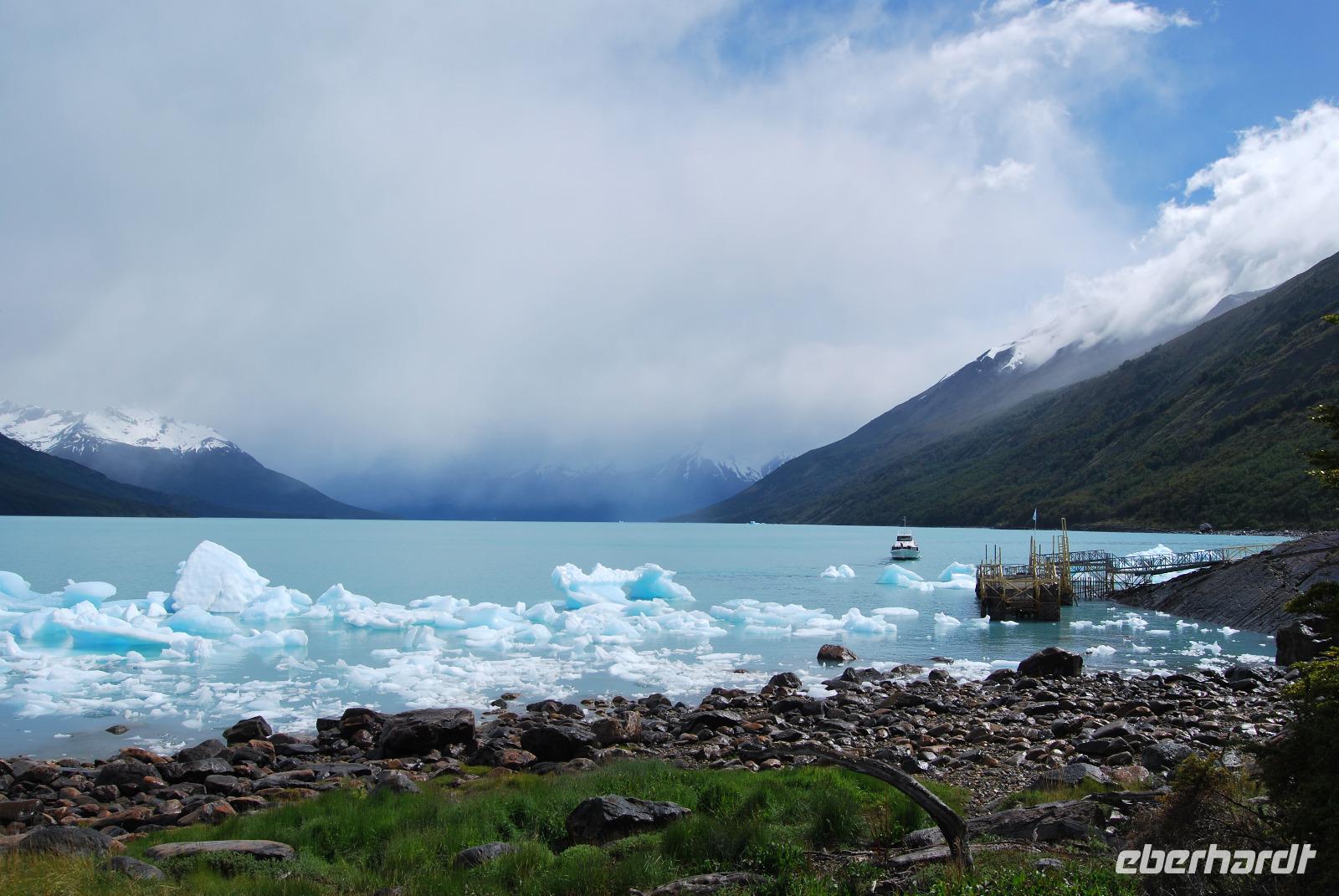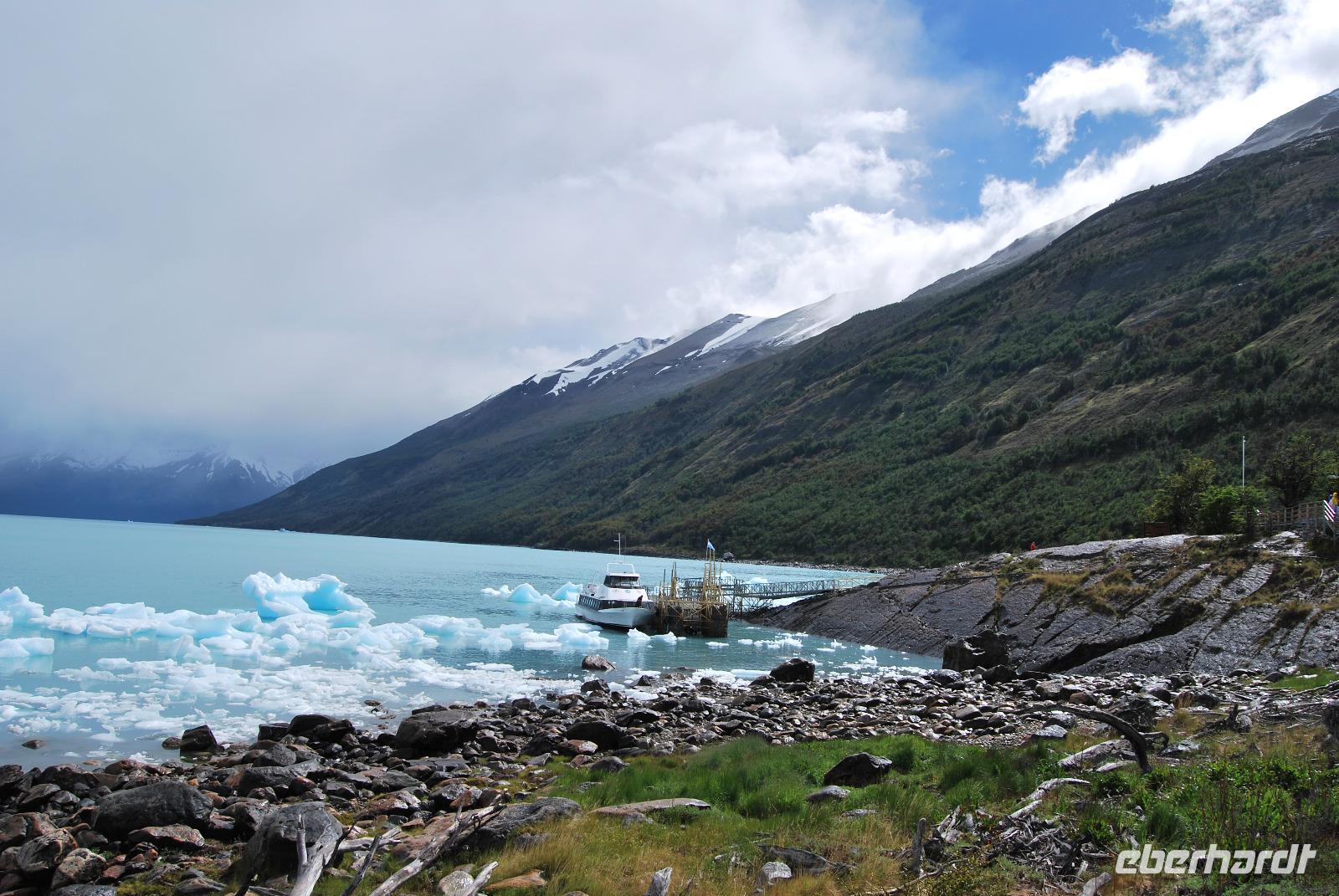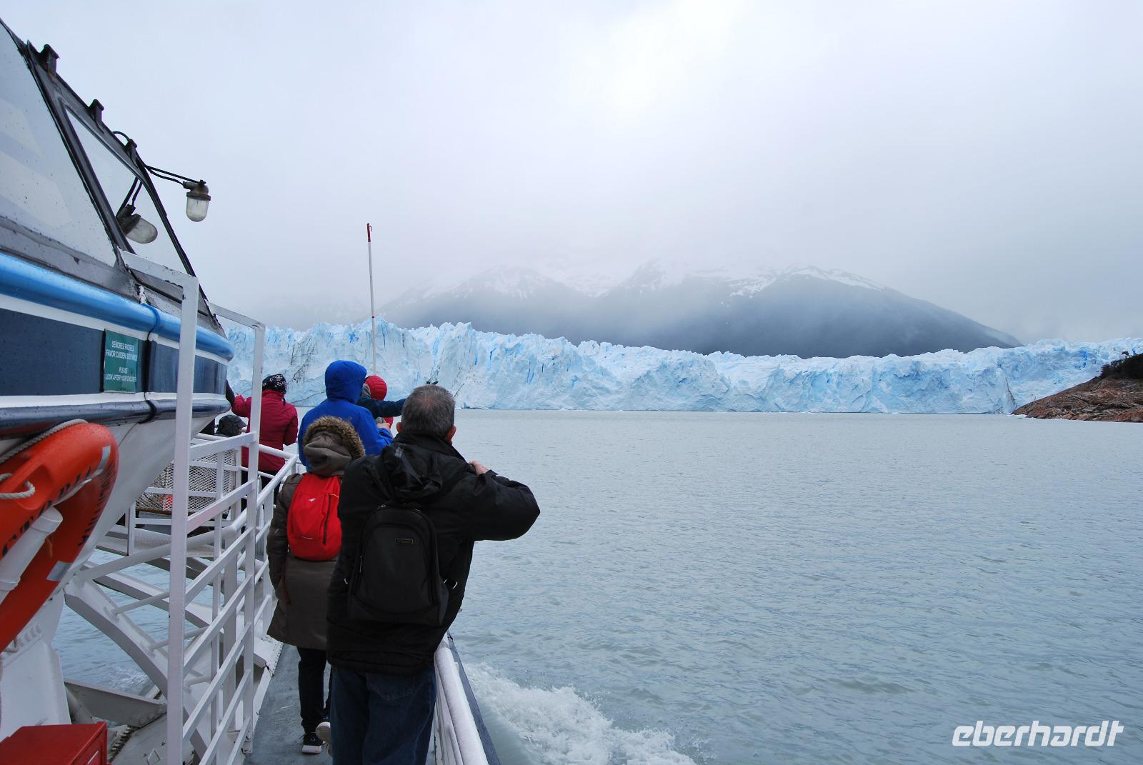 Wir gingen den Pfad entlang und da war er vor uns. Mit tief-blauen Spalten, kilometerlanges Eis - der Perito Moreno Gletscher. Wir betrachteten in aller Ruhe die eindrucksvolle Nordseite des Gletschers. Ab und zu hörte man wie sich der Gletscher bewegt. Ein lauter, dumpfer Knall schallte durch die Luft. Dann durften wir noch dabei sein, als der Gletscher kalbte. Ein Stück von der Wand brach ab, es knallte! Sekunden später schwappte eine Welle über den See und brachte alle ruhenden Eisberge in Wallung. Der Bus sammelte uns wieder ein und brachte uns zum Restaurant. Wir nahmen dort eine Kleinigkeit zu uns - natürlich mit Blick auf das Eis. Die nächste Station hieß Bootsanleger. Mit einem Katamaran begaben wir uns zur einstündigen Gletscher-Expedition und betrachteten den südlichen Teil des Perito Moreno Gletschers vom Wasser aus. Die Matrosen waren so gütig und fischten für uns ein Stück des tausendjährigen Eises aus dem Wasser. Mit diesem absolut reinen Eis konnten wir hervorragend unseren Whiskey kühlen, den wir zufällig mit an Bord hatten...