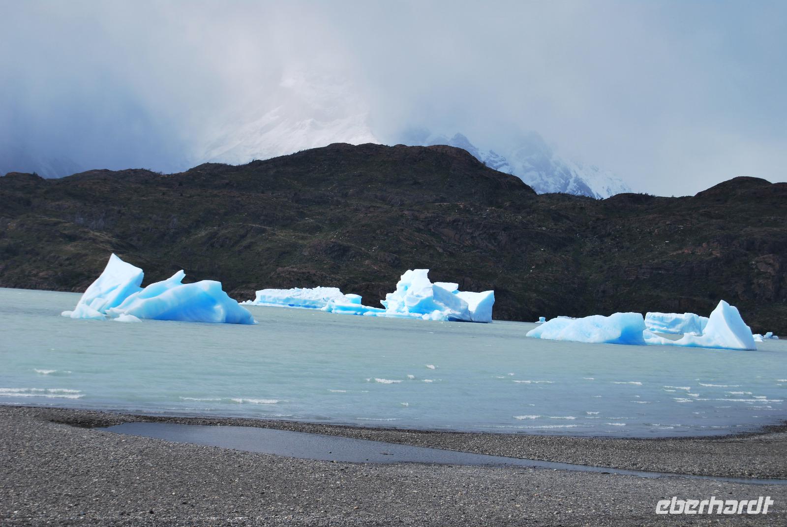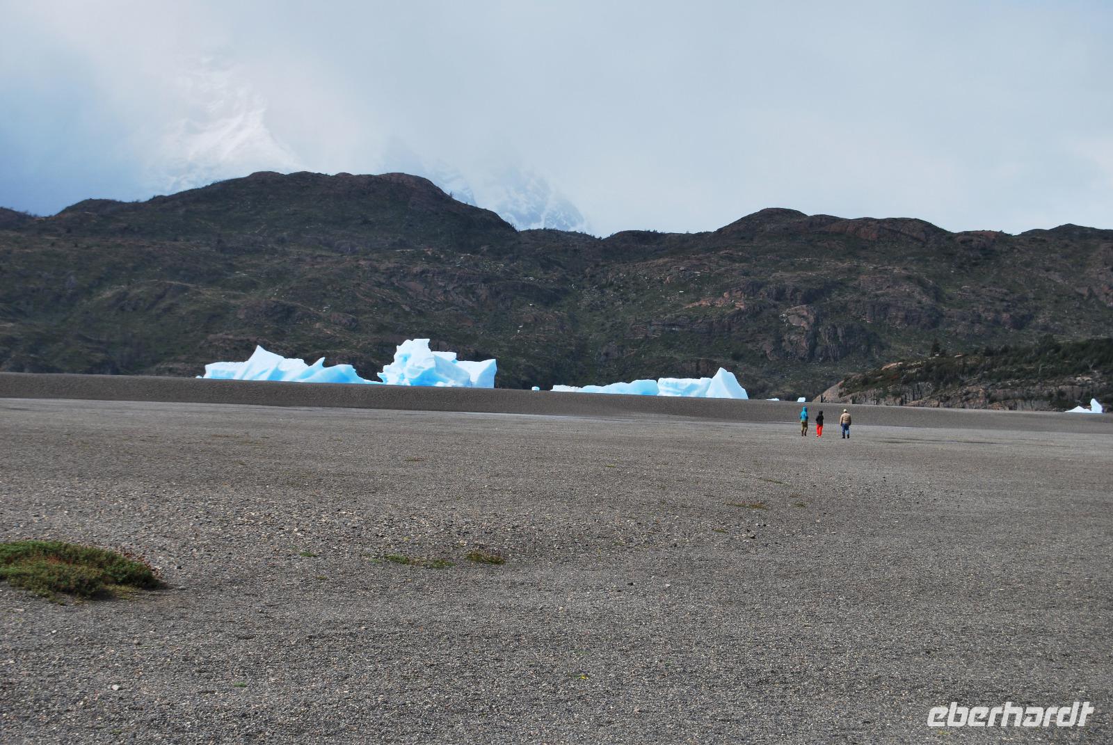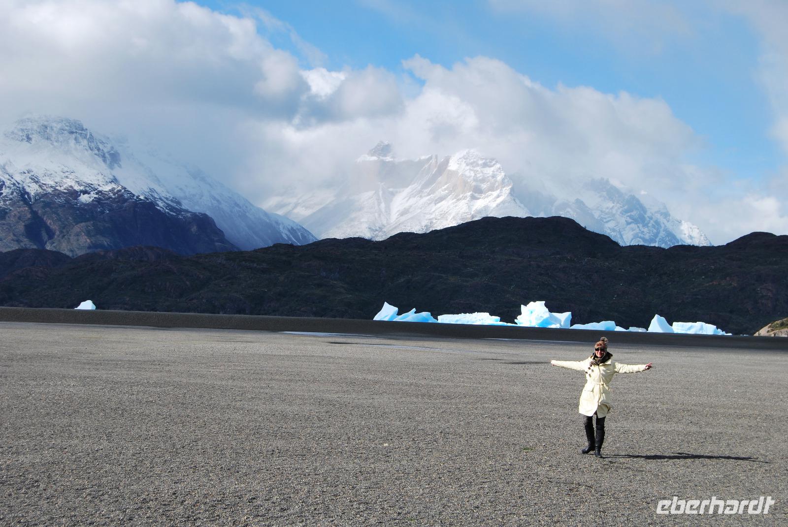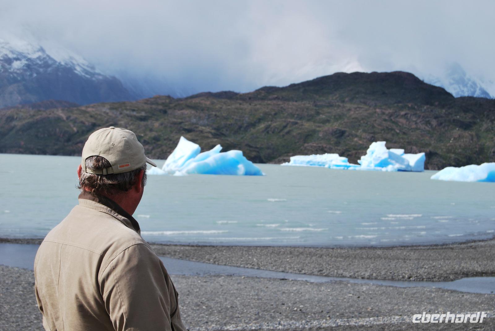 Zum Abschluss fuhren wir zum Grey Gletscher. Über eine Hängebrücke erreichen wir das angrenzende Waldstück und das Kiesbett des Largo Grey. Aus der Ferne schon können wir die riesigen, tiefblauen Eisberge sehen, die auf dem See treiben. Ein verblüffendes Naturschauspiel.