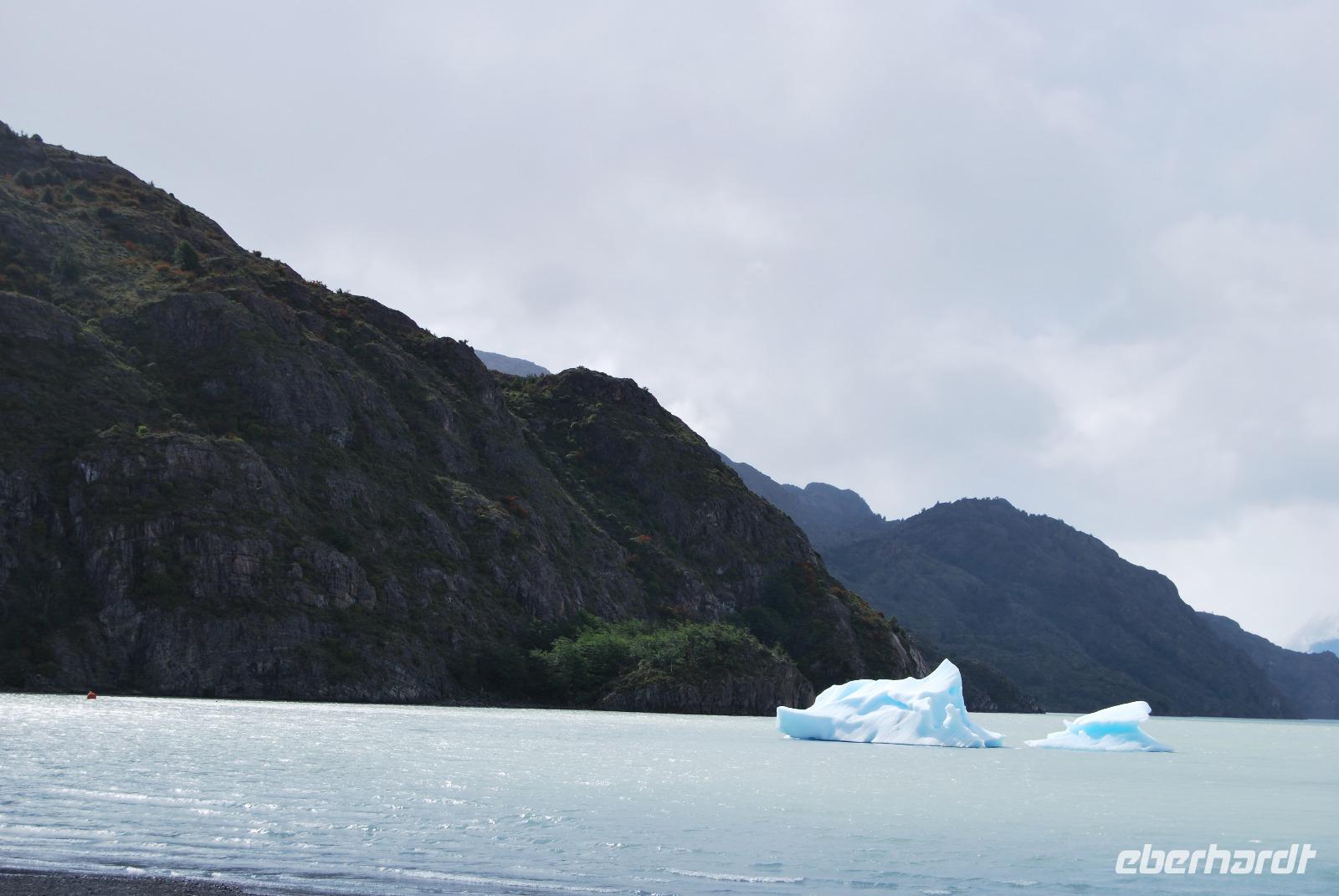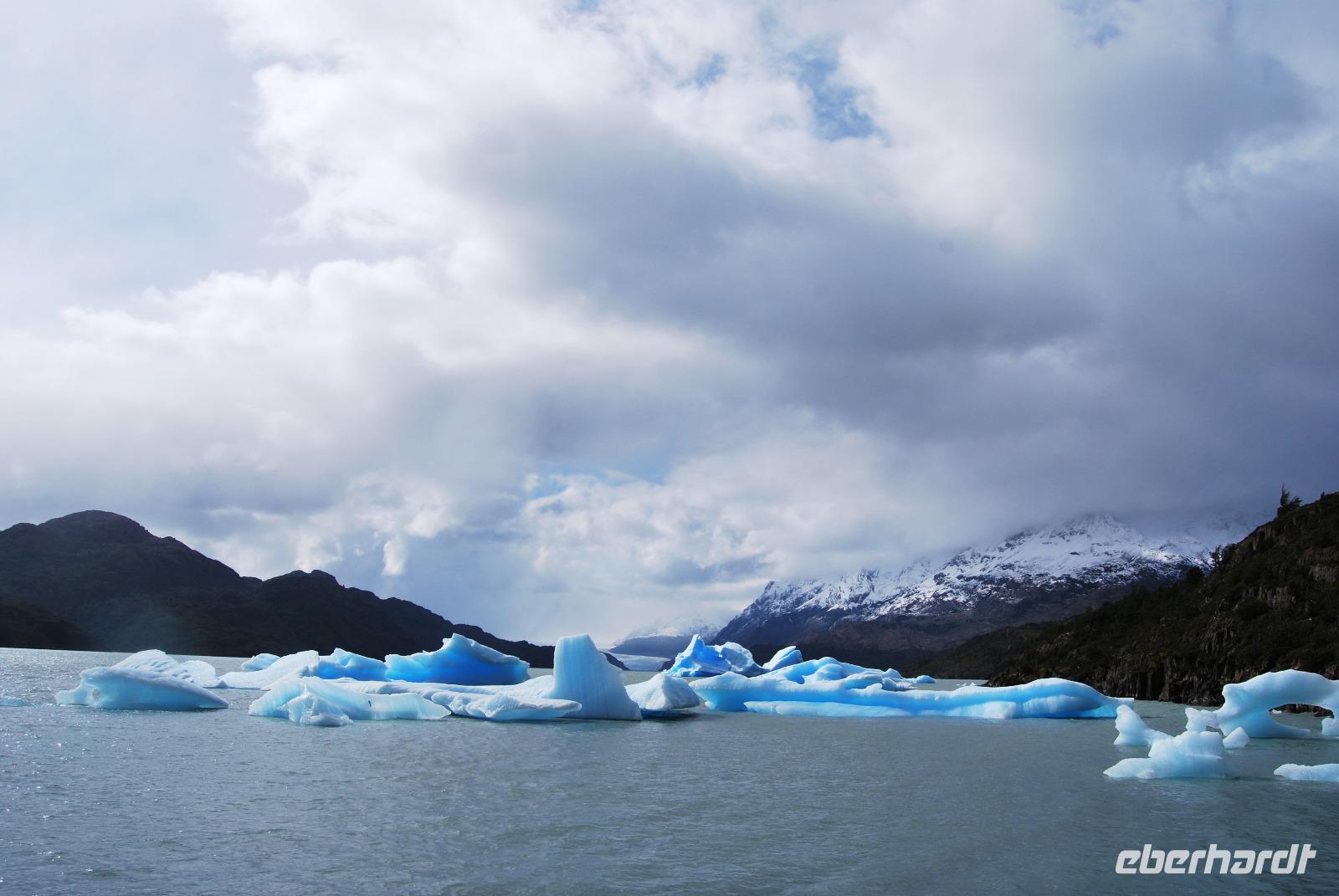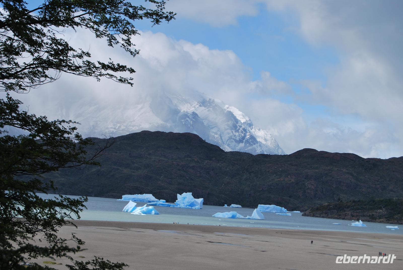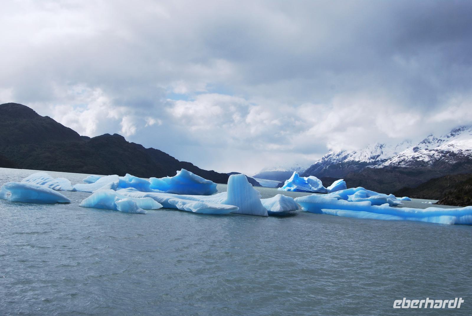 Zum Abschluss fuhren wir zum Grey Gletscher. Über eine Hängebrücke erreichen wir das angrenzende Waldstück und das Kiesbett des Largo Grey. Aus der Ferne schon können wir die riesigen, tiefblauen Eisberge sehen, die auf dem See treiben. Ein verblüffendes Naturschauspiel.