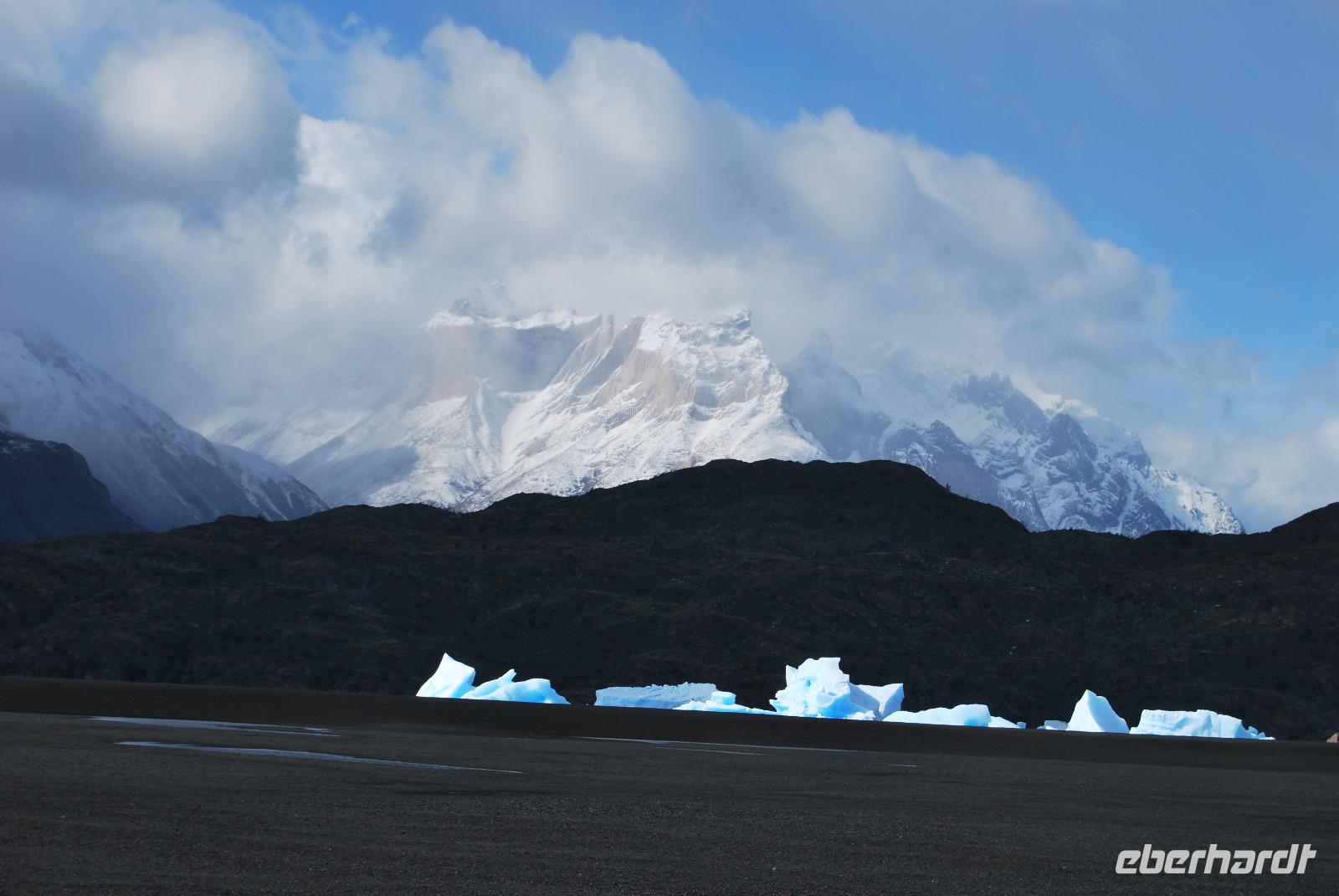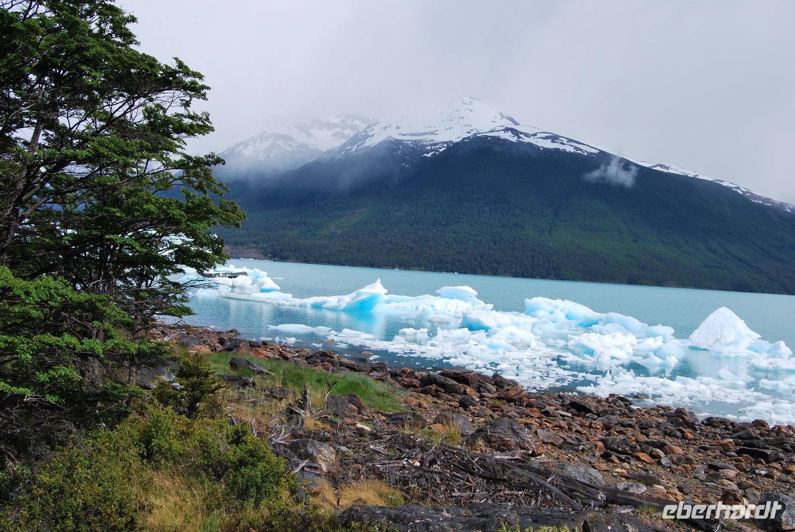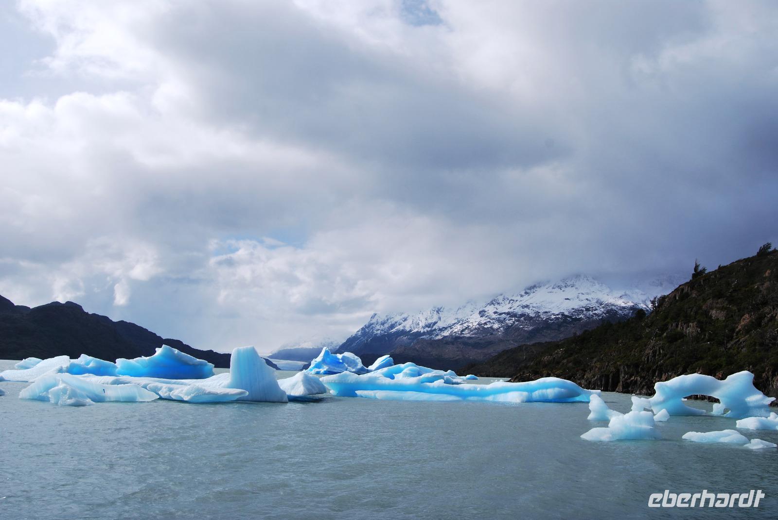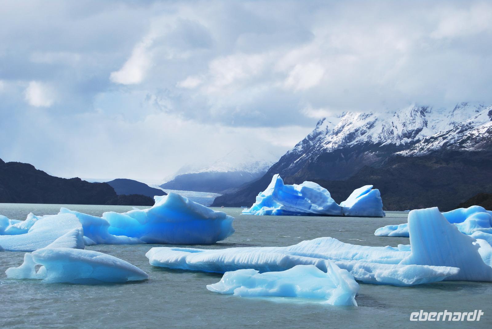Zum Abschluss fuhren wir zum Grey Gletscher. Über eine Hängebrücke erreichen wir das angrenzende Waldstück und das Kiesbett des Largo Grey. Aus der Ferne schon können wir die riesigen, tiefblauen Eisberge sehen, die auf dem See treiben. Ein verblüffendes Naturschauspiel.