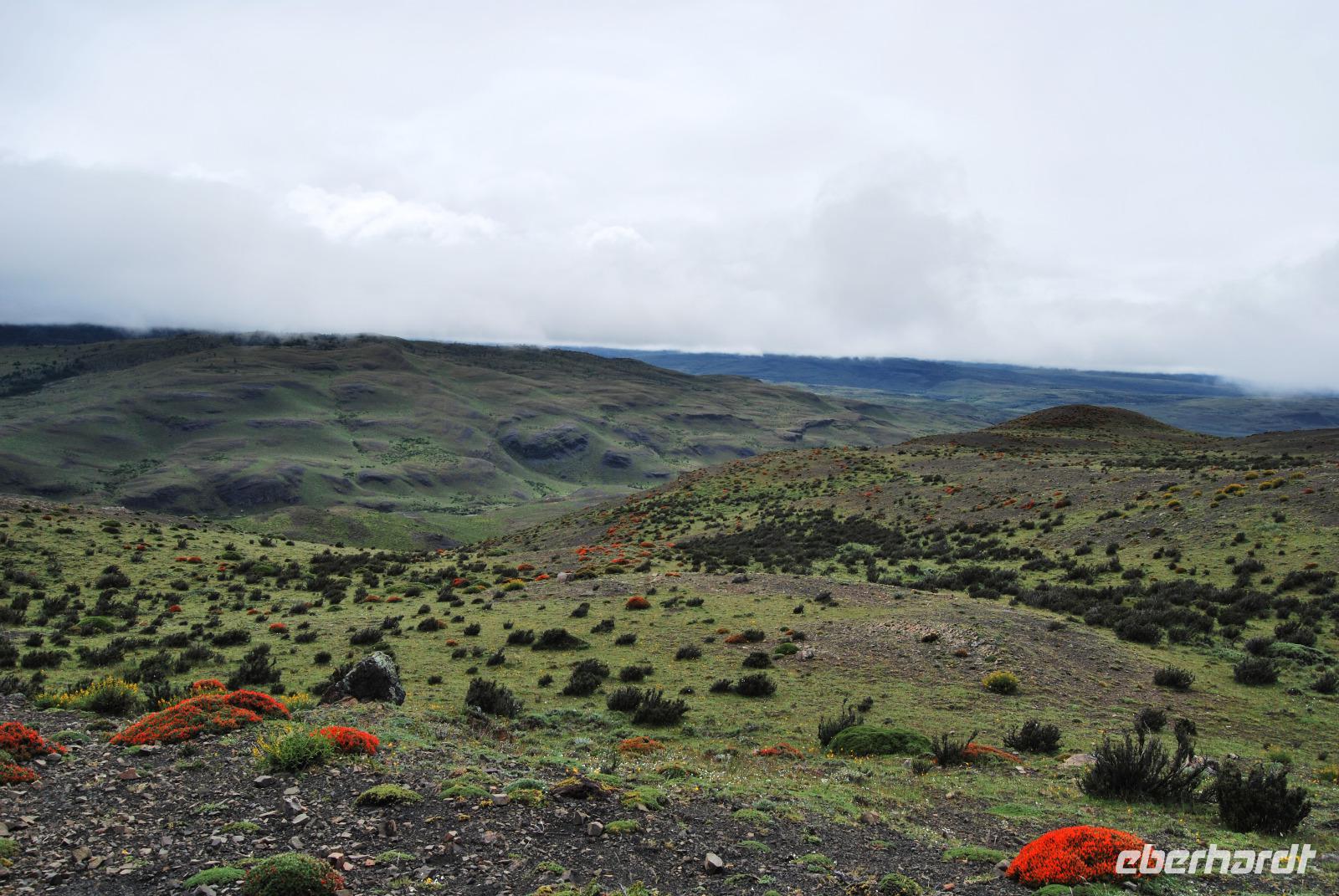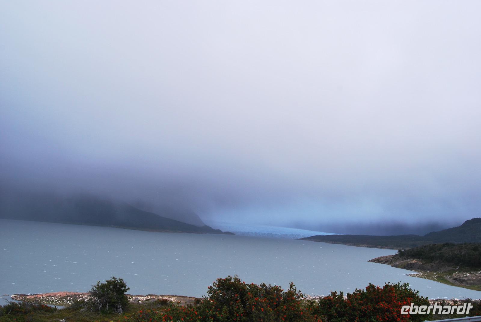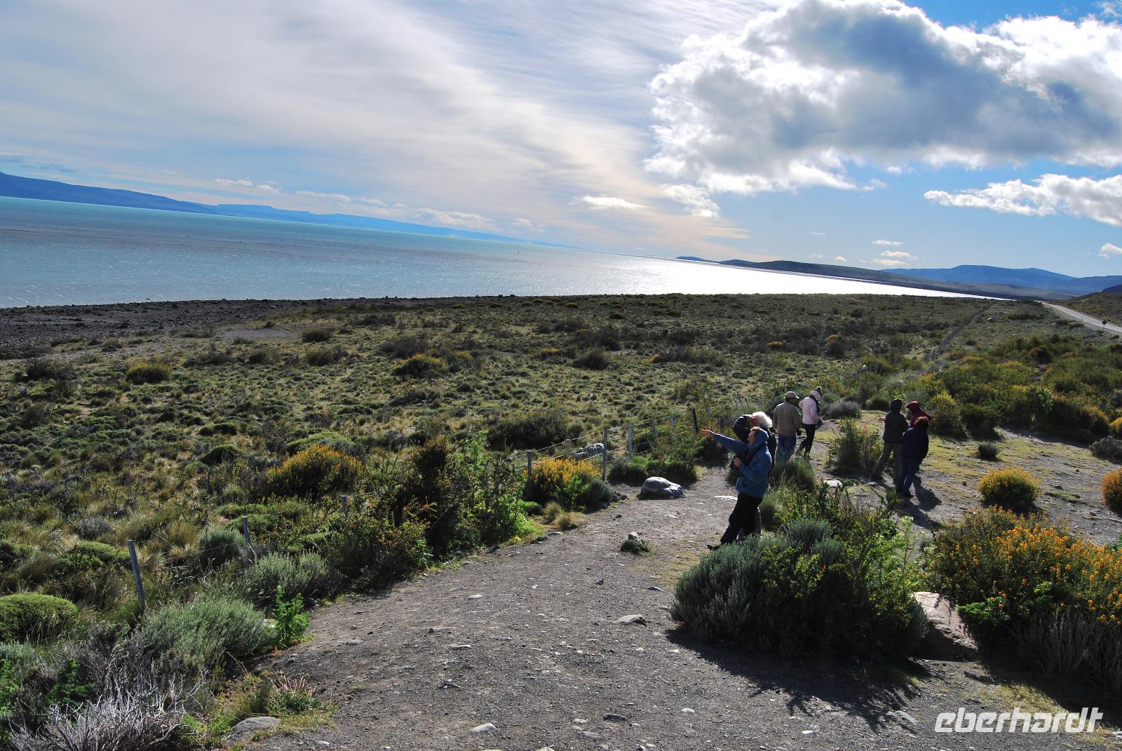 Um 8 Uhr holen uns Virginia und Fernando vom Hotel ab. Wir fahren eine Weile am Largo Argentinio entlang, wo auch die Stadt El Calafate daran grenzt. Der See ist der größte See Argentiniens und misst eine Fläche von rund 1.415 Quadratkilometern. Er wird von mehreren Gletschern gespeist, unter anderem vom größten Gletscher Südamerikas, dem Upsala-Gletscher. Hin und wieder machen wir einen Fotostopp - es ist aber äußerst windig, weshalb wir nie lange verweilen. Virginia erklärte uns ein paar Pflanzen. Noch vor dem Eintritt in den Nationalpark nahmen wir den Aussichtspunkt Mirador de los Suspiros mit. Grobübersetzt heißt das so viel wie Aussichtspunkt des Seufzen oder Staunens - doch wir konnten wirklich nur seufzen. Denn den Gletscher konnte man von hier kaum erkennen. Schnee, Regen und heftige Windböen peitschten uns ins Gesicht. Man musste sich gut festhalten um nicht davonzufliegen. Schnell waren wir wieder im Bus verschwunden.