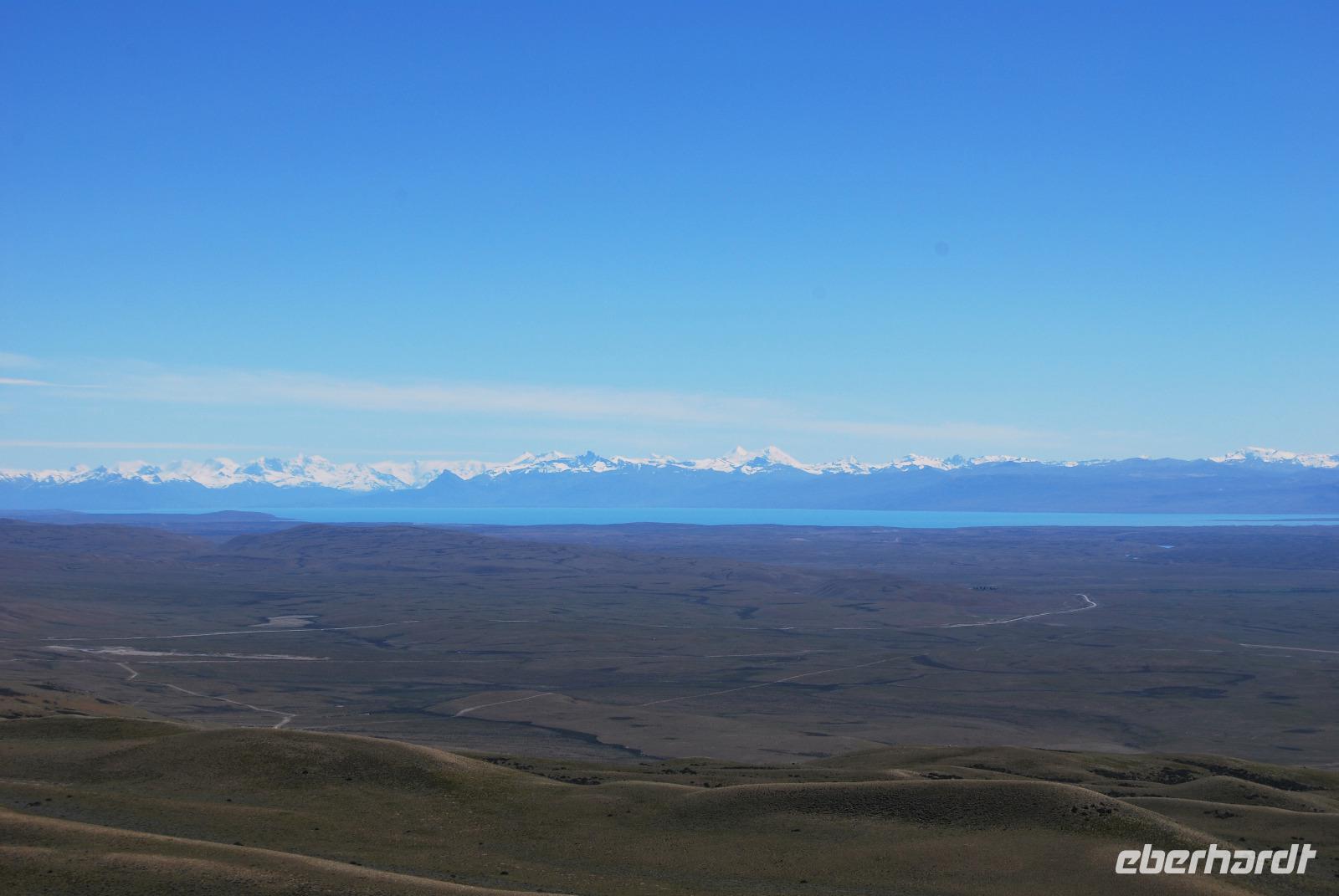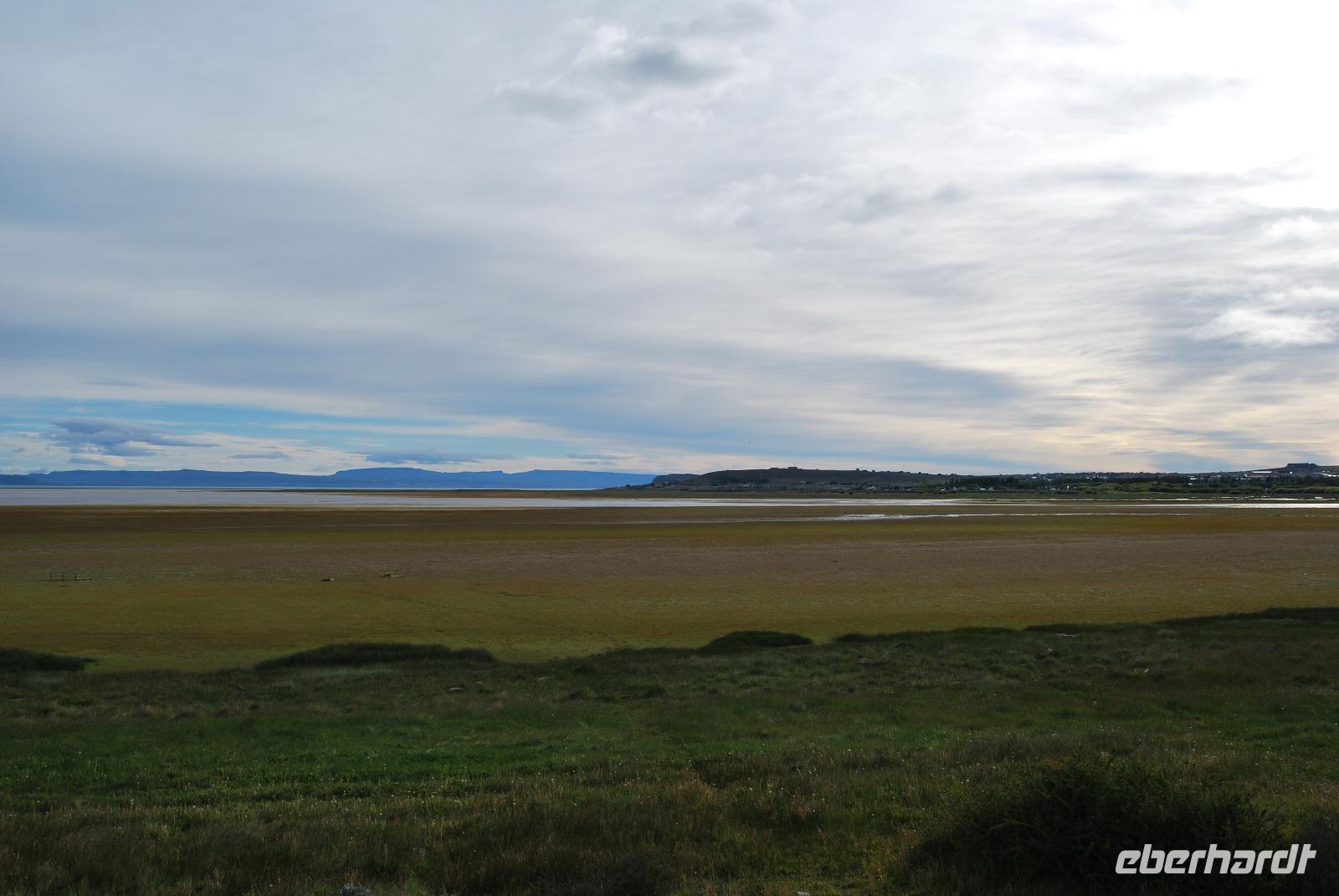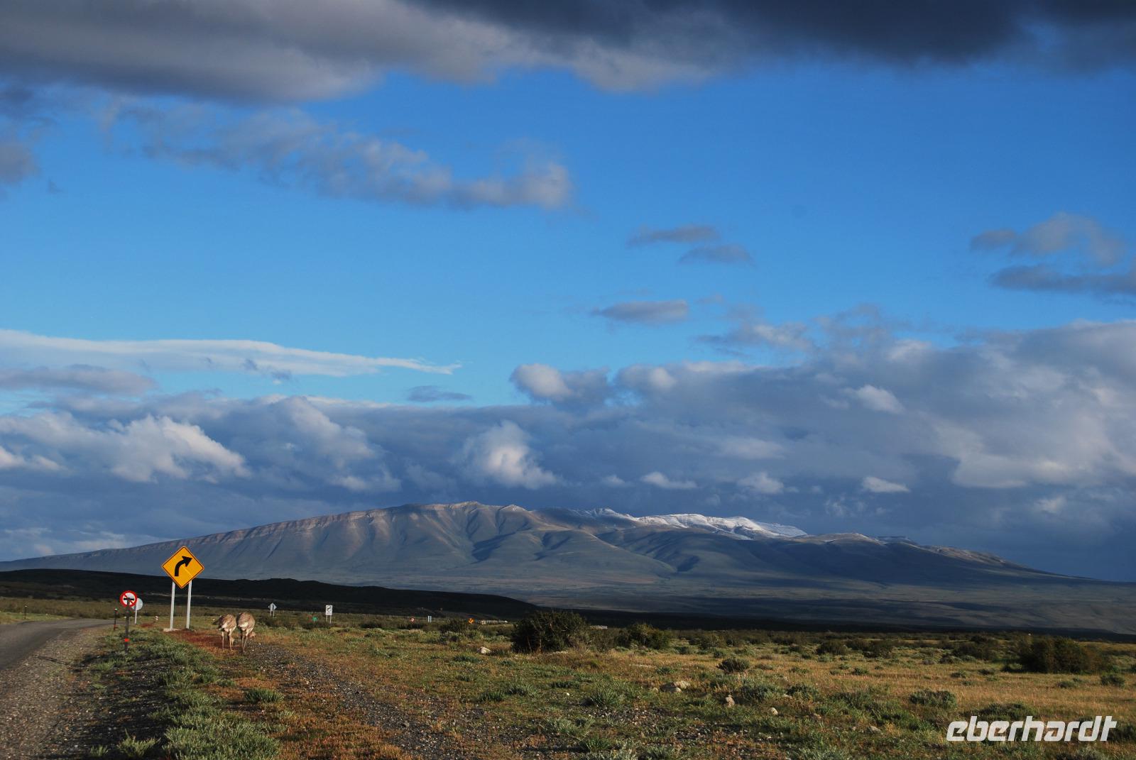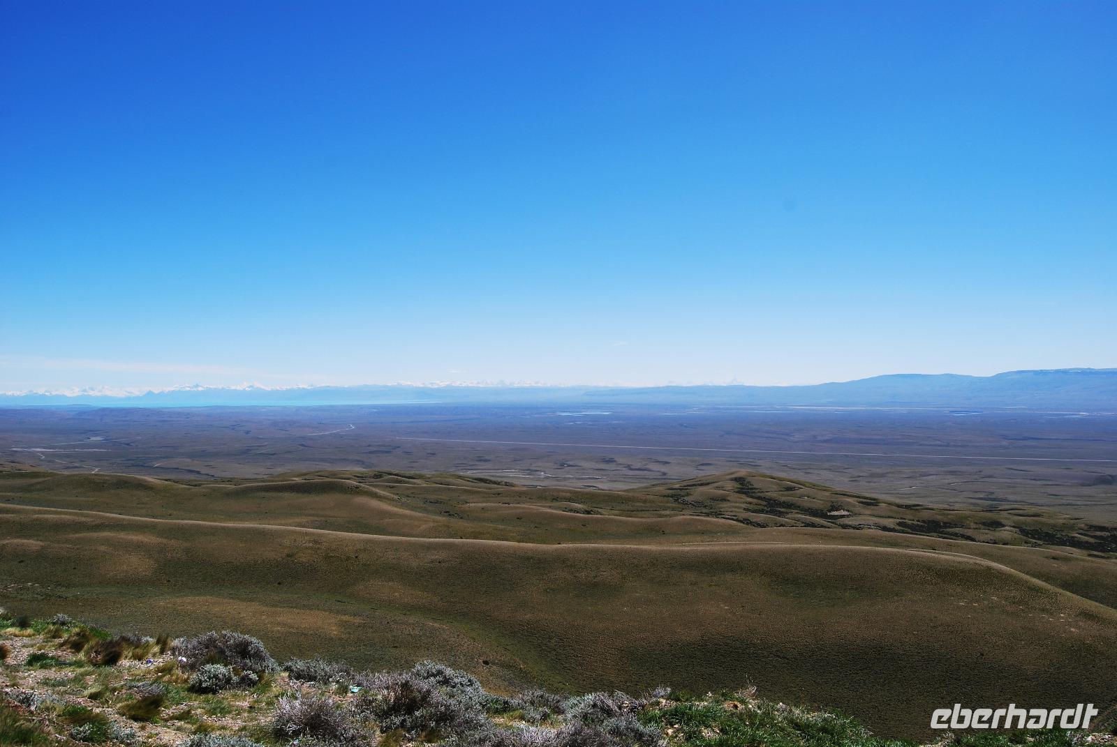 Für uns stand wieder viel Fahrerei auf dem Programm - rund 270 Kilometer bis nach El Calafate in der Provinz Santa Cruz, Argentinien. Wir brauchten gute eine Stunde bis zum Grenzübergang auf der chilenischen Seite. Dort angekommen konnten wir uns noch im gut beheizten Souvenir-Shop aufwärmen. Omar tankte den Wagen noch schnell und dann konnten wir schon passieren. Nahe der Grenze ein großes Aufgebot von Kondoren - ganze sieben Stück kreisten am Himmel. Die Nasen wurden wieder an die Fensterscheibe gedrückt... Ein paar Kilometer weiter dann die Argentinische Grenze. Eine simple Holzbaracke mit ein paar Pferdeweiden ringsherum und ein einfacher Feldweg erwartete uns. Wäre dort nicht eine Schranke und die im Wind wehende Fahne von Argentinien, würde man direkt vorbei fahren. Die Bürokratie und strenge Kontrolleure ließen uns ein wenig warten. Dann ging es aber weiter. Über die große Ebene - die Pampa, meist war die Straße flach und gerade, konnten wir zusehen wie die Gipfel des Nationalparks immer kleiner wurden.